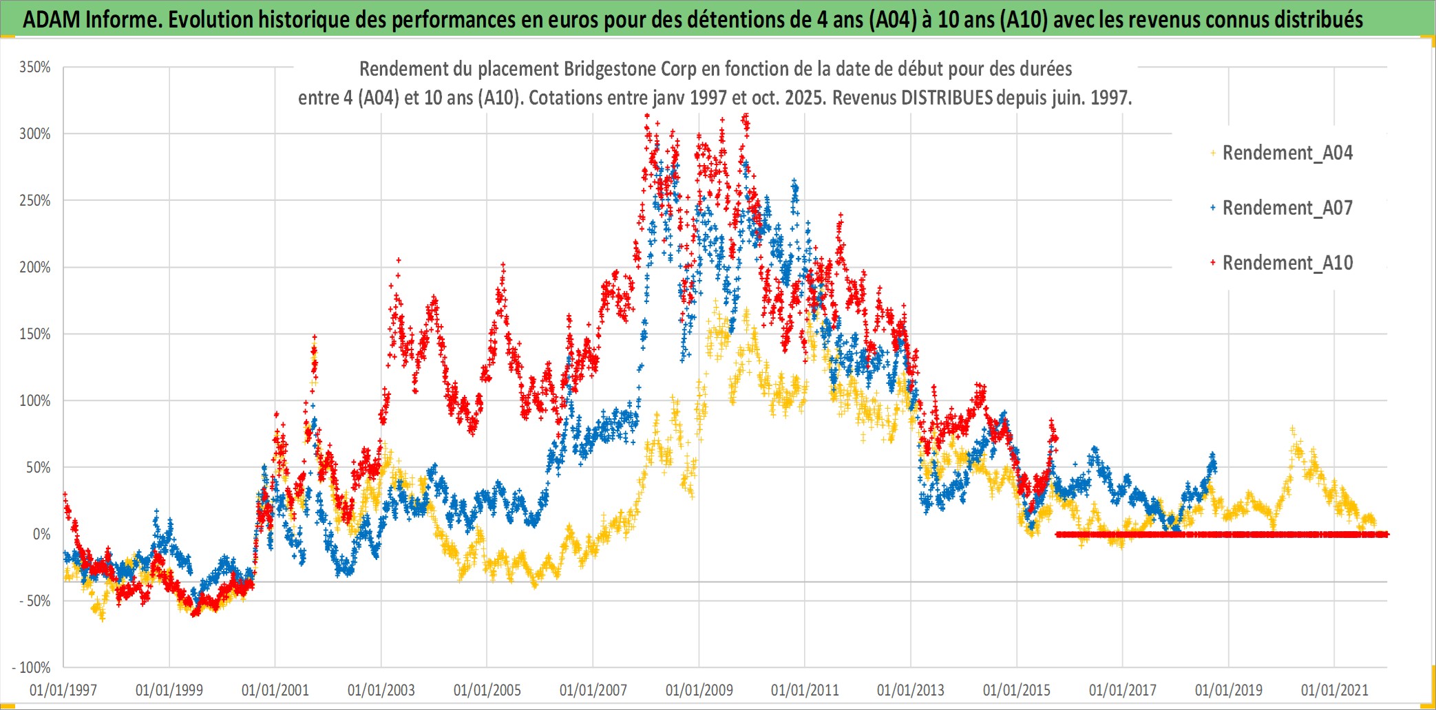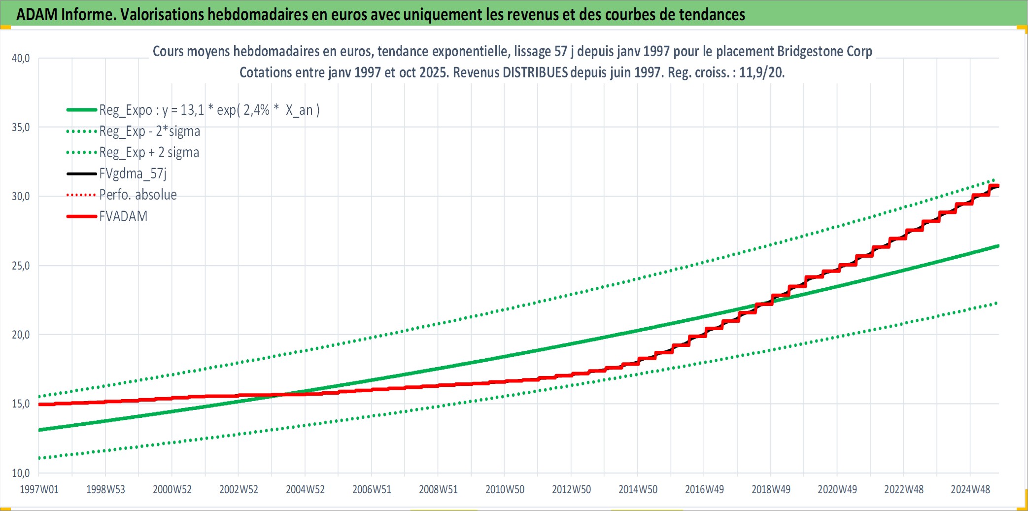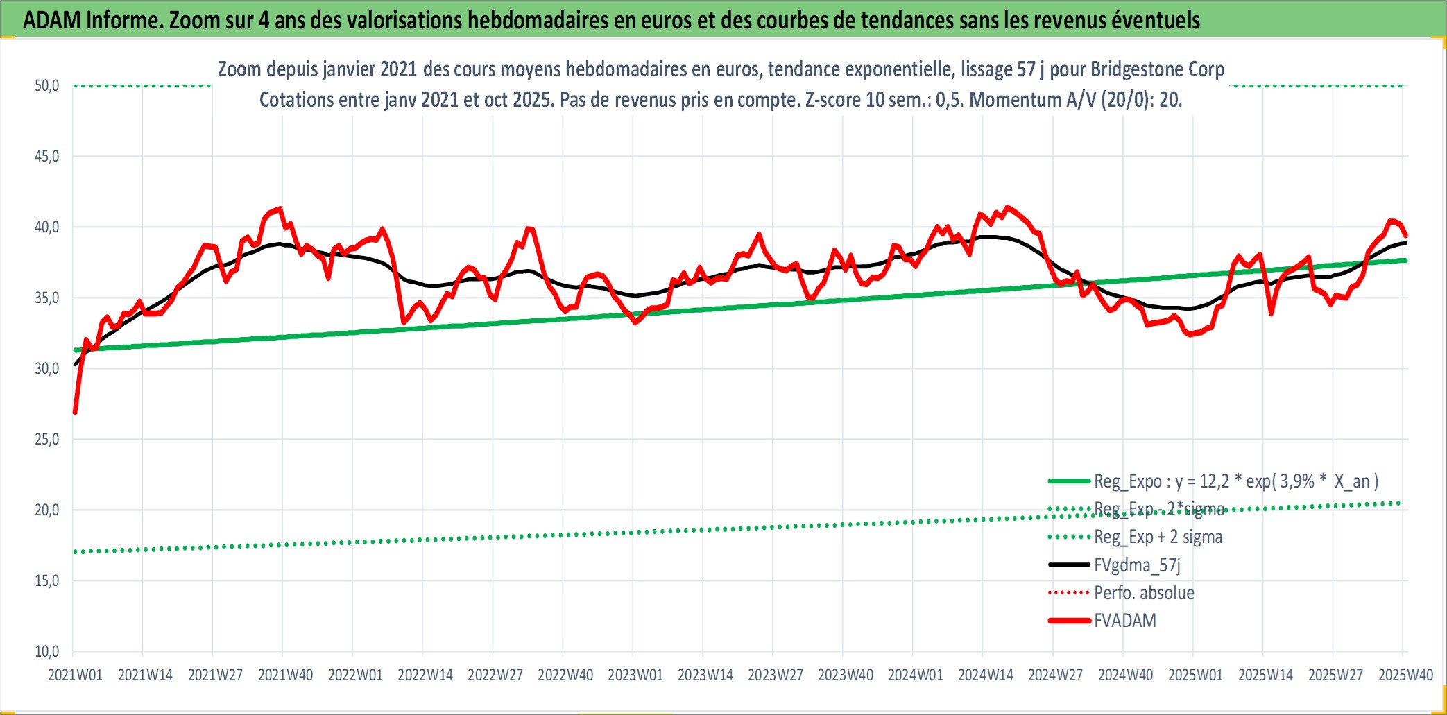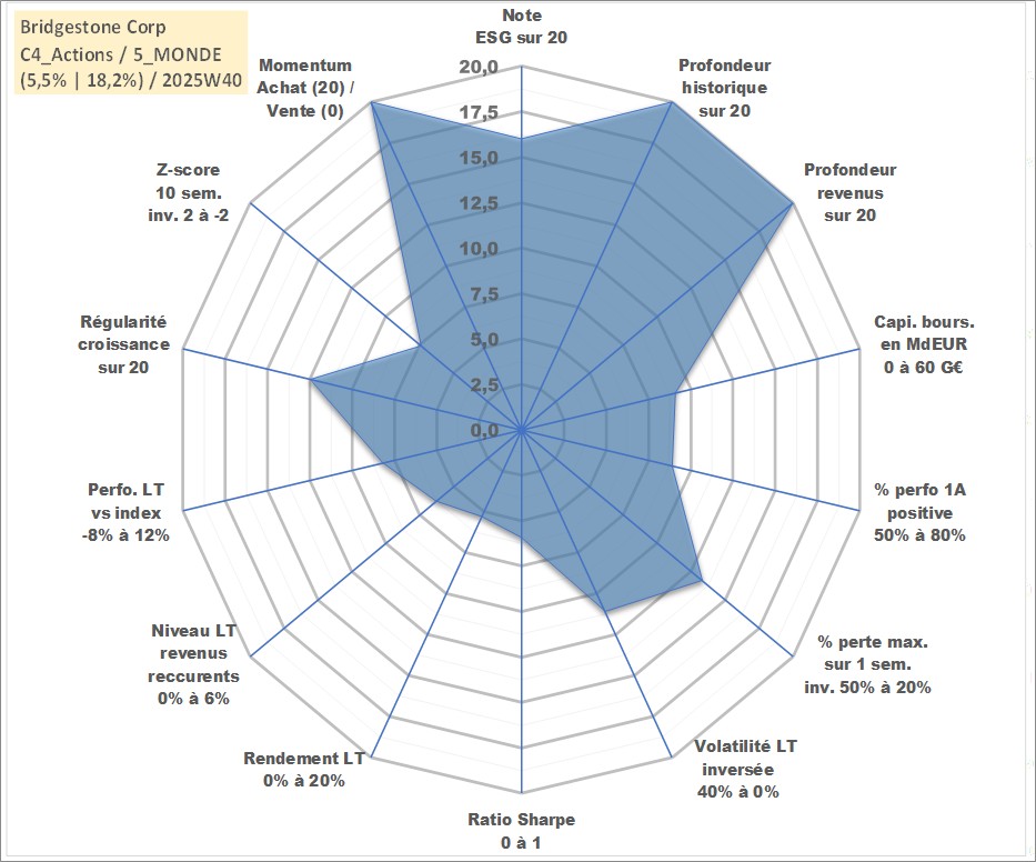 Site dédié aux investisseursPage dédiée sur site financeAnalyse des valorisations hebdomadaires de l'action Bridgestone Corp. Cet actif est cote en JPY. Les valorisations sont en contrevaleur EURO et couvrent les semaines 1997W01 a 2025W40. Les revenus de cet actif financier sont pris en compte depuis la semaine 1997W26. La note globale ESG de cet actif est estimee a 16.0 (apres rebasage entre 0 et 20).