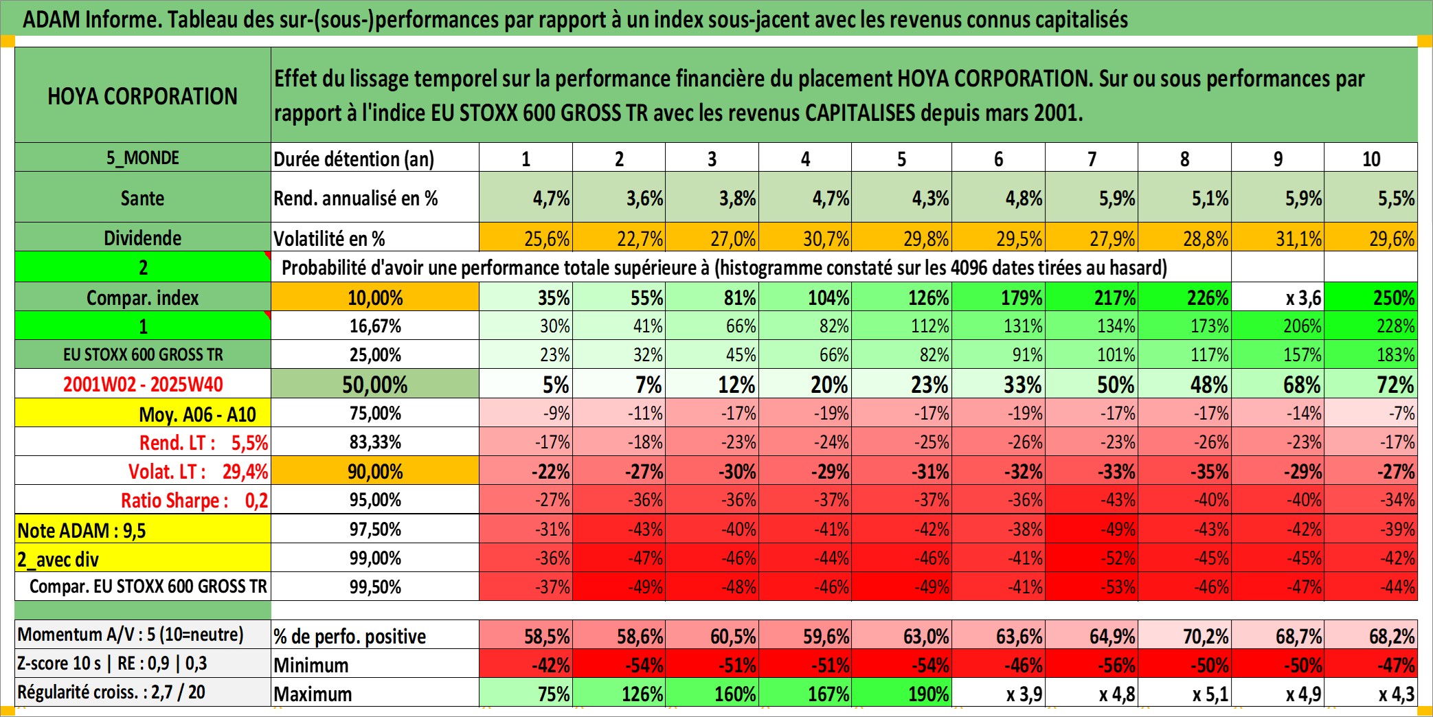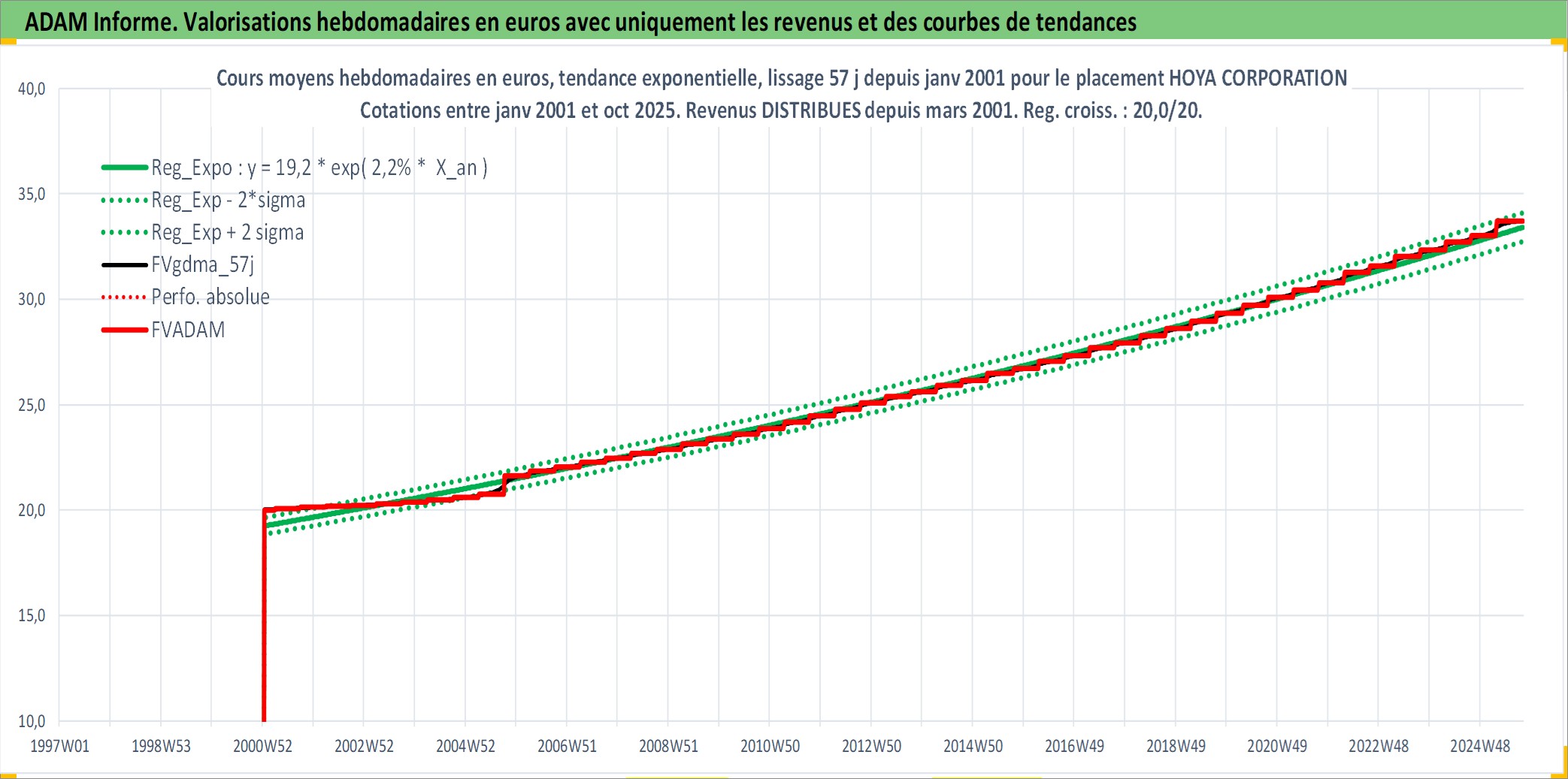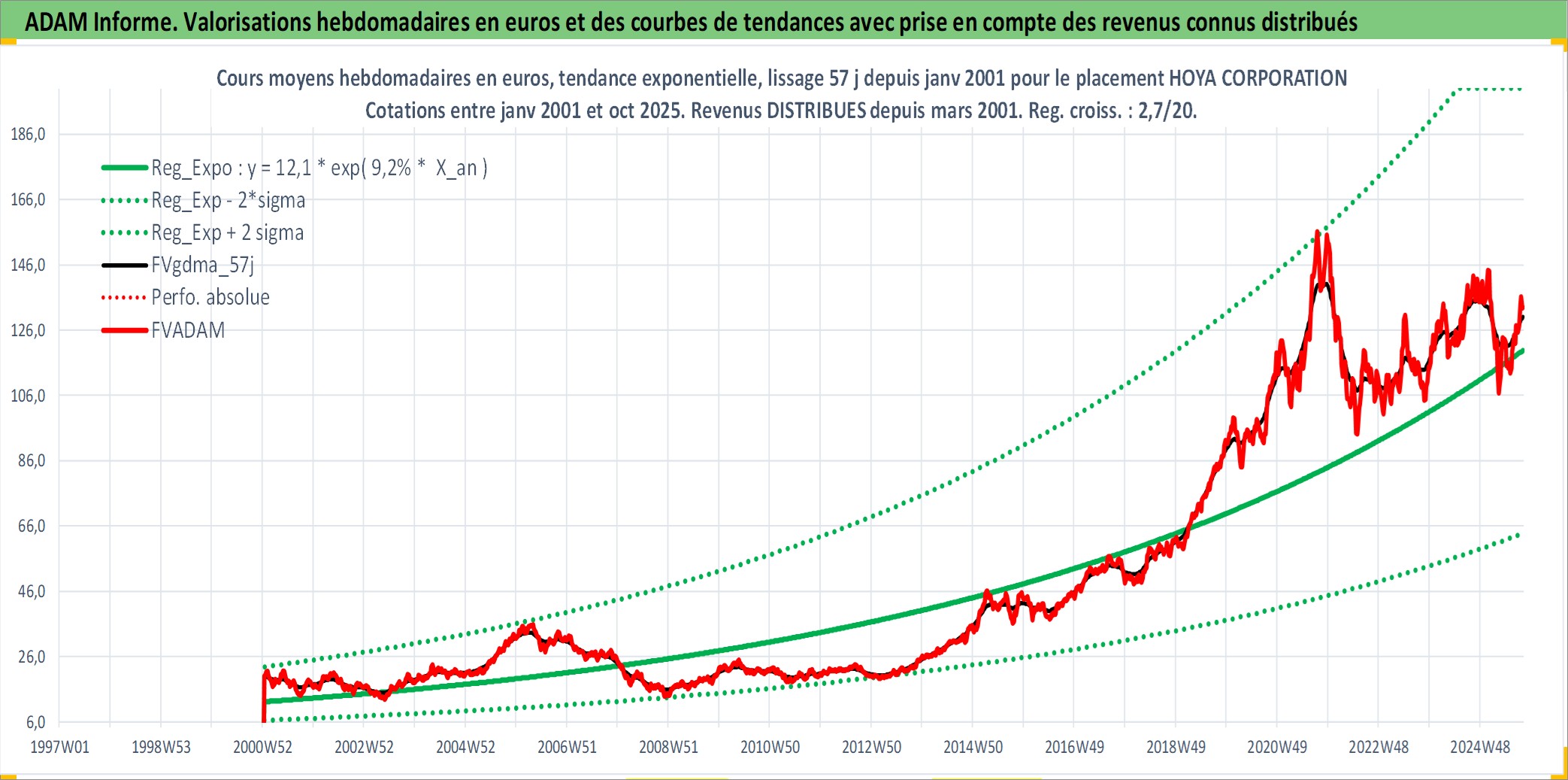 Site dédié aux investisseursPage dédiée sur site financeAnalyse des valorisations hebdomadaires de l'action HOYA CORPORATION. Cet actif est cote en JPY. Les valorisations sont en contrevaleur EURO et couvrent les semaines 2001W02 a 2025W40. Les revenus de cet actif financier sont pris en compte depuis la semaine 2001W13. La note globale ESG de cet actif est estimee a 11.0 (apres rebasage entre 0 et 20).