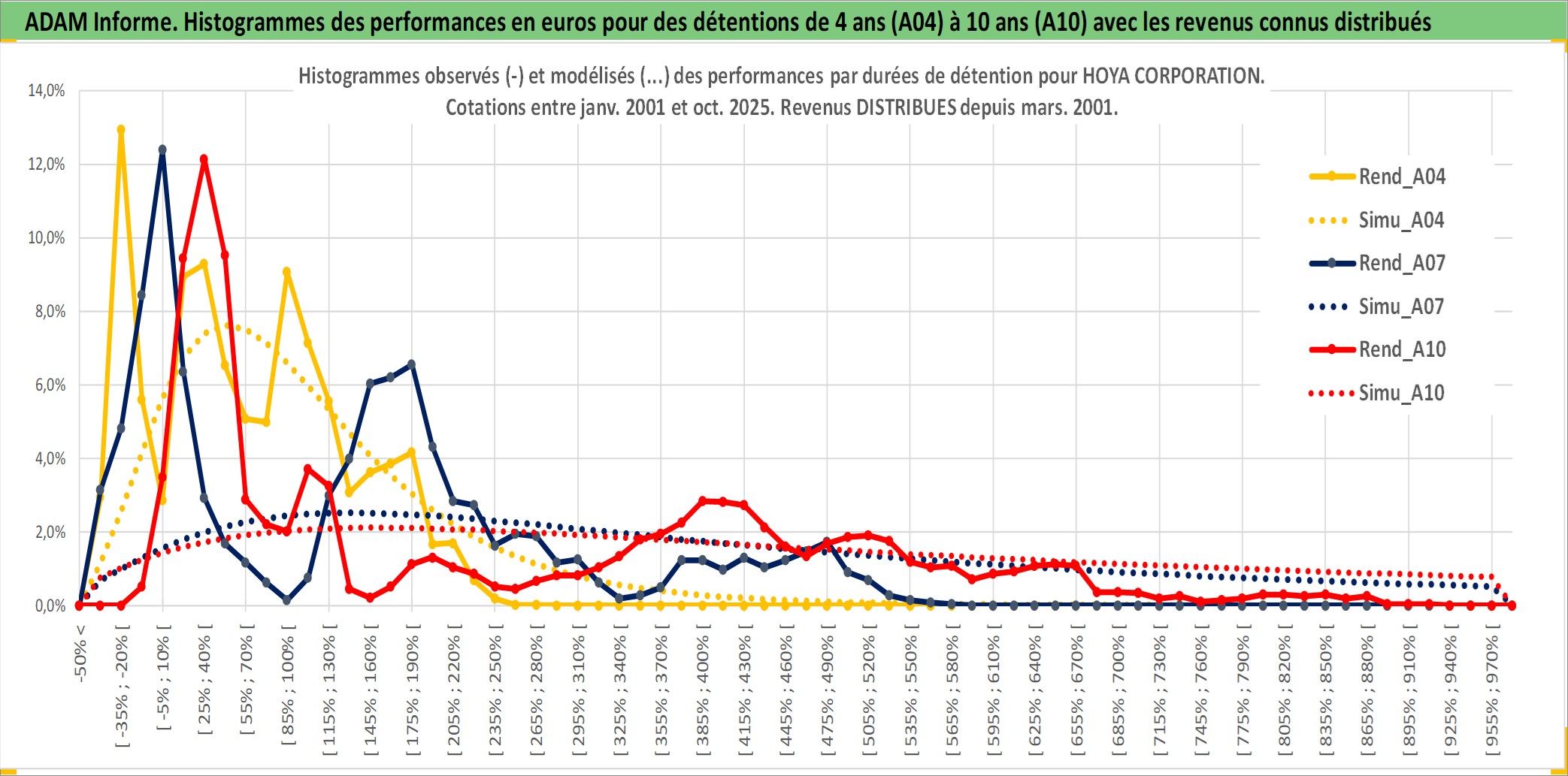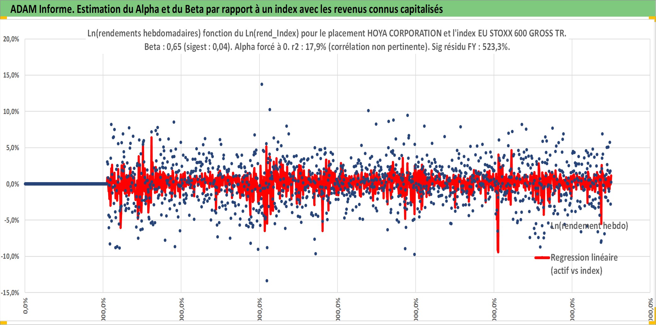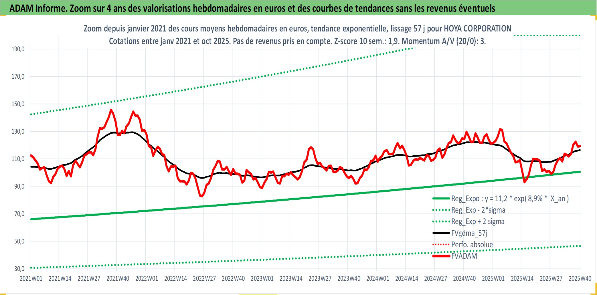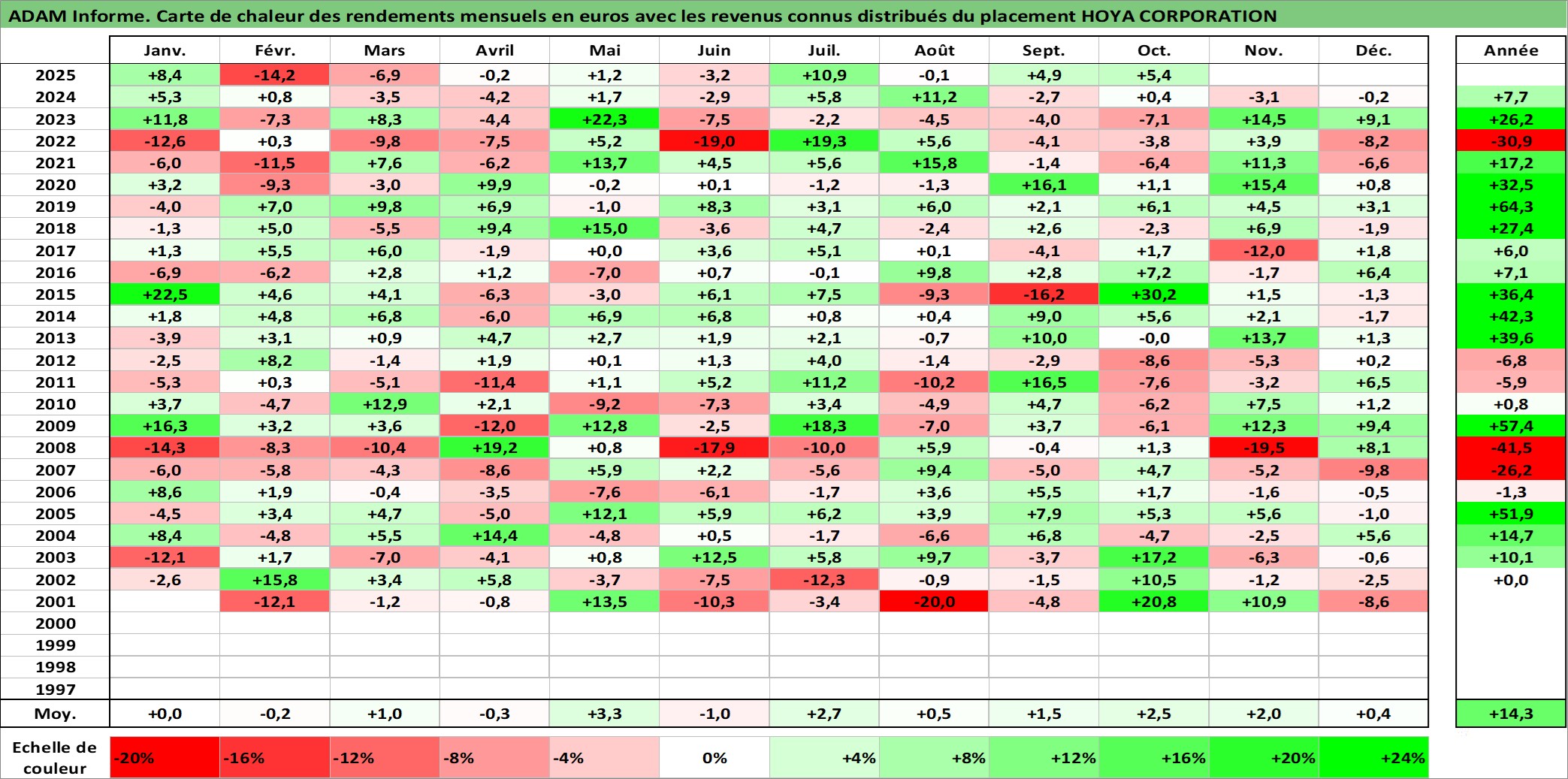 Site dédié aux investisseursPage dédiée sur site financeAnalyse des valorisations hebdomadaires de l'action HOYA CORPORATION. Cet actif est cote en JPY. Les valorisations sont en contrevaleur EURO et couvrent les semaines 2001W02 a 2025W40. Les revenus de cet actif financier sont pris en compte depuis la semaine 2001W13. La note globale ESG de cet actif est estimee a 11.0 (apres rebasage entre 0 et 20).