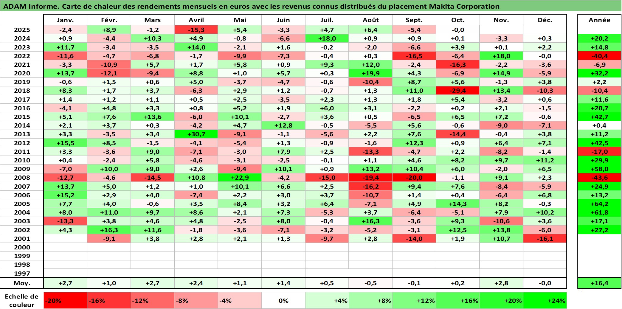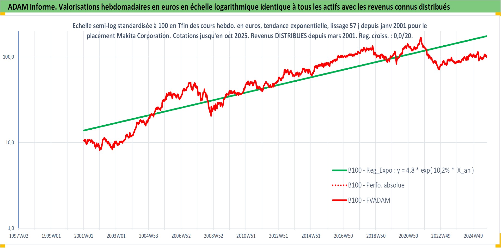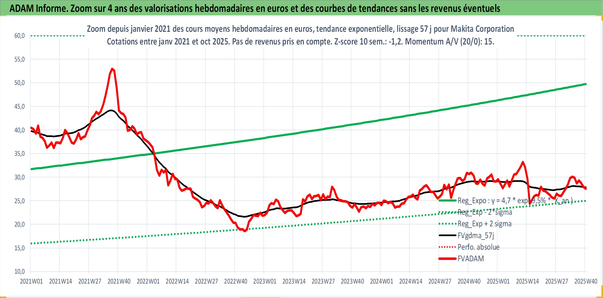 Site dédié aux investisseursPage dédiée sur site financeAnalyse des valorisations hebdomadaires de l'action Makita Corporation. Cet actif est cote en JPY. Les valorisations sont en contrevaleur EURO et couvrent les semaines 2001W02 a 2025W40. Les revenus de cet actif financier sont pris en compte depuis la semaine 2001W13. La note globale ESG de cet actif est estimee a 7.0 (apres rebasage entre 0 et 20).