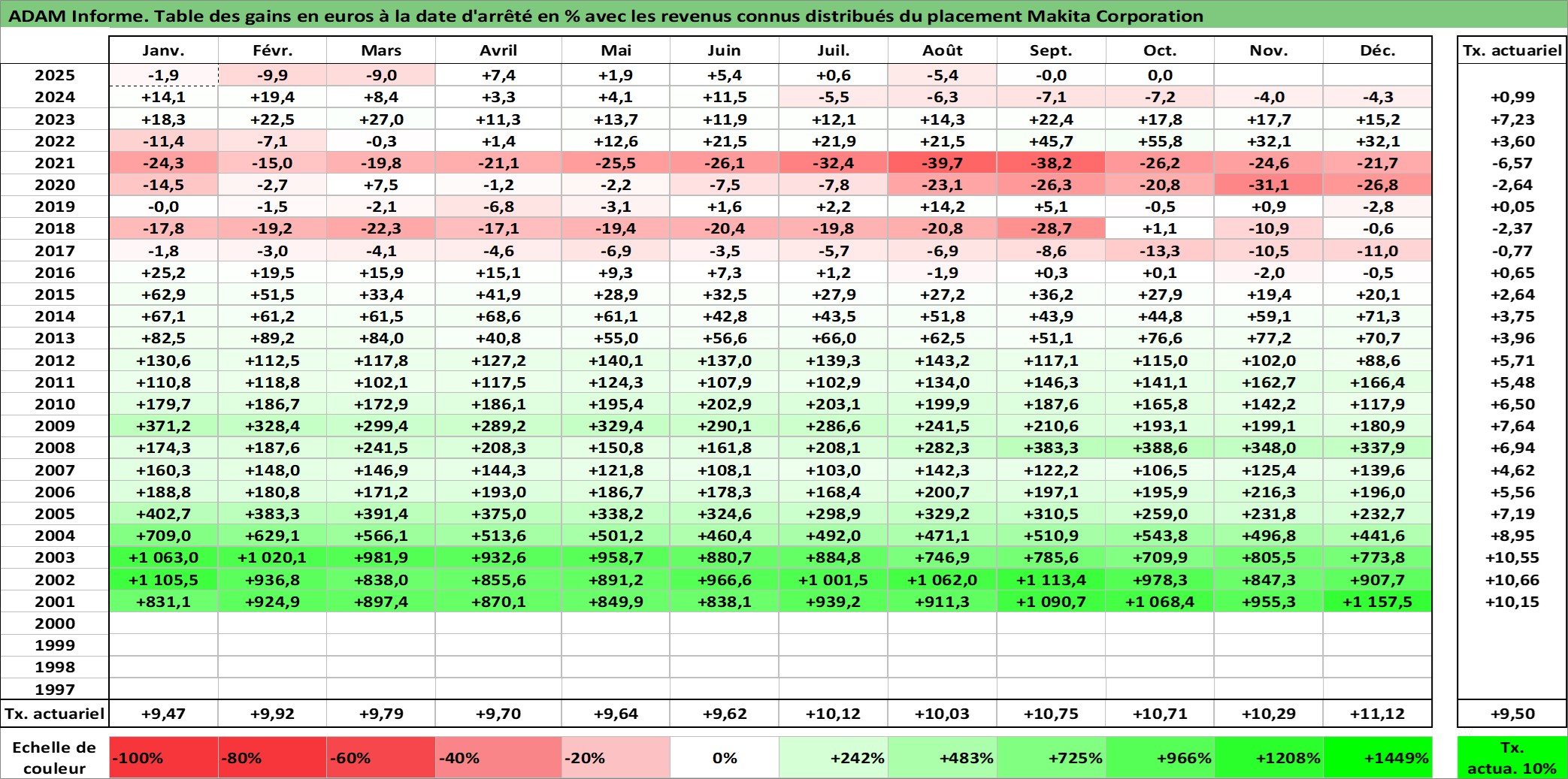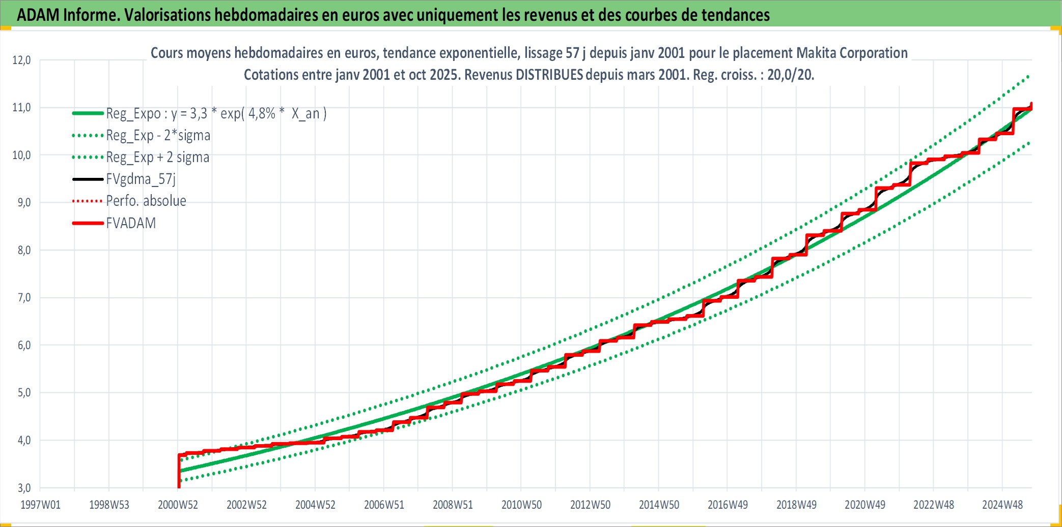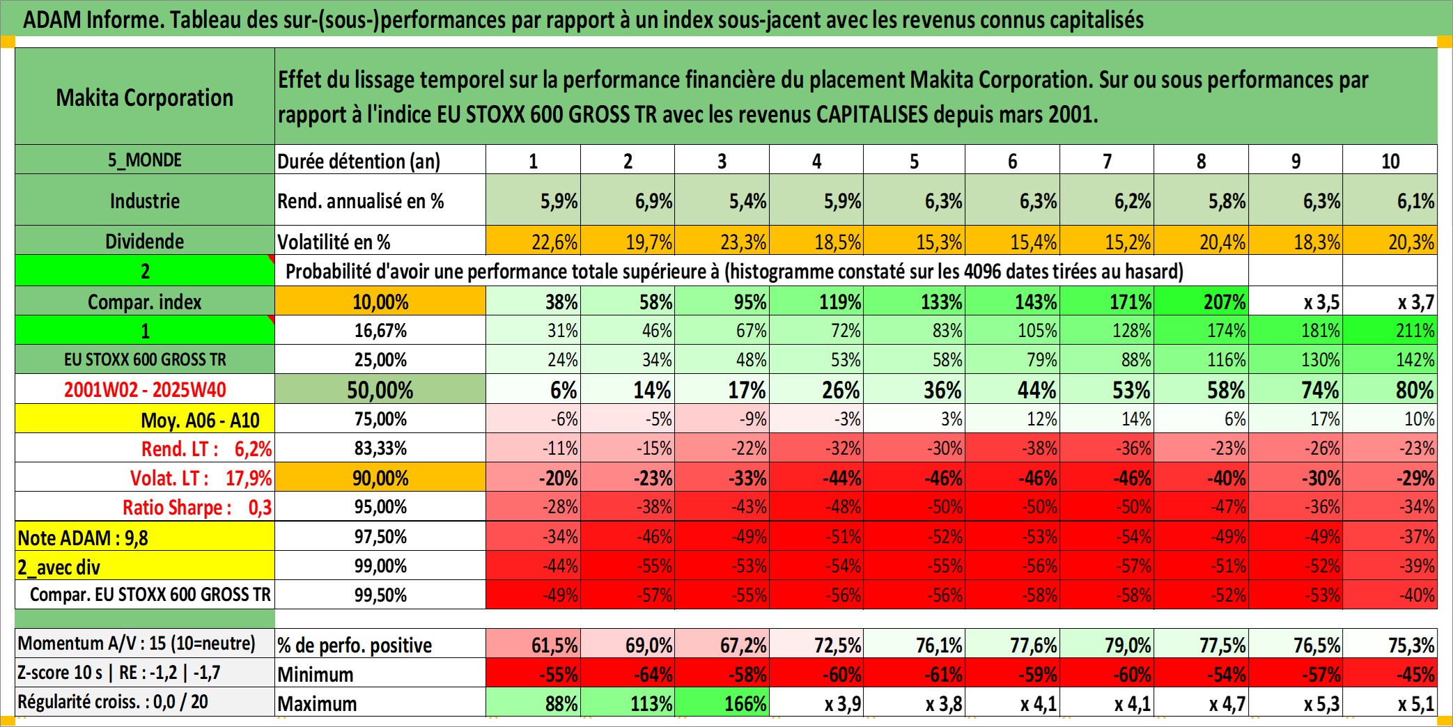 Site dédié aux investisseursPage dédiée sur site financeAnalyse des valorisations hebdomadaires de l'action Makita Corporation. Cet actif est cote en JPY. Les valorisations sont en contrevaleur EURO et couvrent les semaines 2001W02 a 2025W40. Les revenus de cet actif financier sont pris en compte depuis la semaine 2001W13. La note globale ESG de cet actif est estimee a 7.0 (apres rebasage entre 0 et 20).