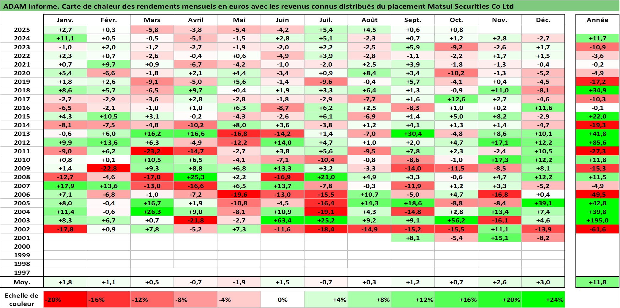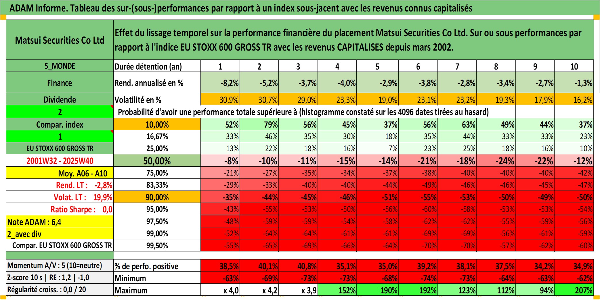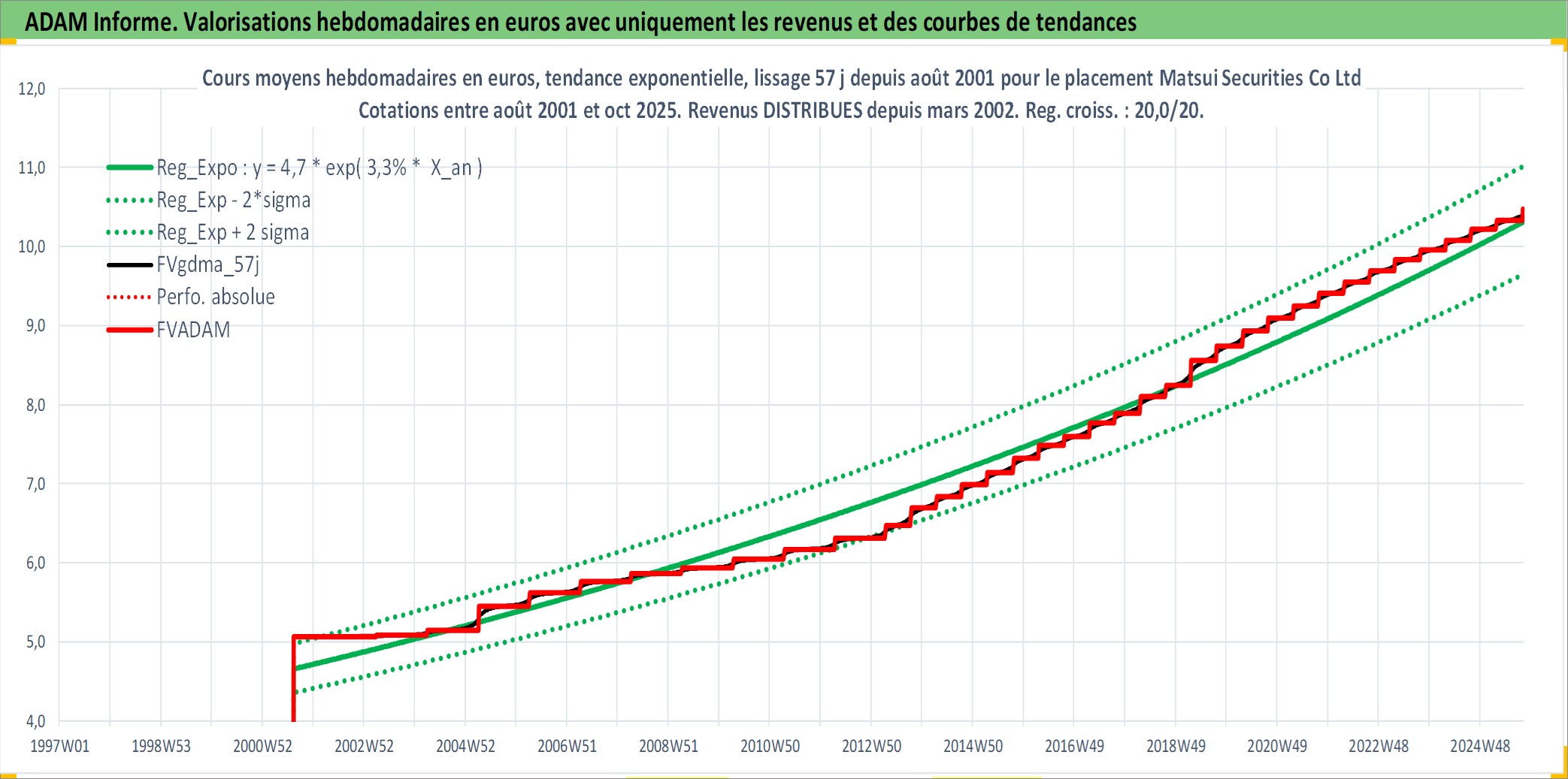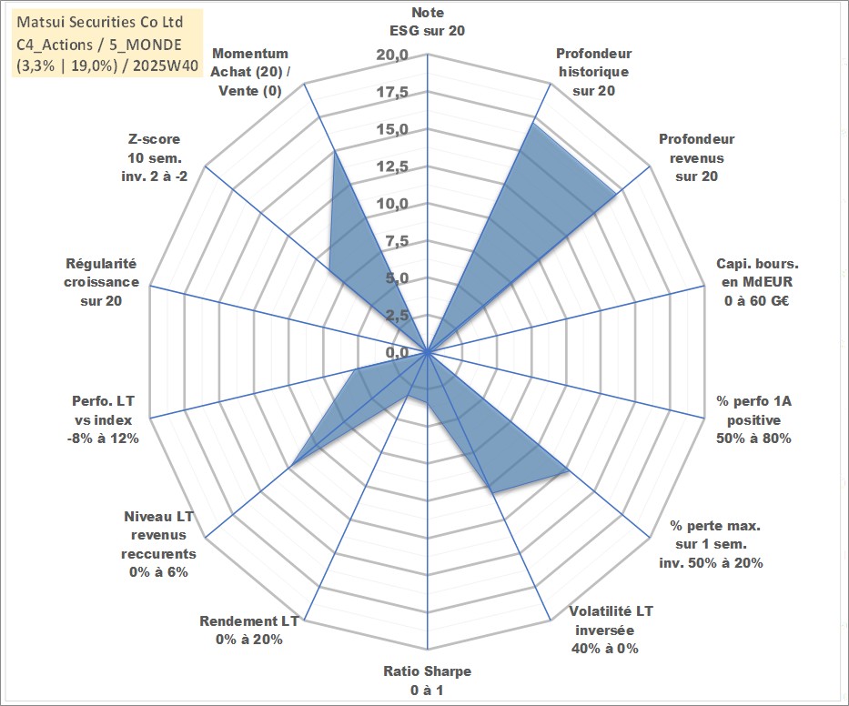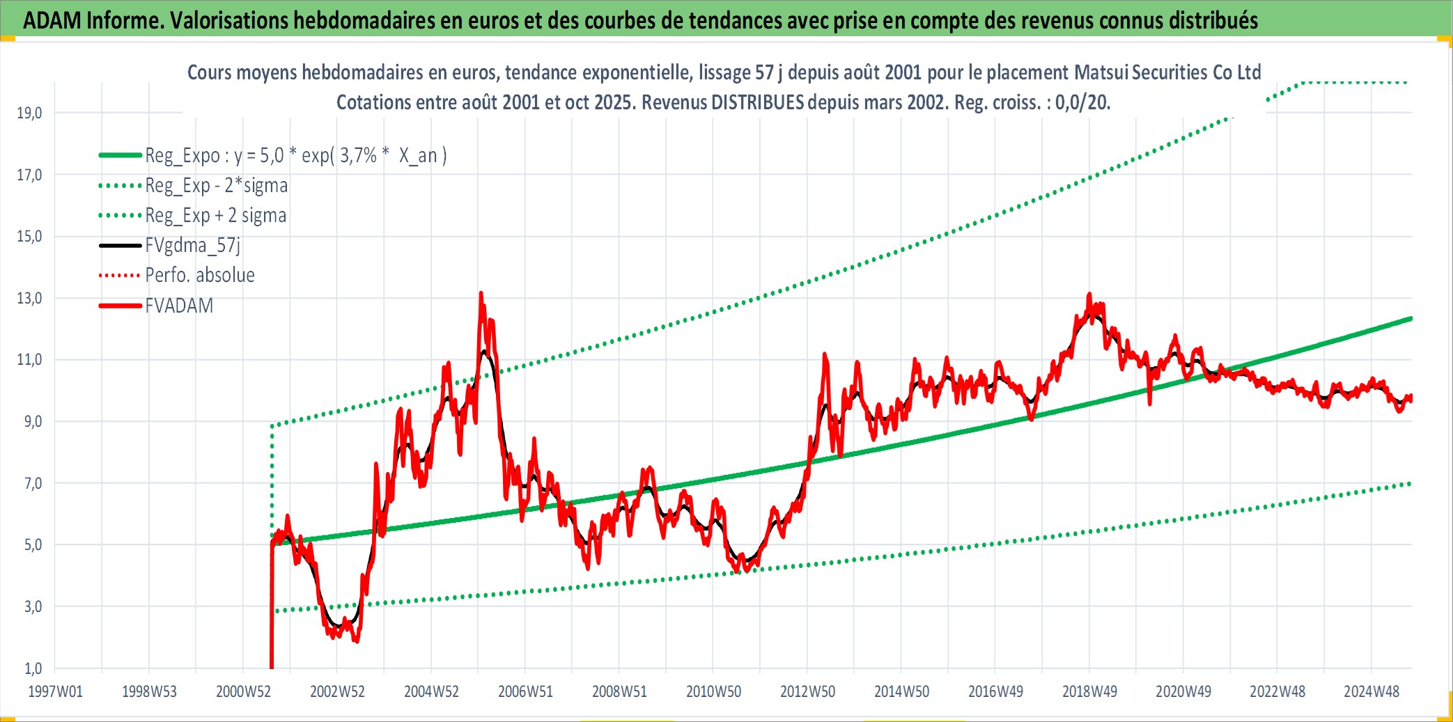 Site dédié aux investisseursPage dédiée sur site financeAnalyse des valorisations hebdomadaires de l'action Matsui Securities Co Ltd. Cet actif est cote en JPY. Les valorisations sont en contrevaleur EURO et couvrent les semaines 2001W32 a 2025W40. Les revenus de cet actif financier sont pris en compte depuis la semaine 2002W13. La note ESG de cet actif n'est pas connue.