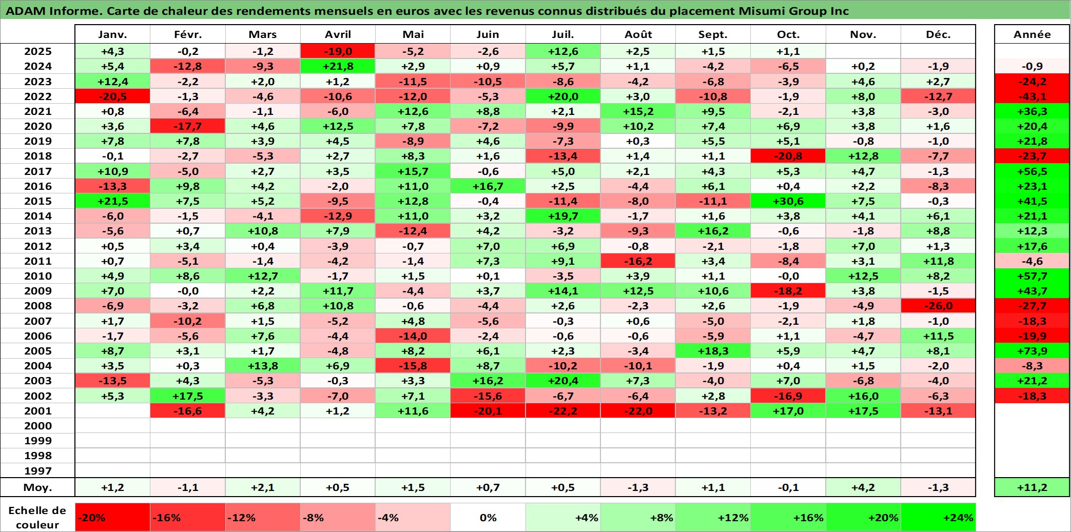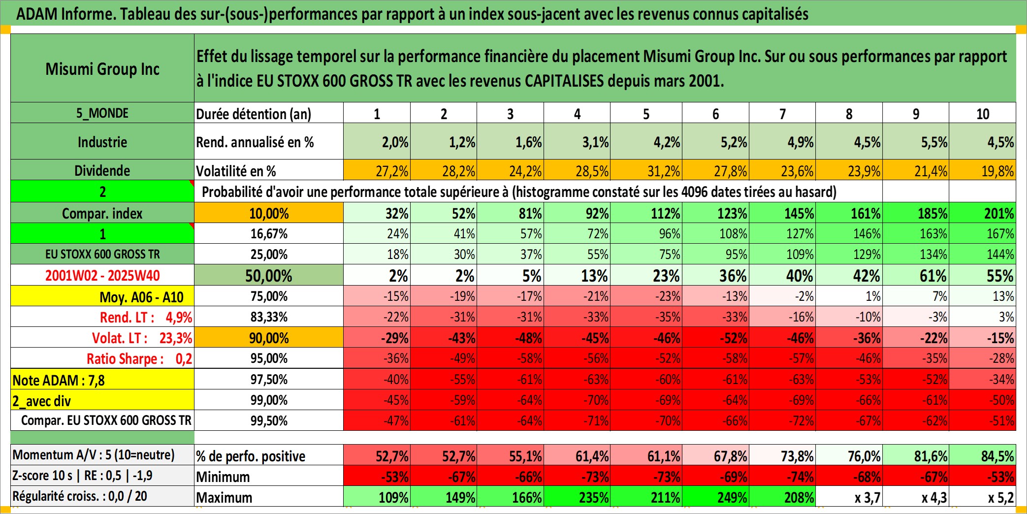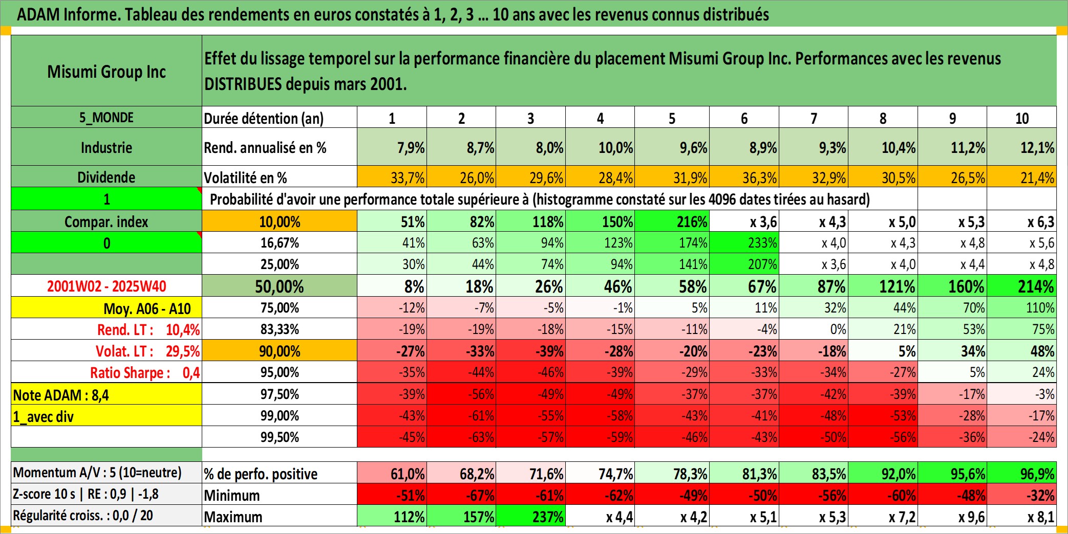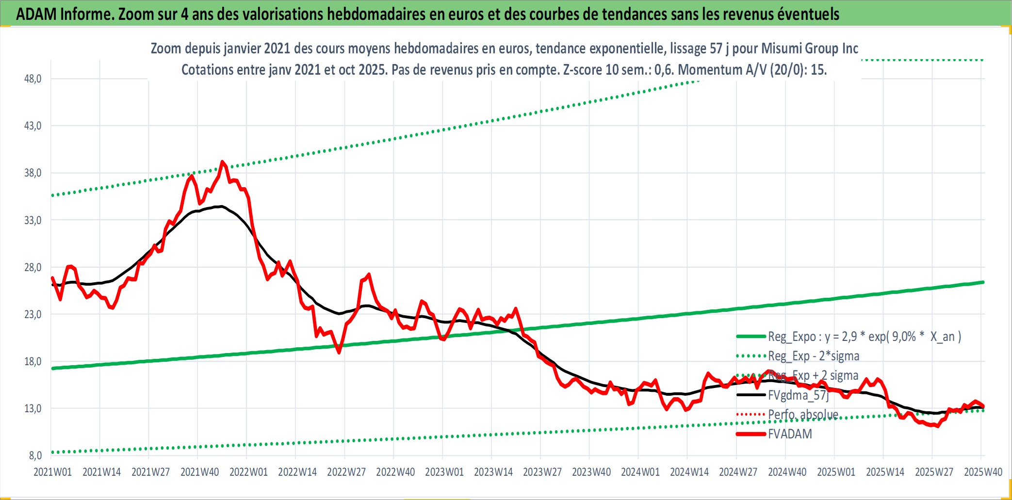 Site dédié aux investisseursPage dédiée sur site financeAnalyse des valorisations hebdomadaires de l'action Misumi Group Inc. Cet actif est cote en JPY. Les valorisations sont en contrevaleur EURO et couvrent les semaines 2001W02 a 2025W40. Les revenus de cet actif financier sont pris en compte depuis la semaine 2001W13. La note ESG de cet actif n'est pas connue.