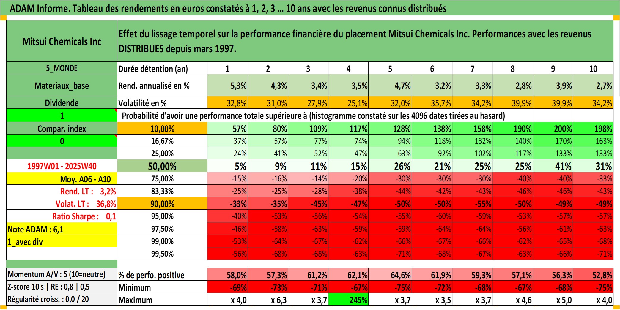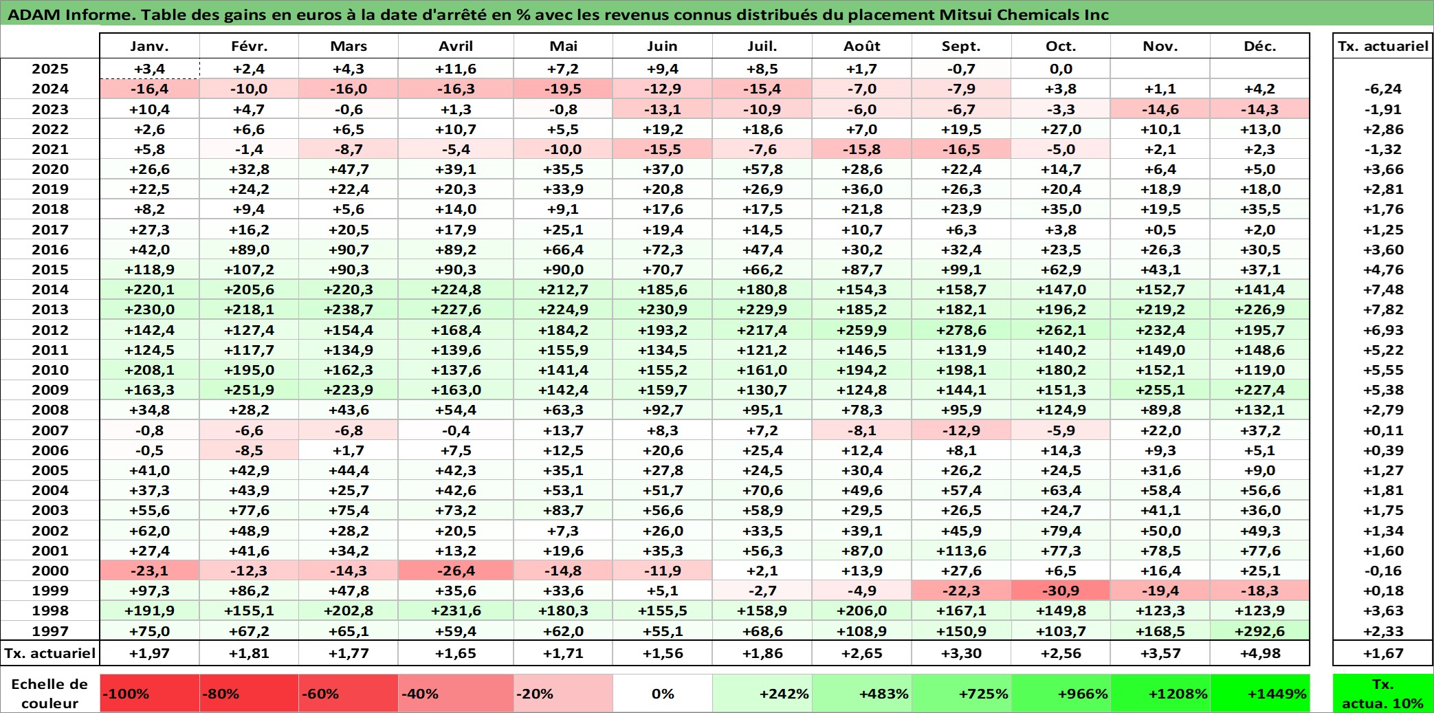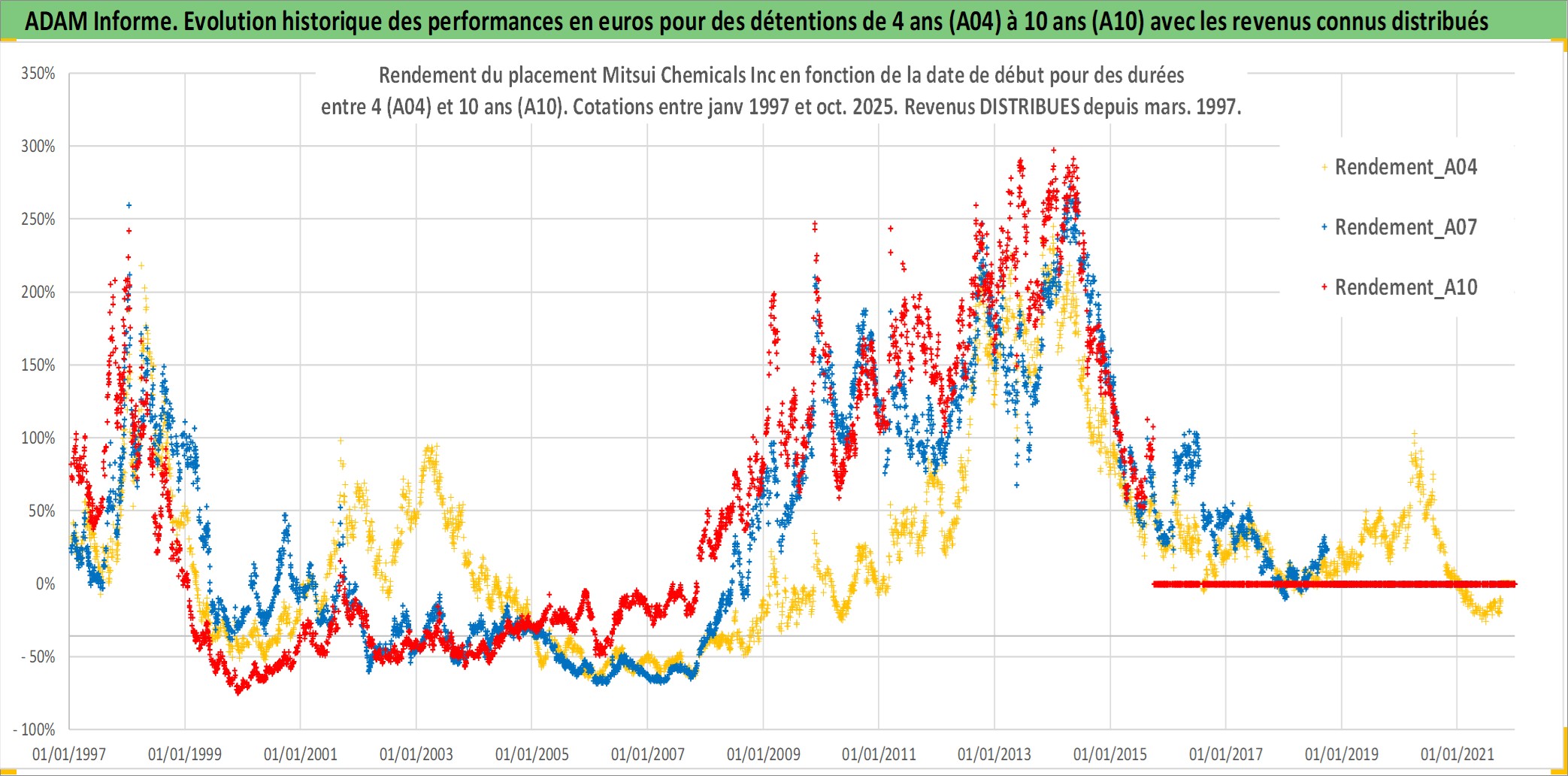 Site dédié aux investisseursPage dédiée sur site financeAnalyse des valorisations hebdomadaires de l'action Mitsui Chemicals Inc. Cet actif est cote en JPY. Les valorisations sont en contrevaleur EURO et couvrent les semaines 1997W01 a 2025W40. Les revenus de cet actif financier sont pris en compte depuis la semaine 1997W13. La note ESG de cet actif n'est pas connue.