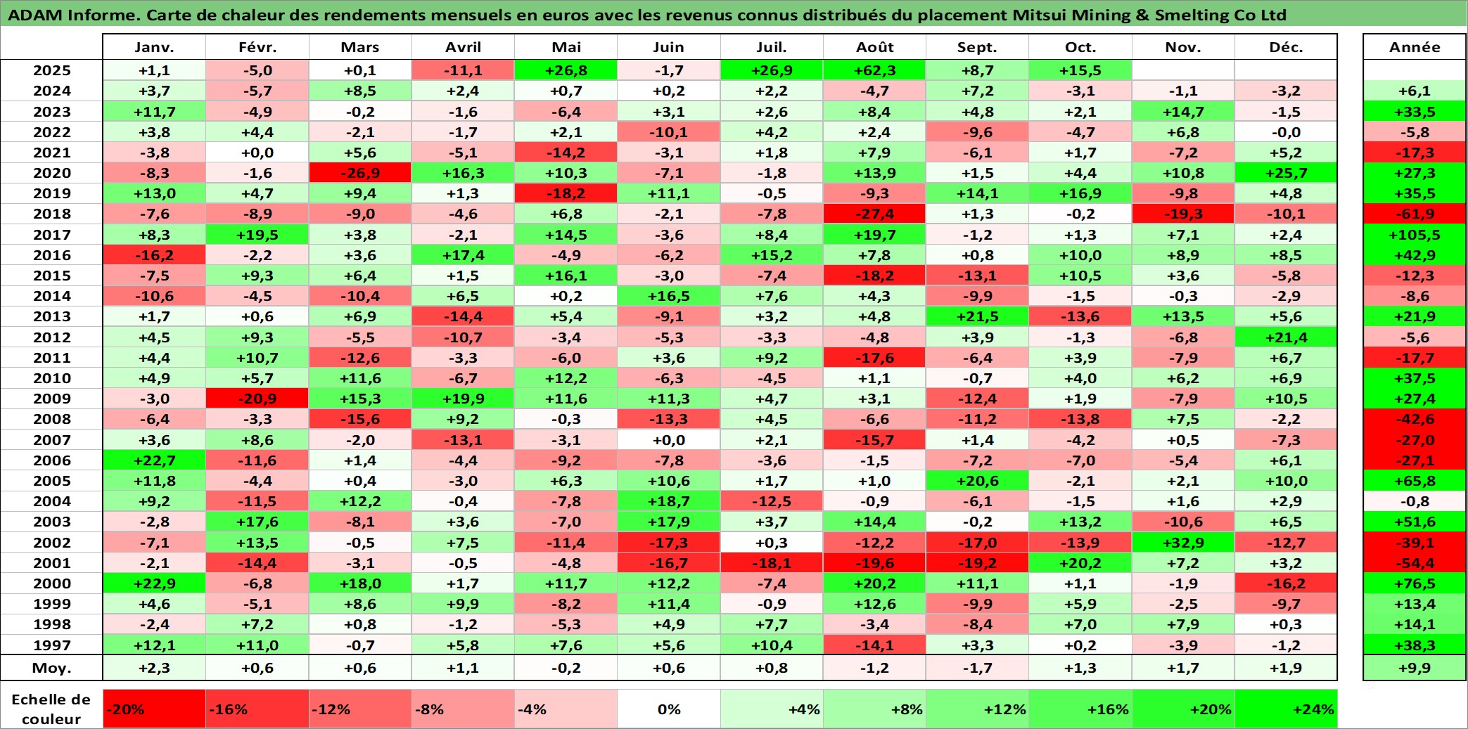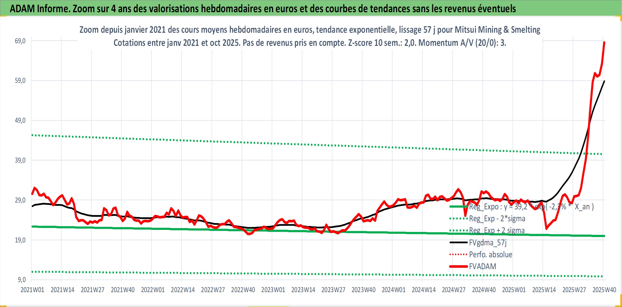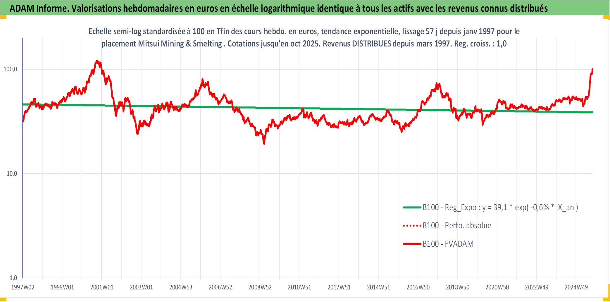 Site dédié aux investisseursPage dédiée sur site financeAnalyse des valorisations hebdomadaires de l'action Mitsui Mining & Smelting Co Ltd. Cet actif est cote en JPY. Les valorisations sont en contrevaleur EURO et couvrent les semaines 1997W01 a 2025W40. Les revenus de cet actif financier sont pris en compte depuis la semaine 1997W13. La note ESG de cet actif n'est pas connue.
