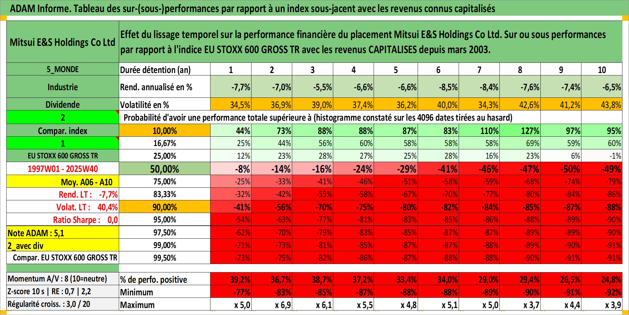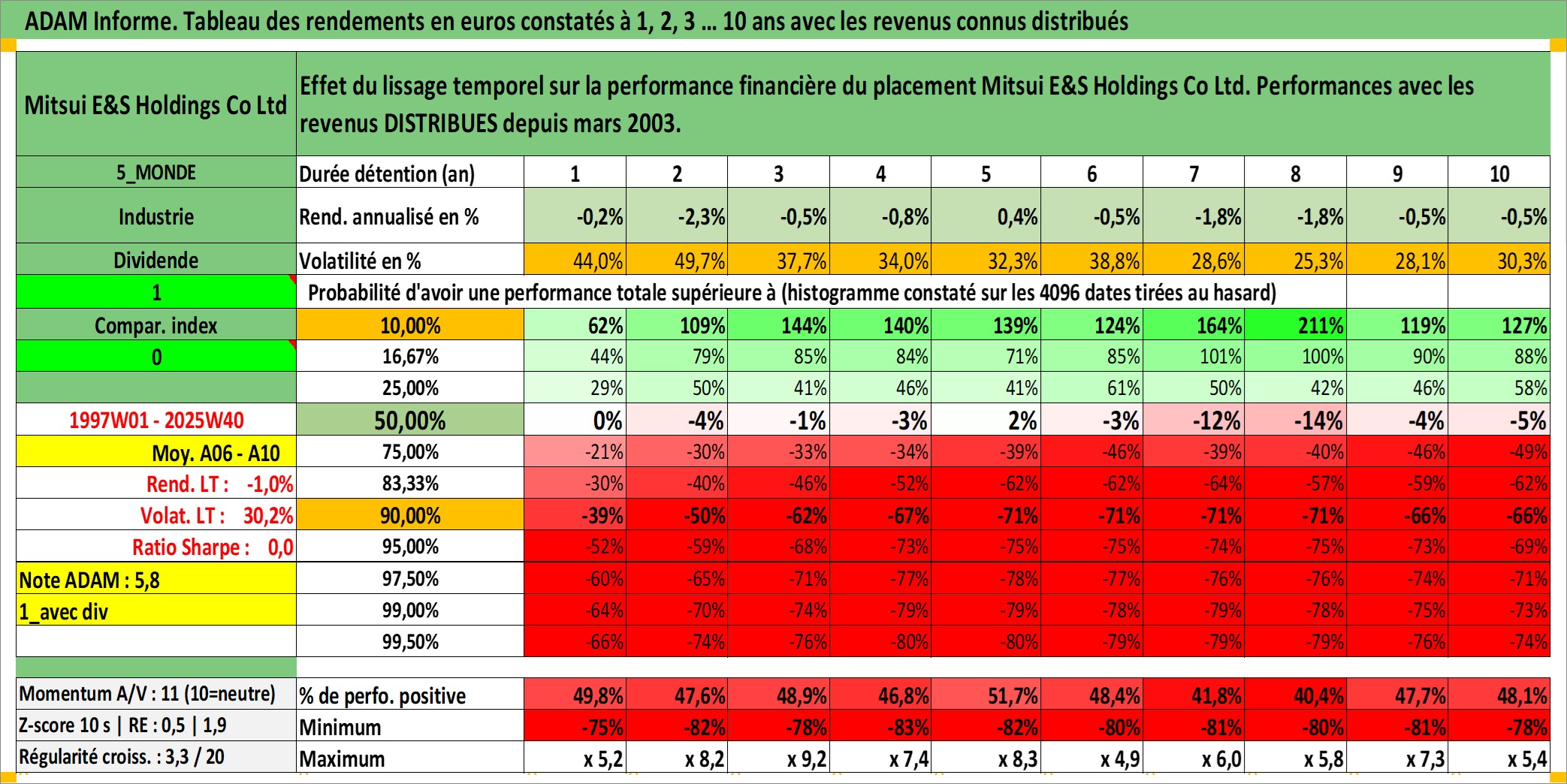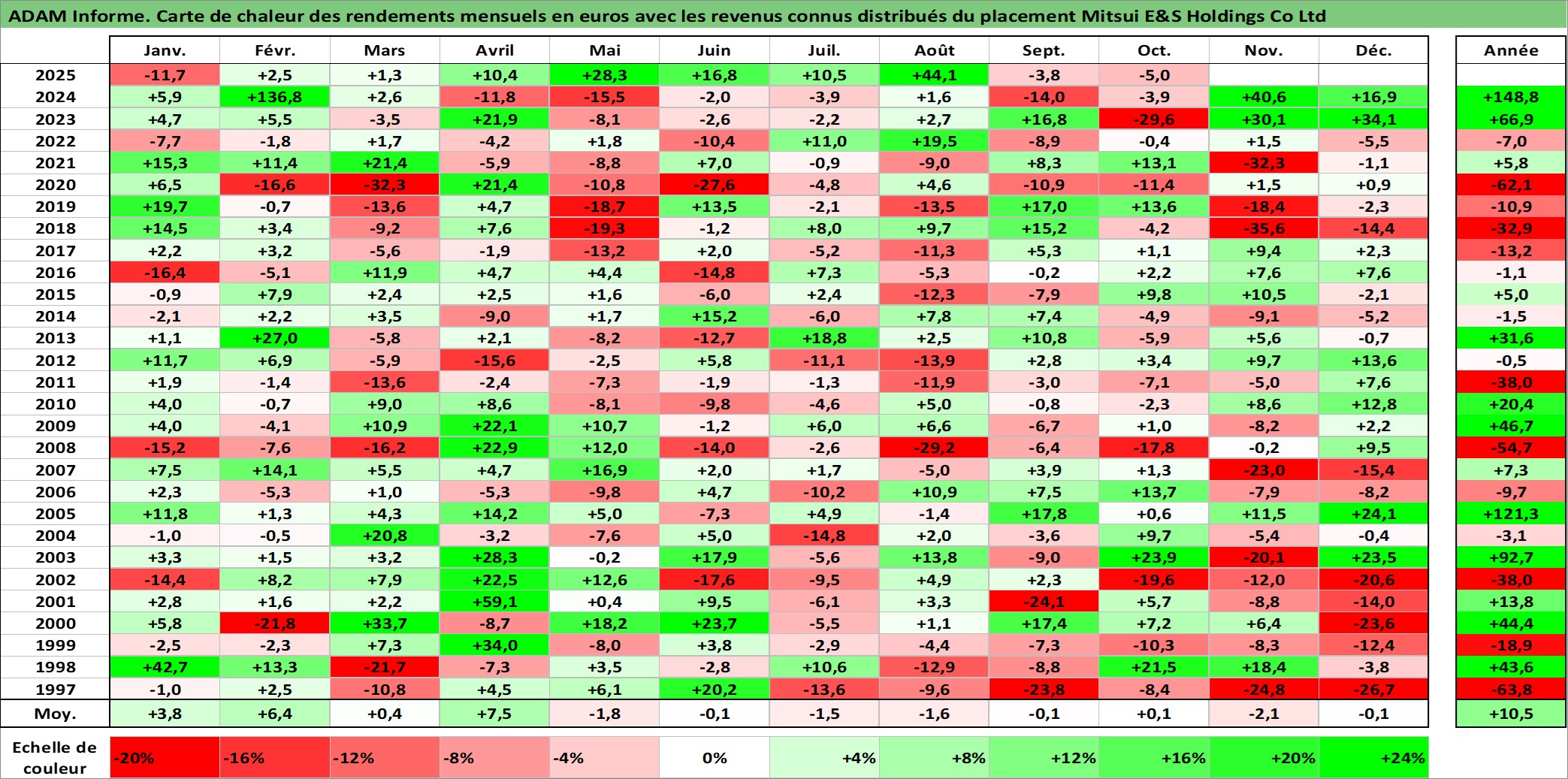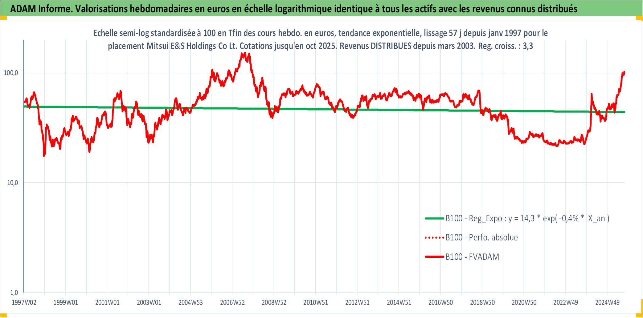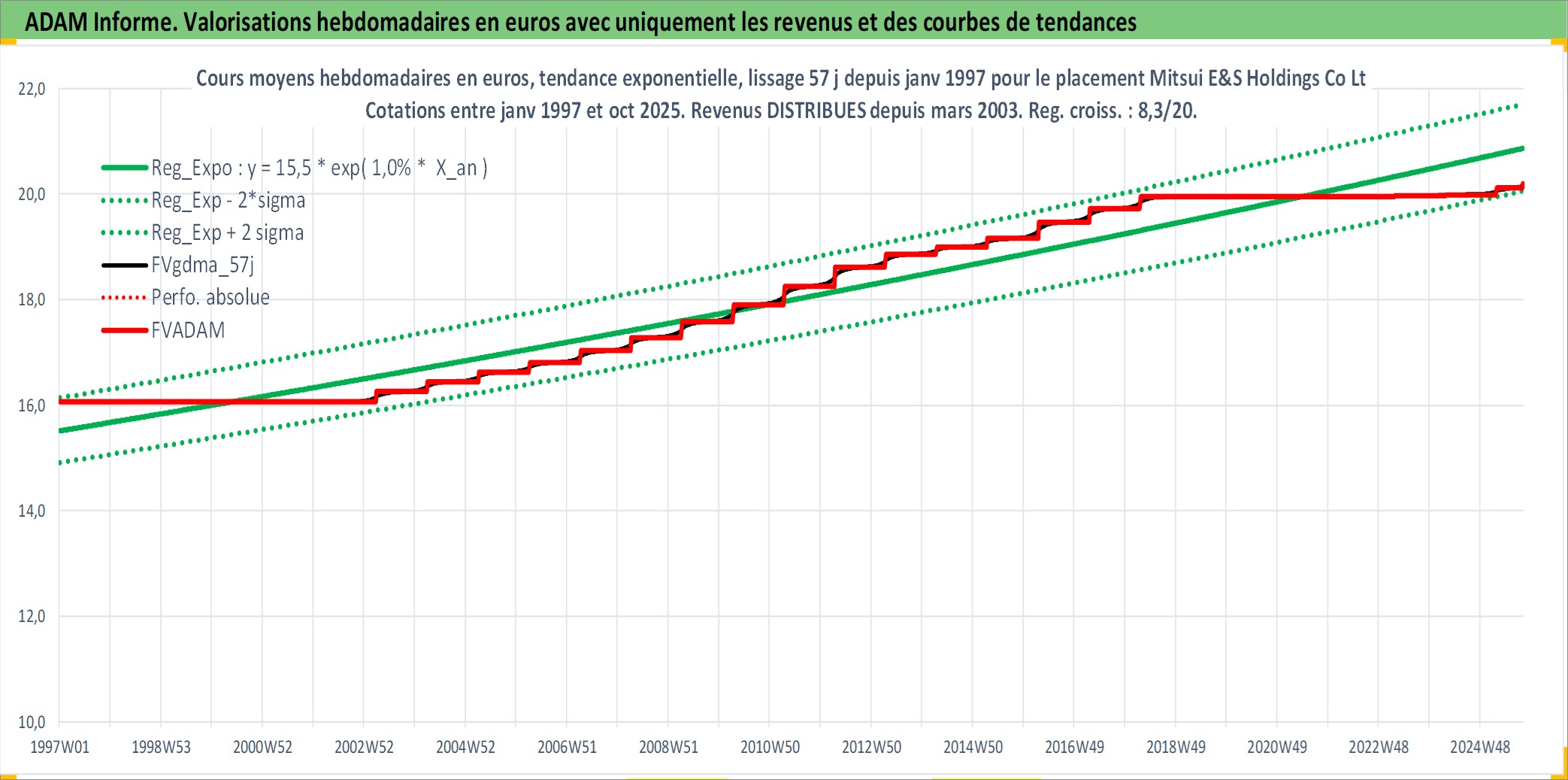 Site dédié aux investisseursPage dédiée sur site financeAnalyse des valorisations hebdomadaires de l'action Mitsui E&S Holdings Co Ltd. Cet actif est cote en JPY. Les valorisations sont en contrevaleur EURO et couvrent les semaines 1997W01 a 2025W40. Les revenus de cet actif financier sont pris en compte depuis la semaine 2003W13. La note ESG de cet actif n'est pas connue.