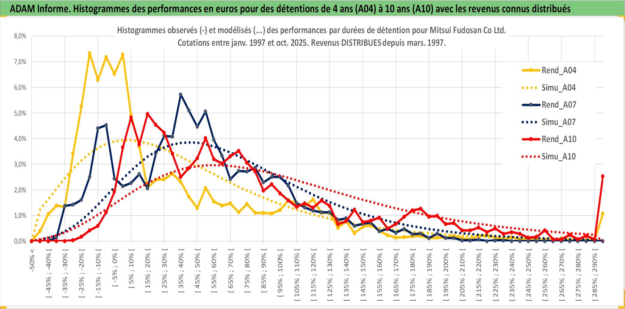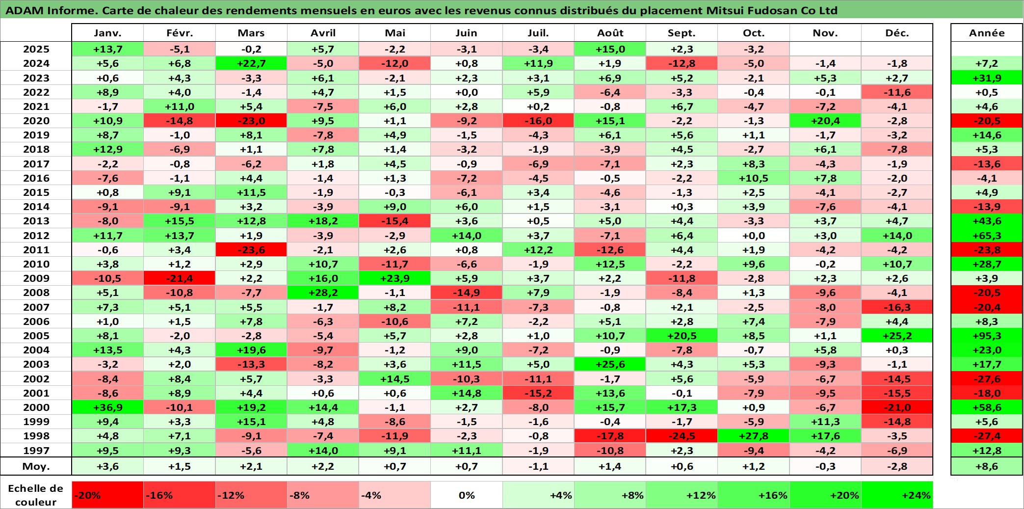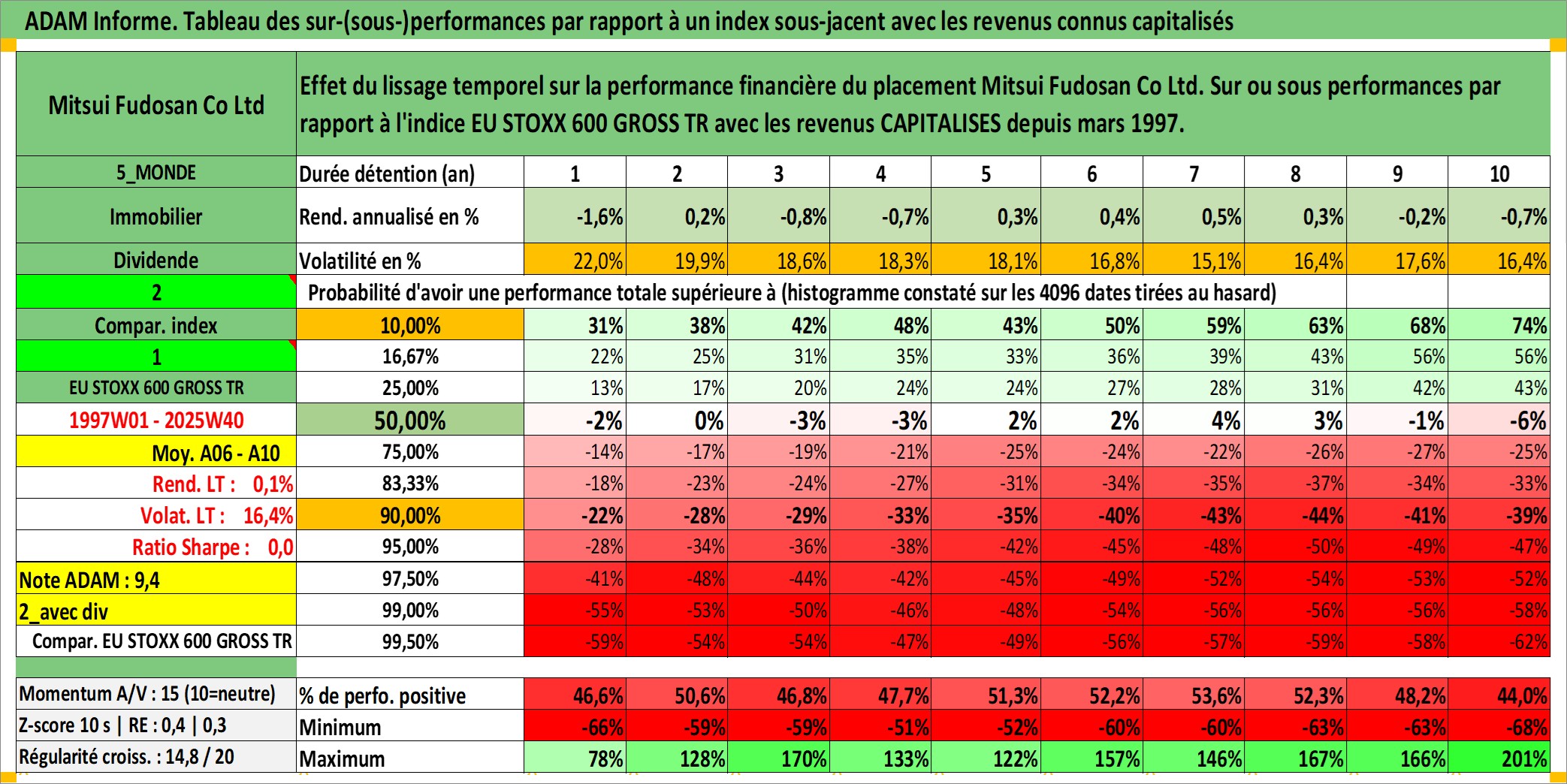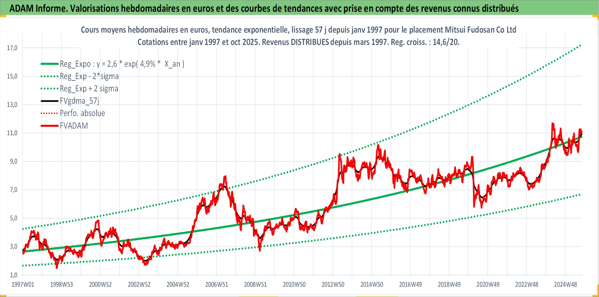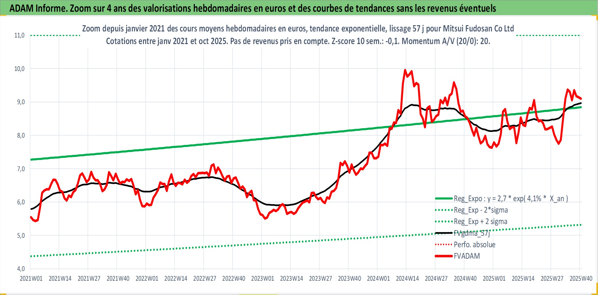 Site dédié aux investisseursPage dédiée sur site financeAnalyse des valorisations hebdomadaires de l'action Mitsui Fudosan Co Ltd. Cet actif est cote en JPY. Les valorisations sont en contrevaleur EURO et couvrent les semaines 1997W01 a 2025W40. Les revenus de cet actif financier sont pris en compte depuis la semaine 1997W13. La note globale ESG de cet actif est estimee a 9.0 (apres rebasage entre 0 et 20).