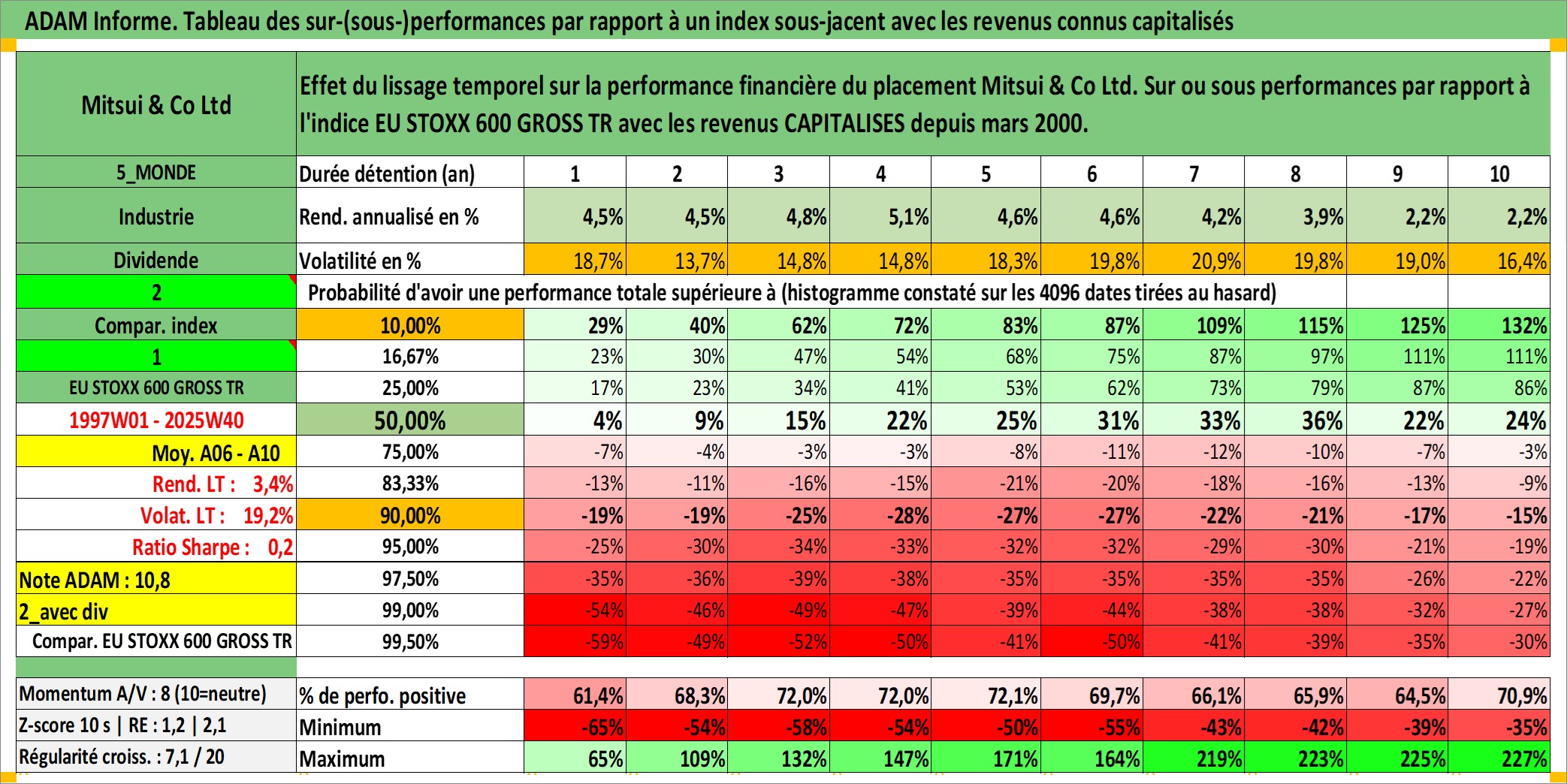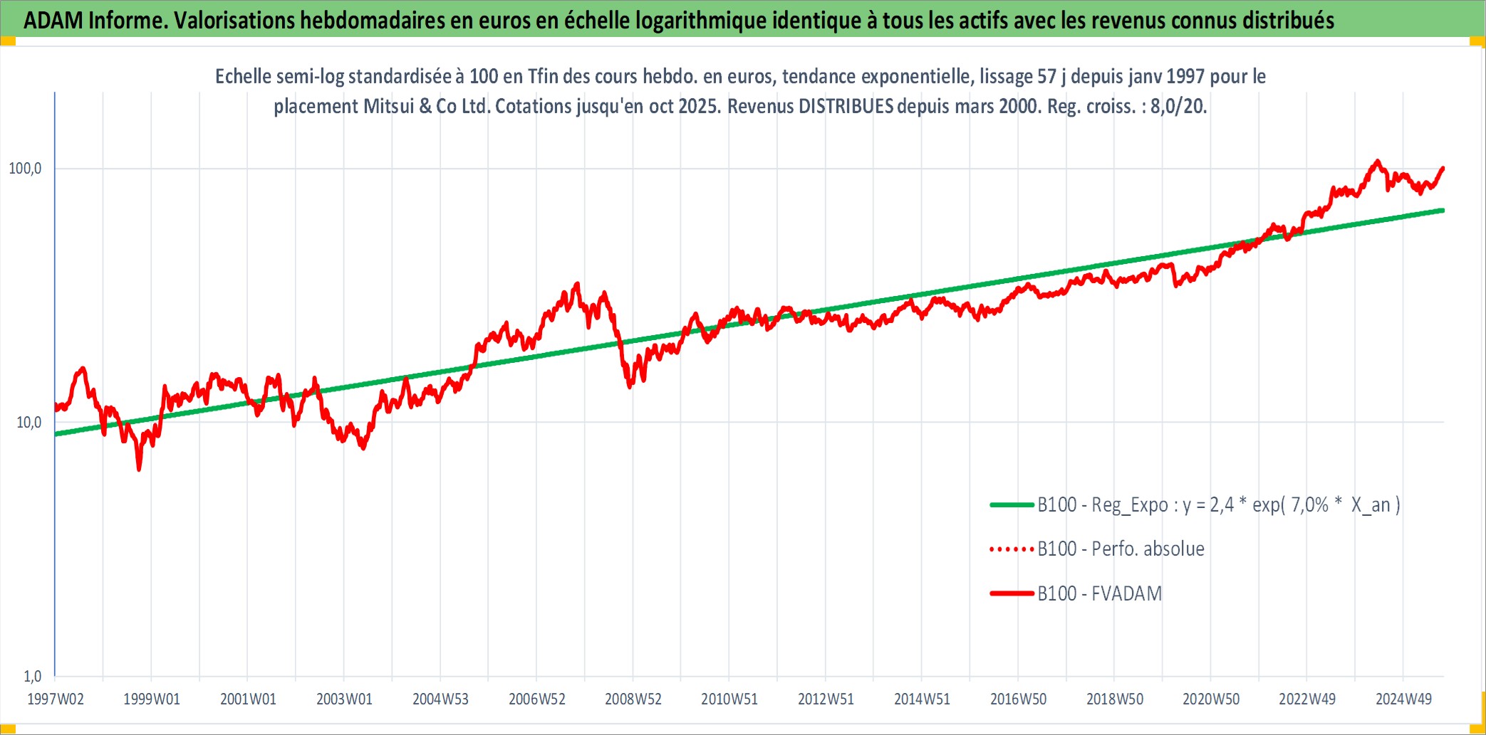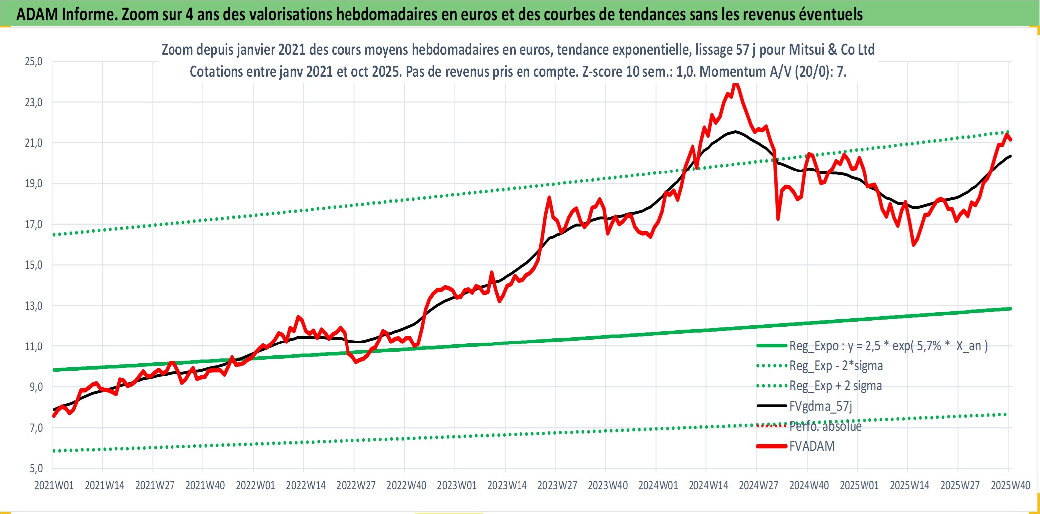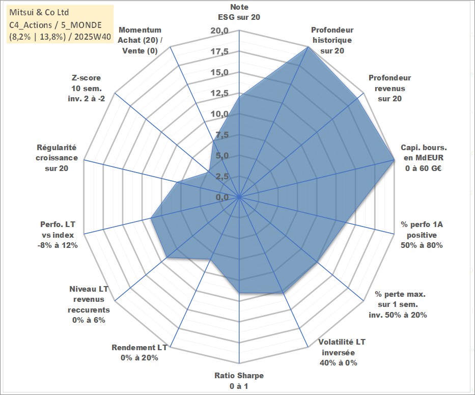 Site dédié aux investisseursPage dédiée sur site financeAnalyse des valorisations hebdomadaires de l'action Mitsui & Co Ltd. Cet actif est cote en JPY. Les valorisations sont en contrevaleur EURO et couvrent les semaines 1997W01 a 2025W40. Les revenus de cet actif financier sont pris en compte depuis la semaine 2000W13. La note globale ESG de cet actif est estimee a 12.0 (apres rebasage entre 0 et 20).