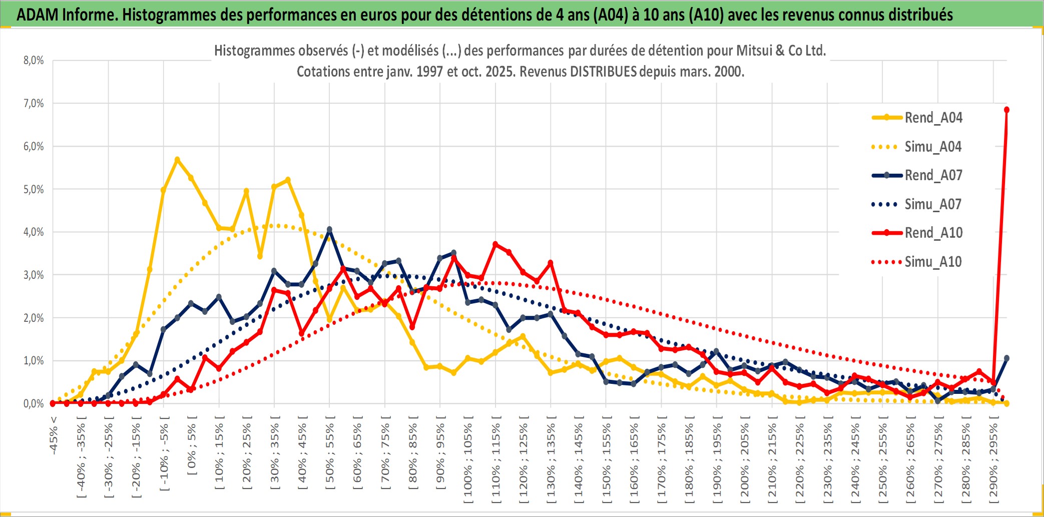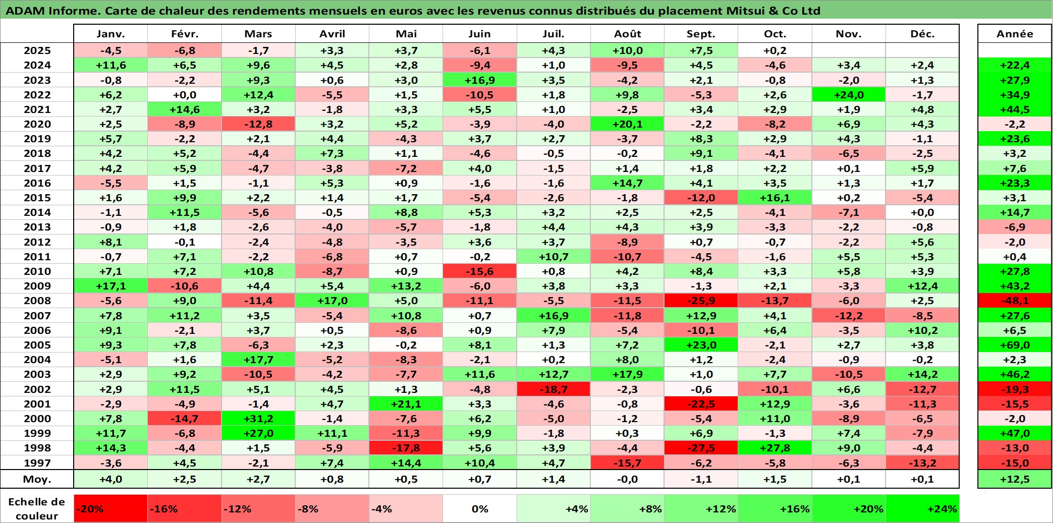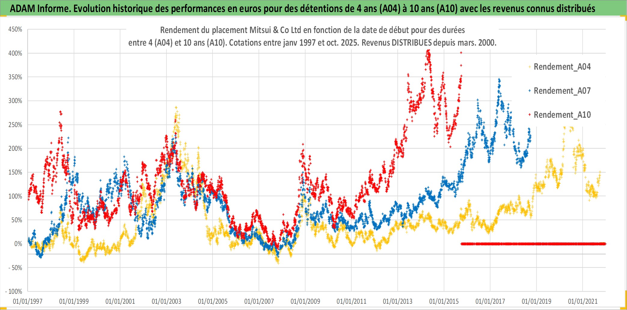 Site dédié aux investisseursPage dédiée sur site financeAnalyse des valorisations hebdomadaires de l'action Mitsui & Co Ltd. Cet actif est cote en JPY. Les valorisations sont en contrevaleur EURO et couvrent les semaines 1997W01 a 2025W40. Les revenus de cet actif financier sont pris en compte depuis la semaine 2000W13. La note globale ESG de cet actif est estimee a 12.0 (apres rebasage entre 0 et 20).
