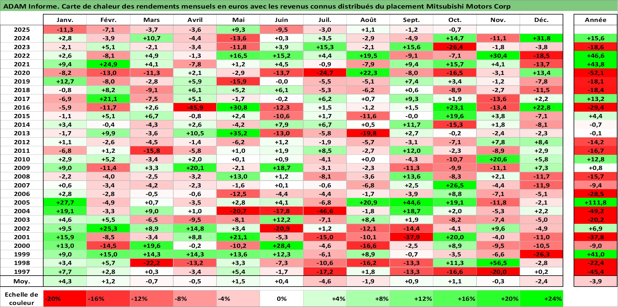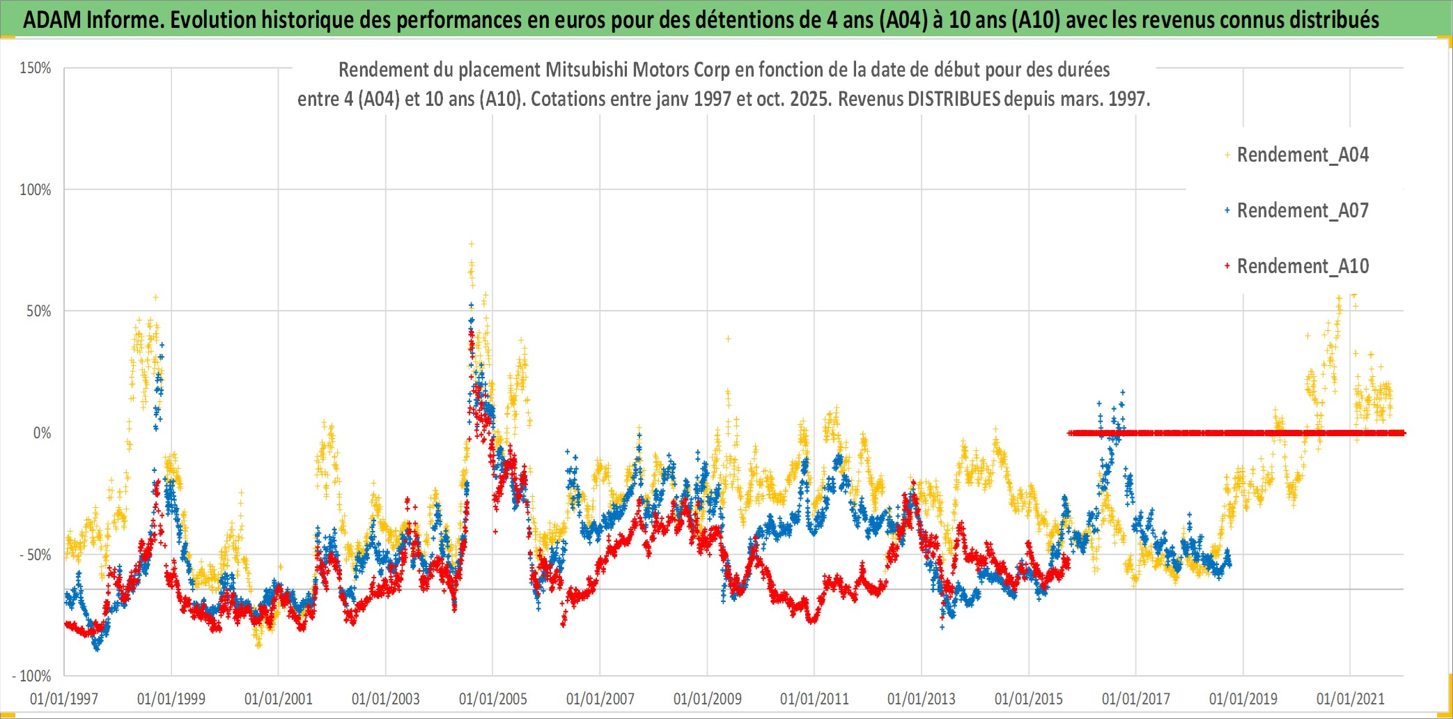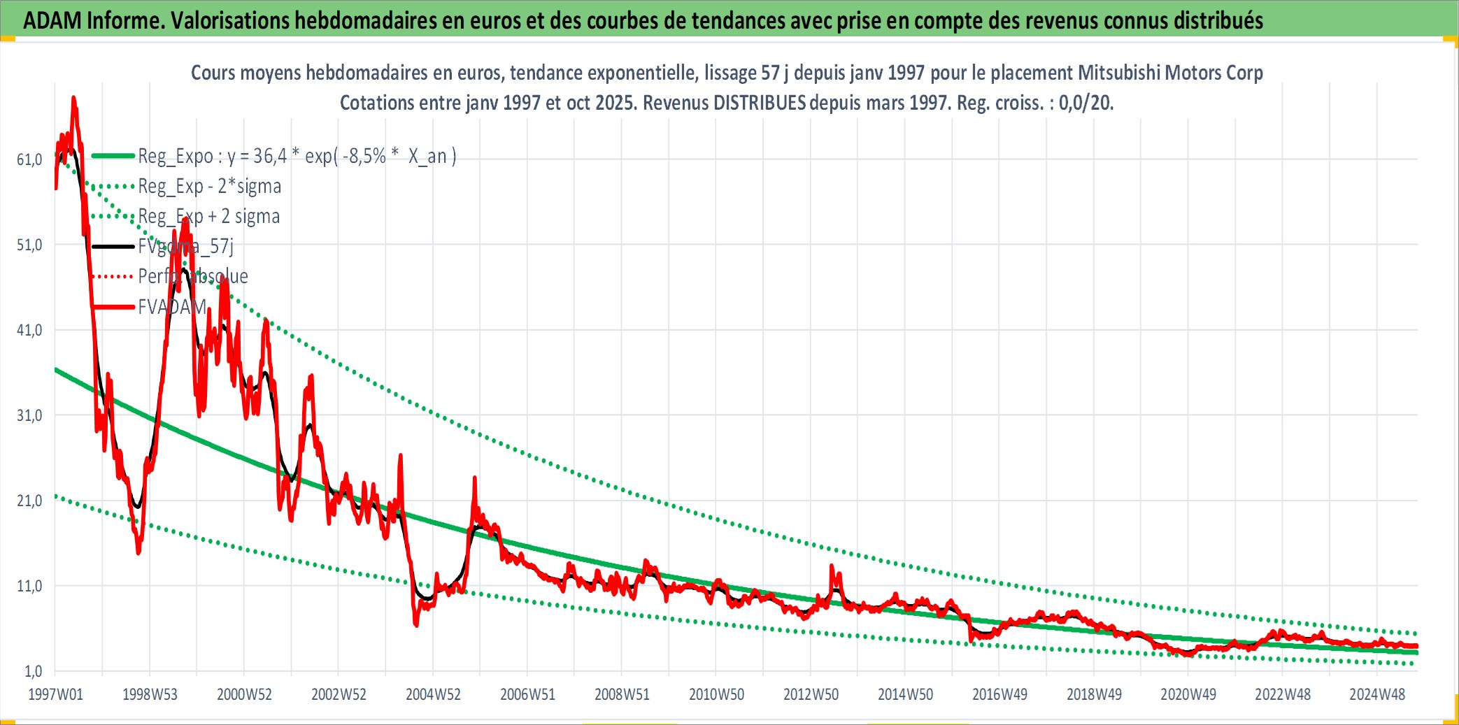 Site dédié aux investisseursPage dédiée sur site financeAnalyse des valorisations hebdomadaires de l'action Mitsubishi Motors Corp. Cet actif est cote en JPY. Les valorisations sont en contrevaleur EURO et couvrent les semaines 1997W01 a 2025W40. Les revenus de cet actif financier sont pris en compte depuis la semaine 1997W13. La note globale ESG de cet actif est estimee a 6.0 (apres rebasage entre 0 et 20).