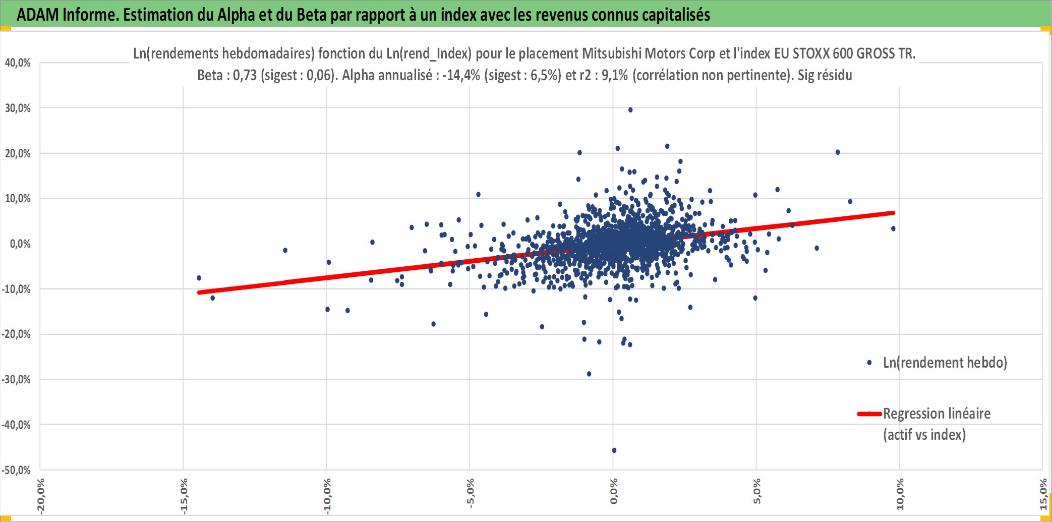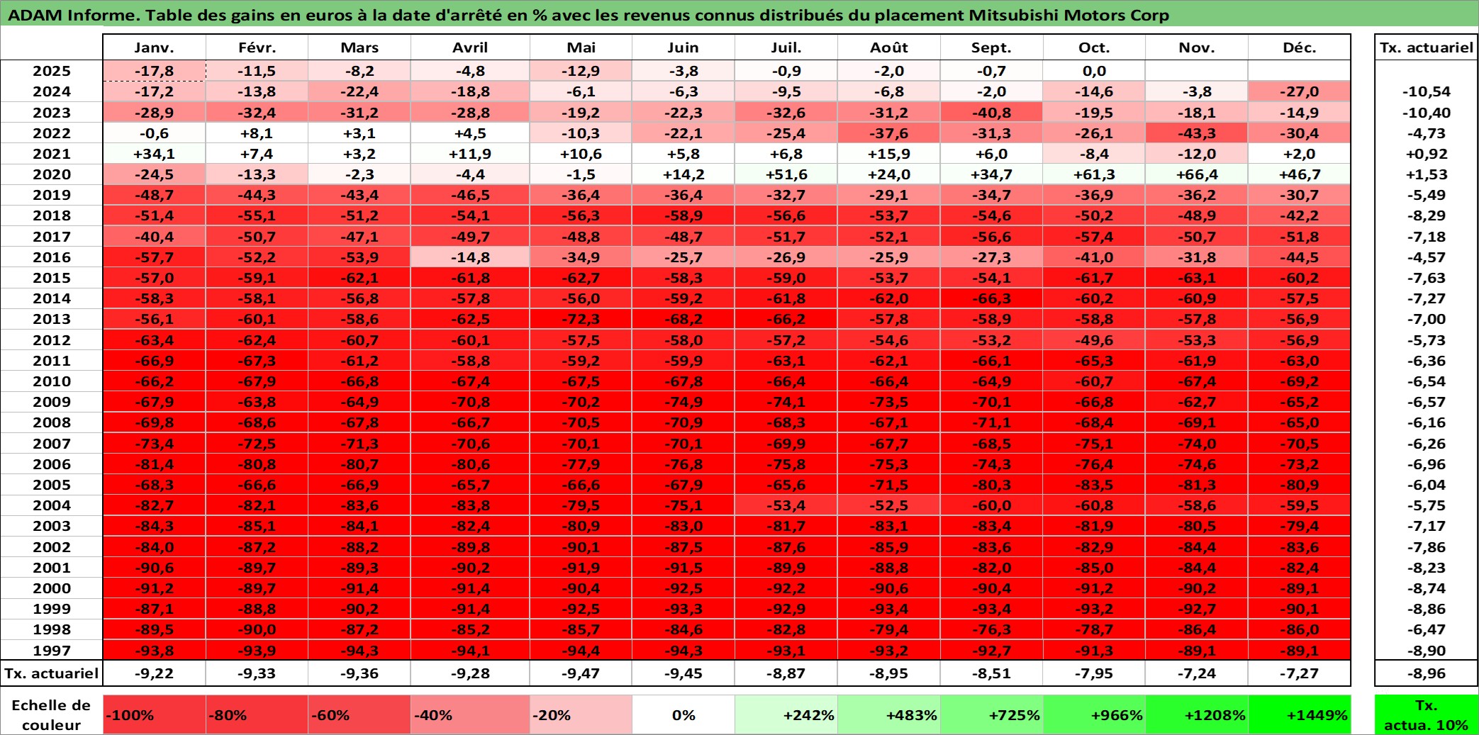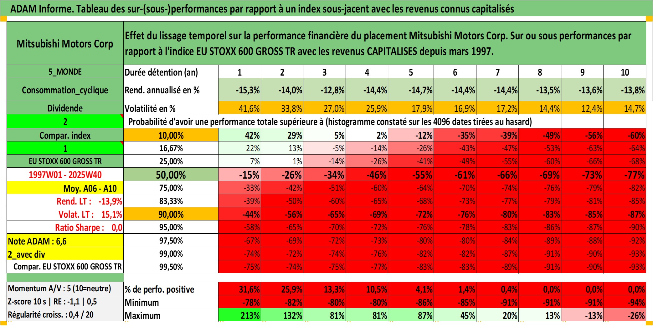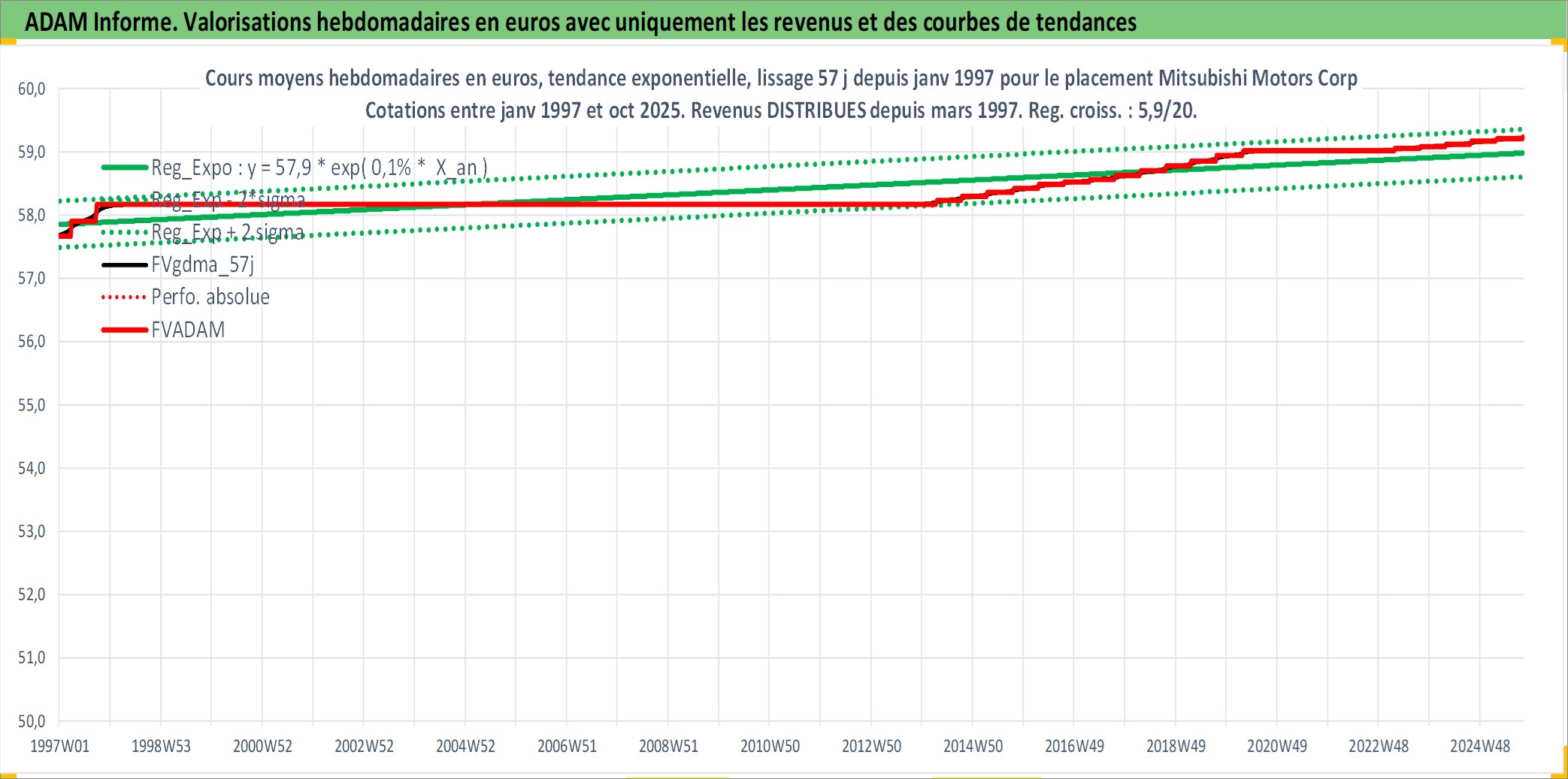 Site dédié aux investisseursPage dédiée sur site financeAnalyse des valorisations hebdomadaires de l'action Mitsubishi Motors Corp. Cet actif est cote en JPY. Les valorisations sont en contrevaleur EURO et couvrent les semaines 1997W01 a 2025W40. Les revenus de cet actif financier sont pris en compte depuis la semaine 1997W13. La note globale ESG de cet actif est estimee a 6.0 (apres rebasage entre 0 et 20).