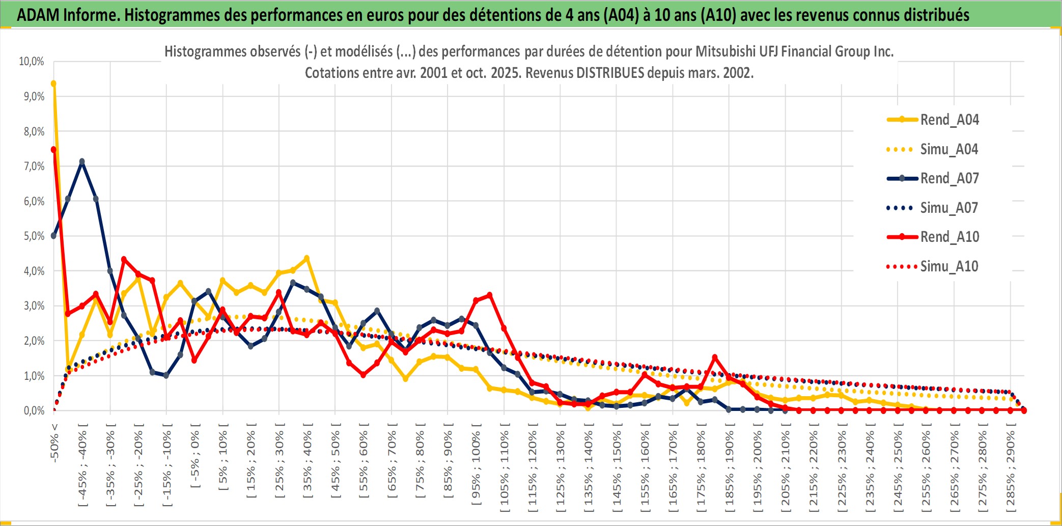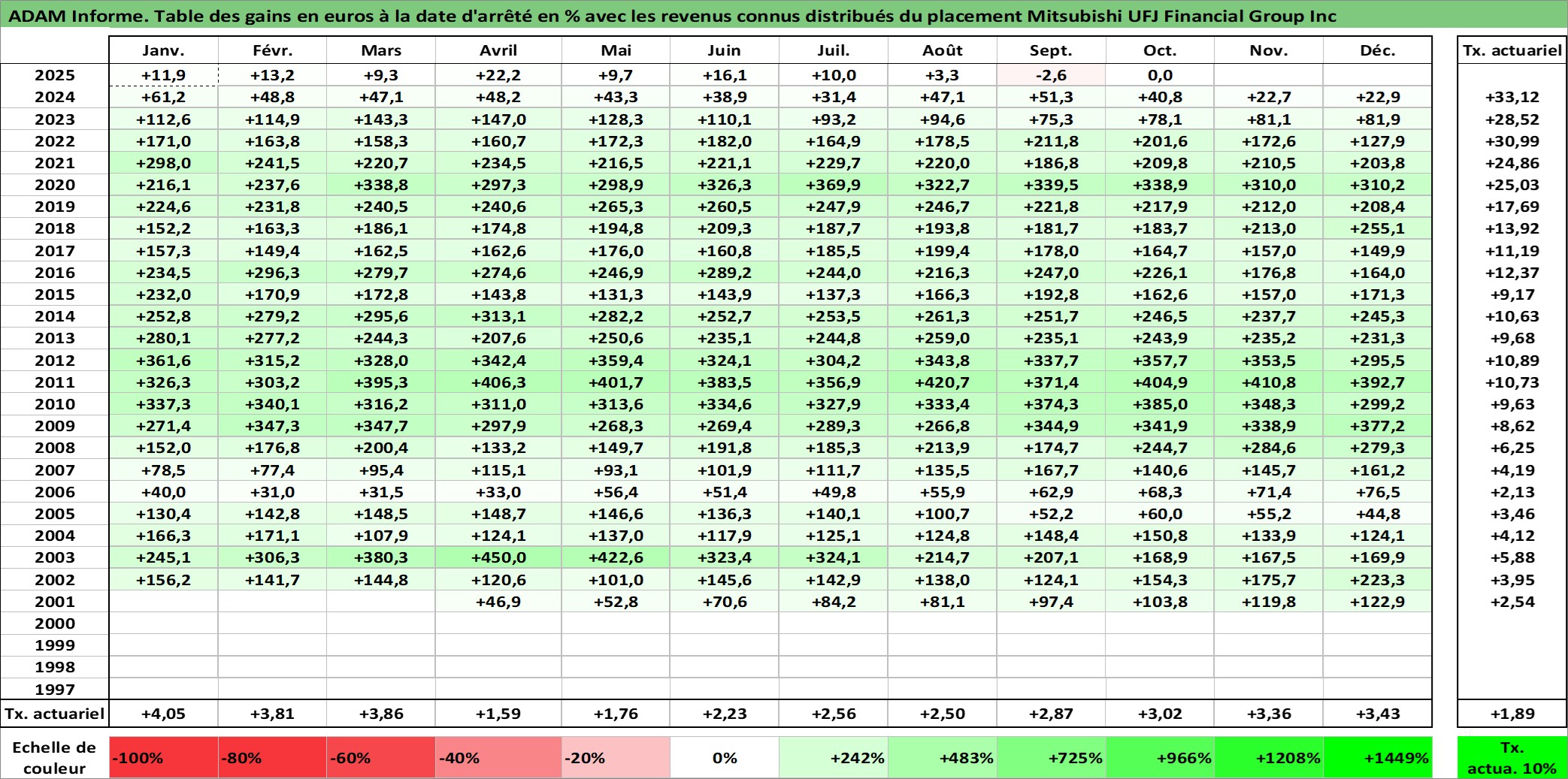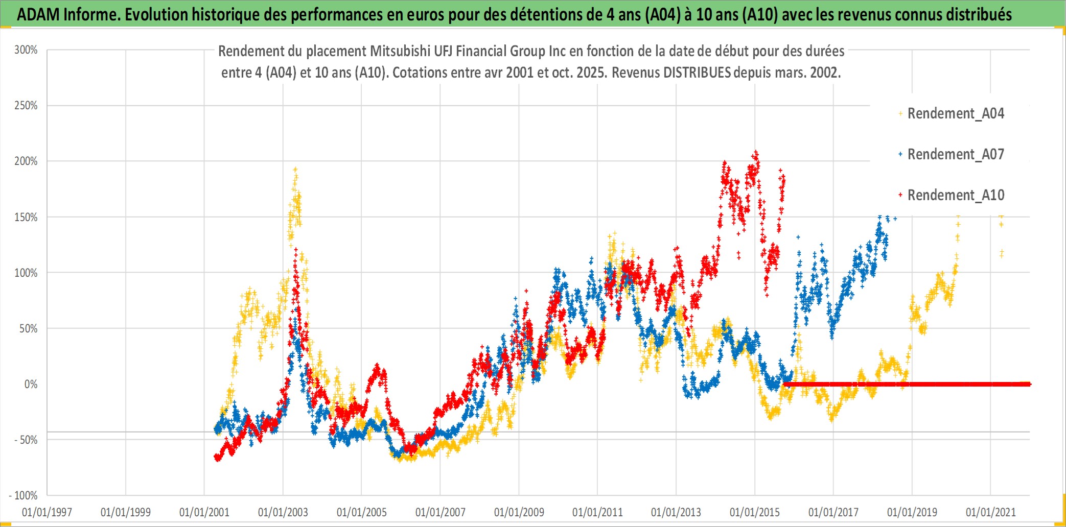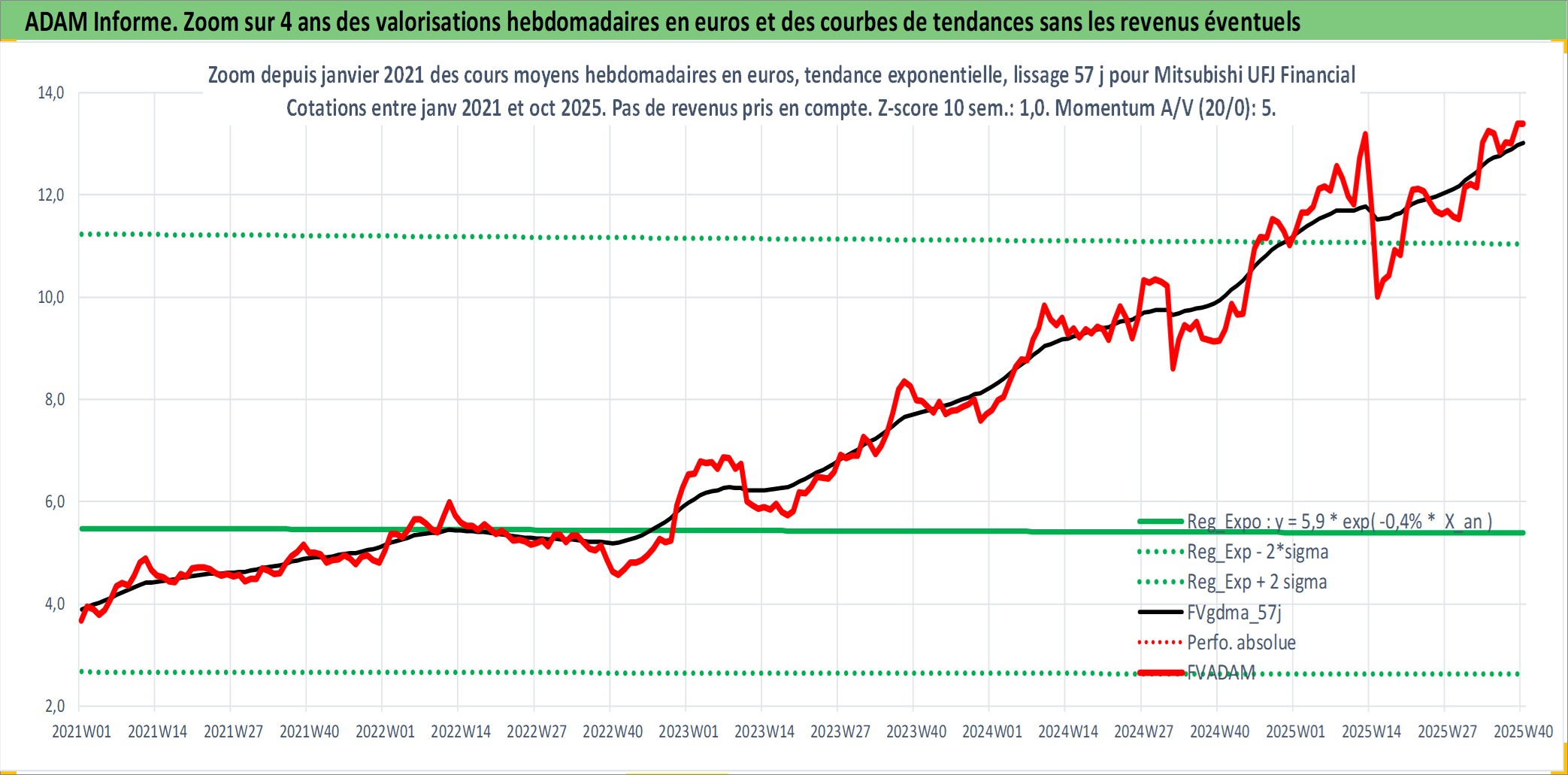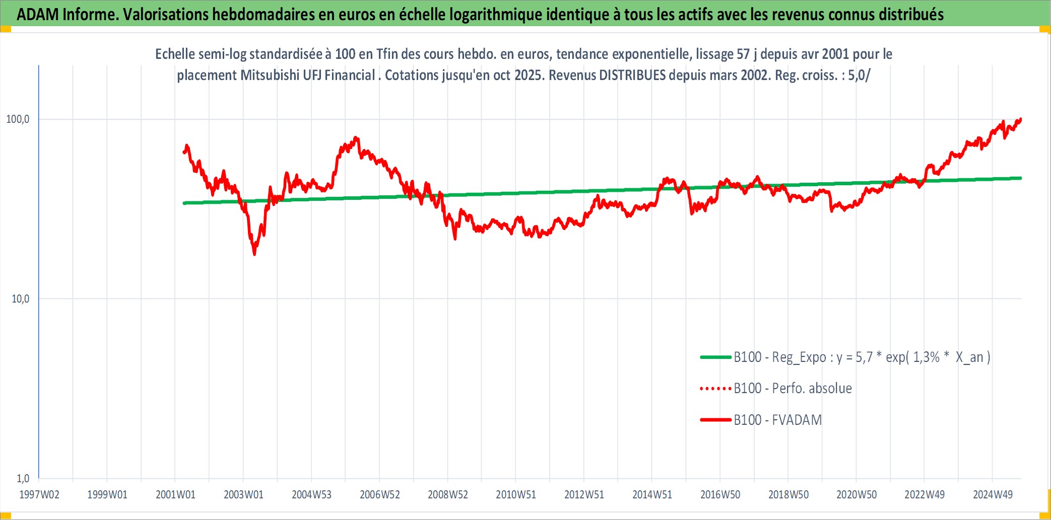 Site dédié aux investisseursPage dédiée sur site financeAnalyse des valorisations hebdomadaires de l'action Mitsubishi UFJ Financial Group Inc. Cet actif est cote en JPY. Les valorisations sont en contrevaleur EURO et couvrent les semaines 2001W14 a 2025W40. Les revenus de cet actif financier sont pris en compte depuis la semaine 2002W13. La note globale ESG de cet actif est estimee a 11.0 (apres rebasage entre 0 et 20).