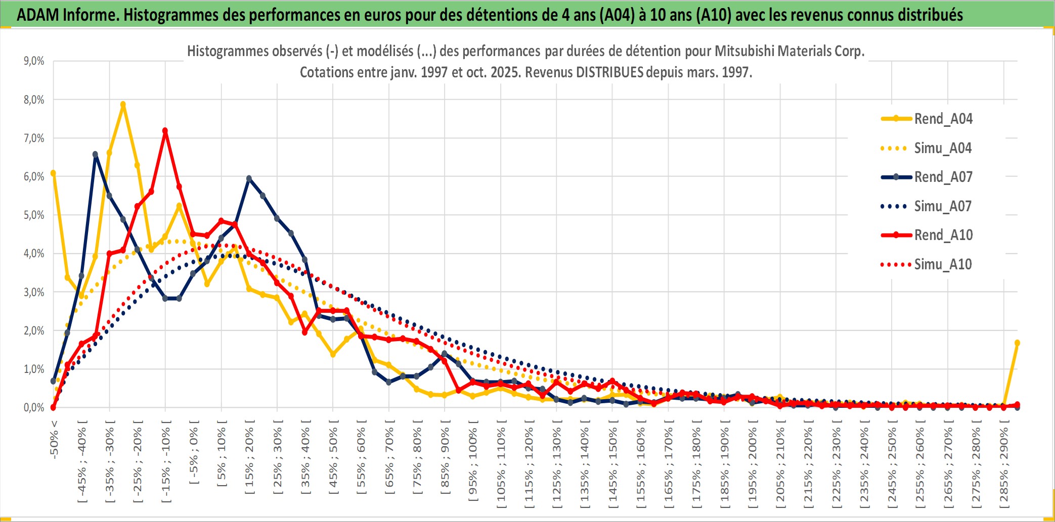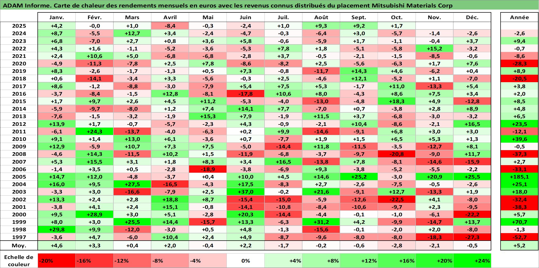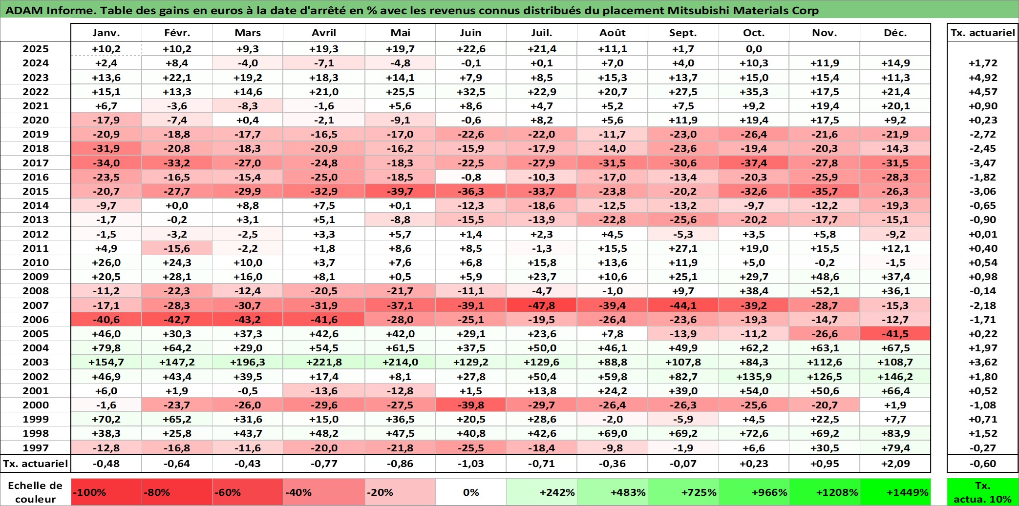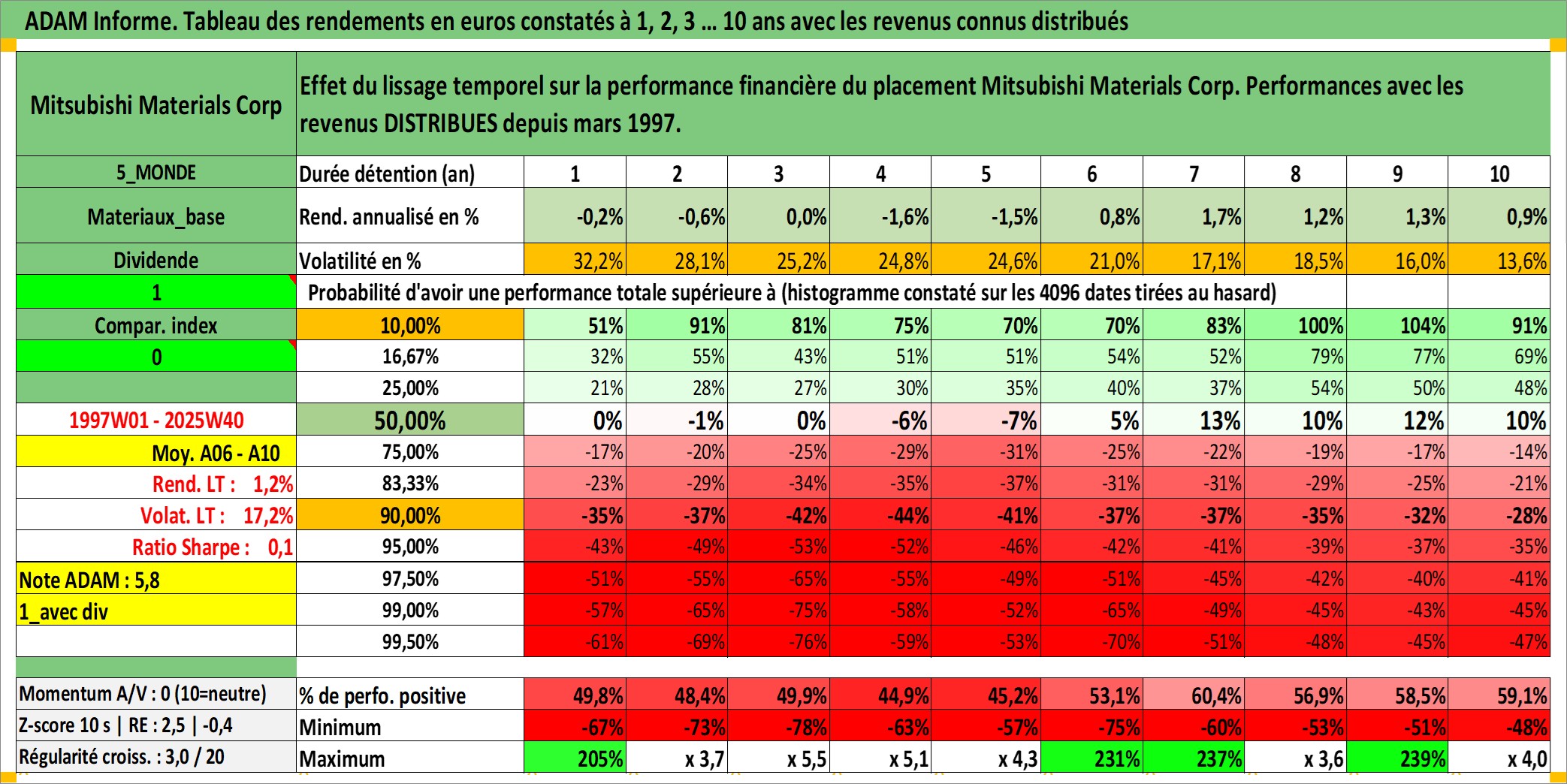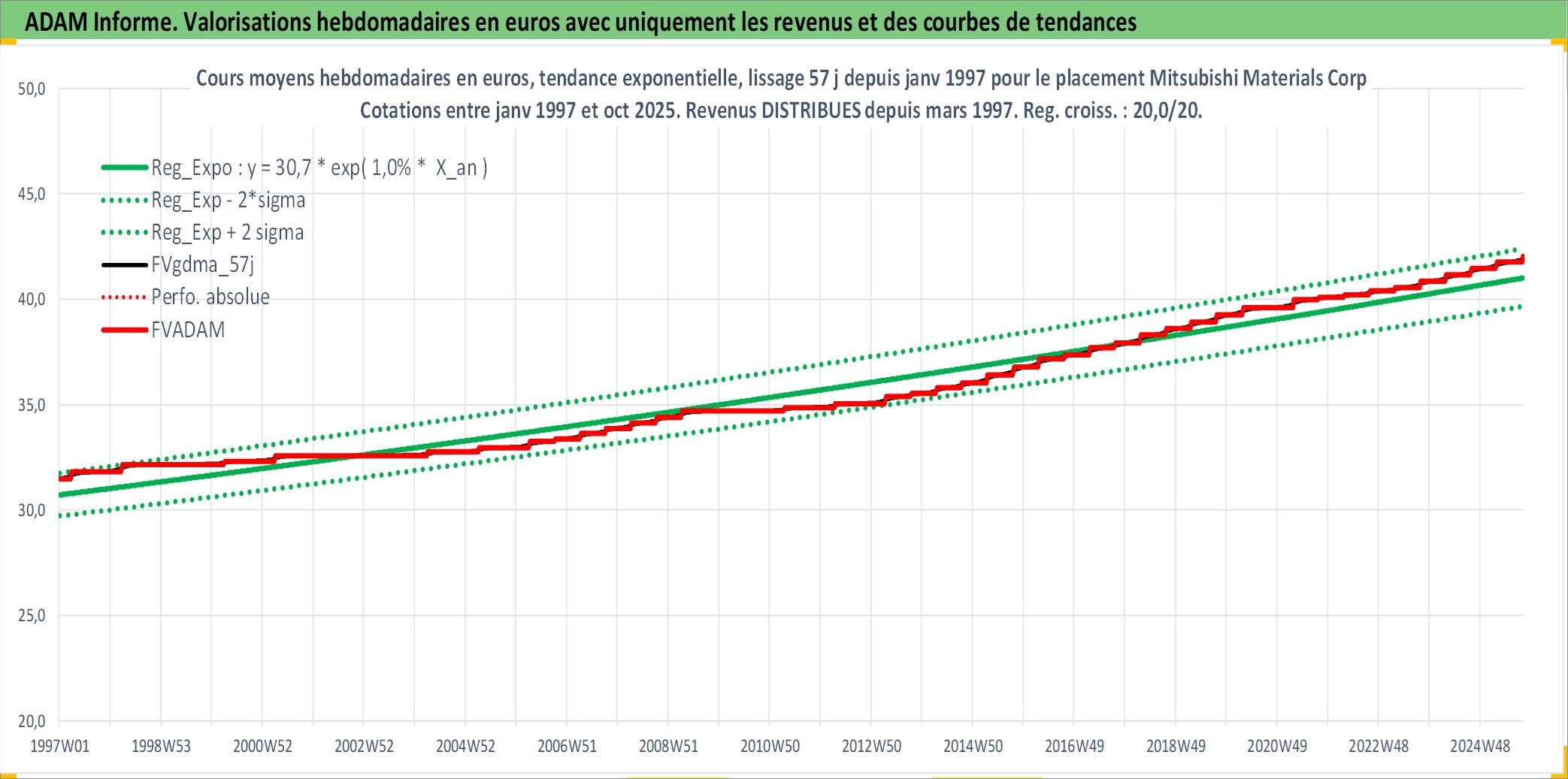 Site dédié aux investisseursPage dédiée sur site financeAnalyse des valorisations hebdomadaires de l'action Mitsubishi Materials Corp. Cet actif est cote en JPY. Les valorisations sont en contrevaleur EURO et couvrent les semaines 1997W01 a 2025W40. Les revenus de cet actif financier sont pris en compte depuis la semaine 1997W13. La note ESG de cet actif n'est pas connue.