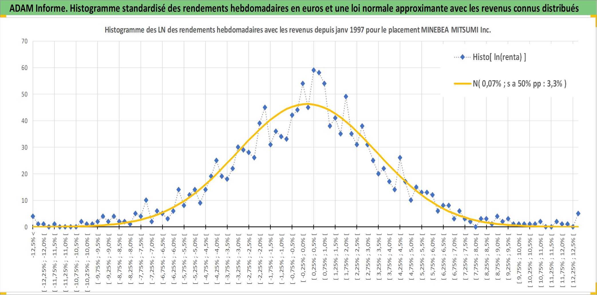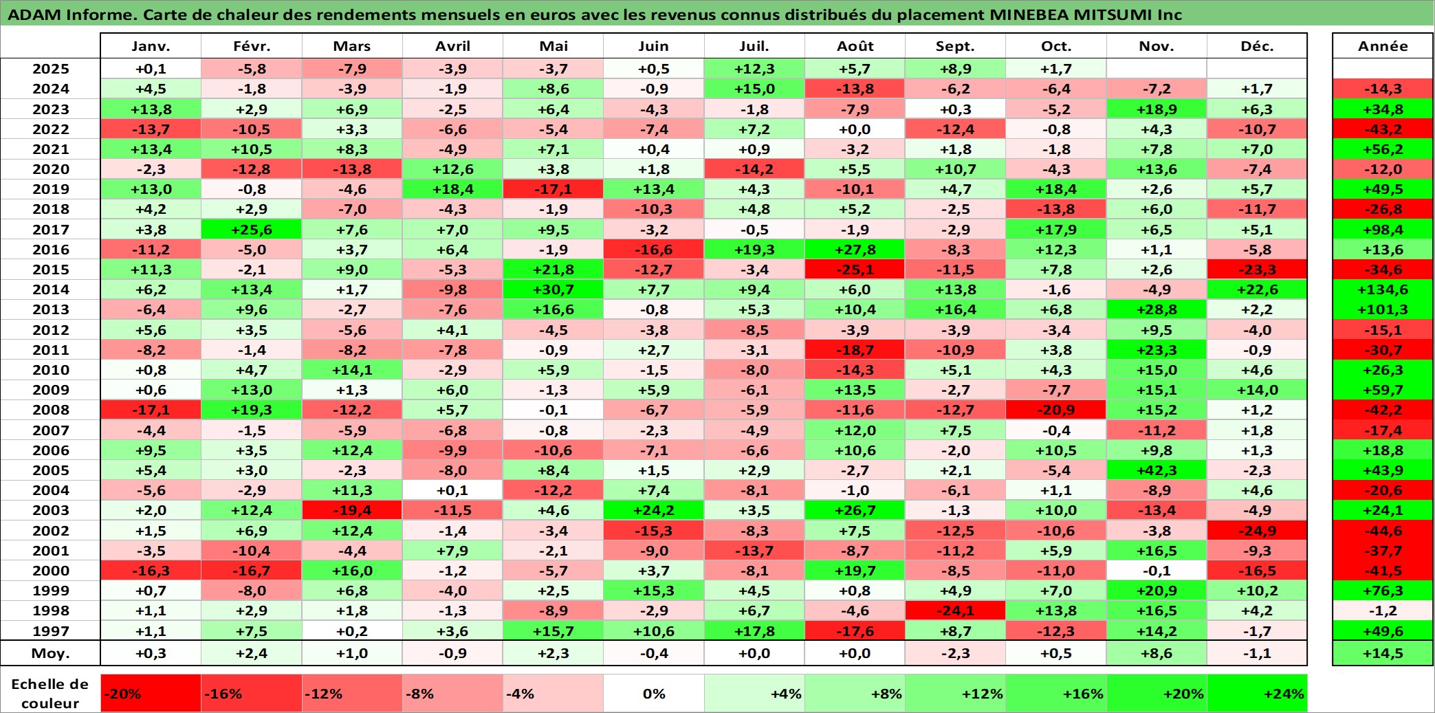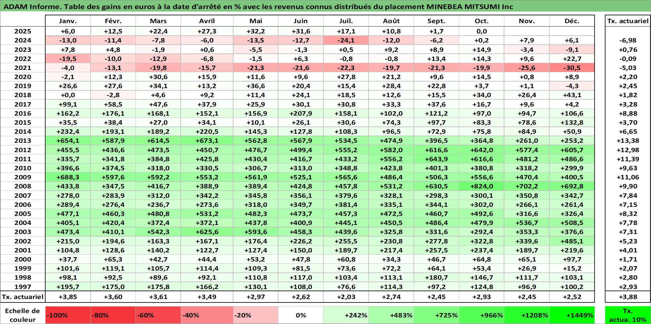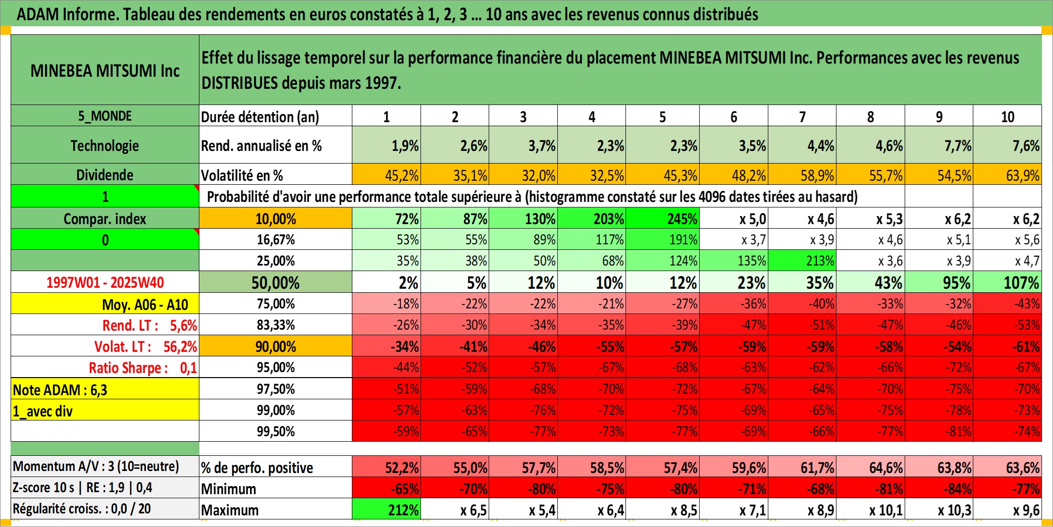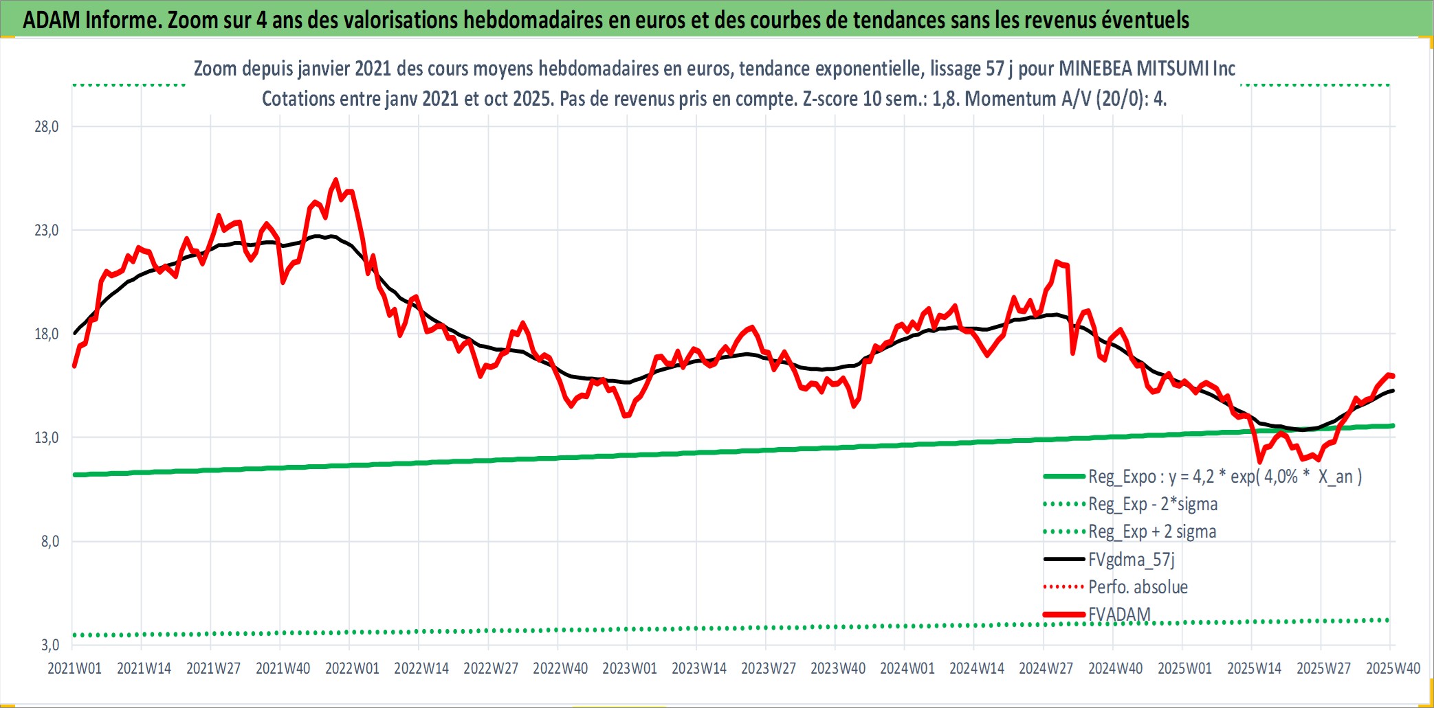 Site dédié aux investisseursPage dédiée sur site financeAnalyse des valorisations hebdomadaires de l'action MINEBEA MITSUMI Inc. Cet actif est cote en JPY. Les valorisations sont en contrevaleur EURO et couvrent les semaines 1997W01 a 2025W40. Les revenus de cet actif financier sont pris en compte depuis la semaine 1997W13. La note globale ESG de cet actif est estimee a 9.0 (apres rebasage entre 0 et 20).