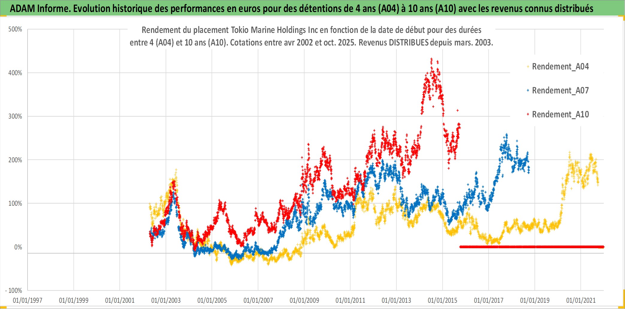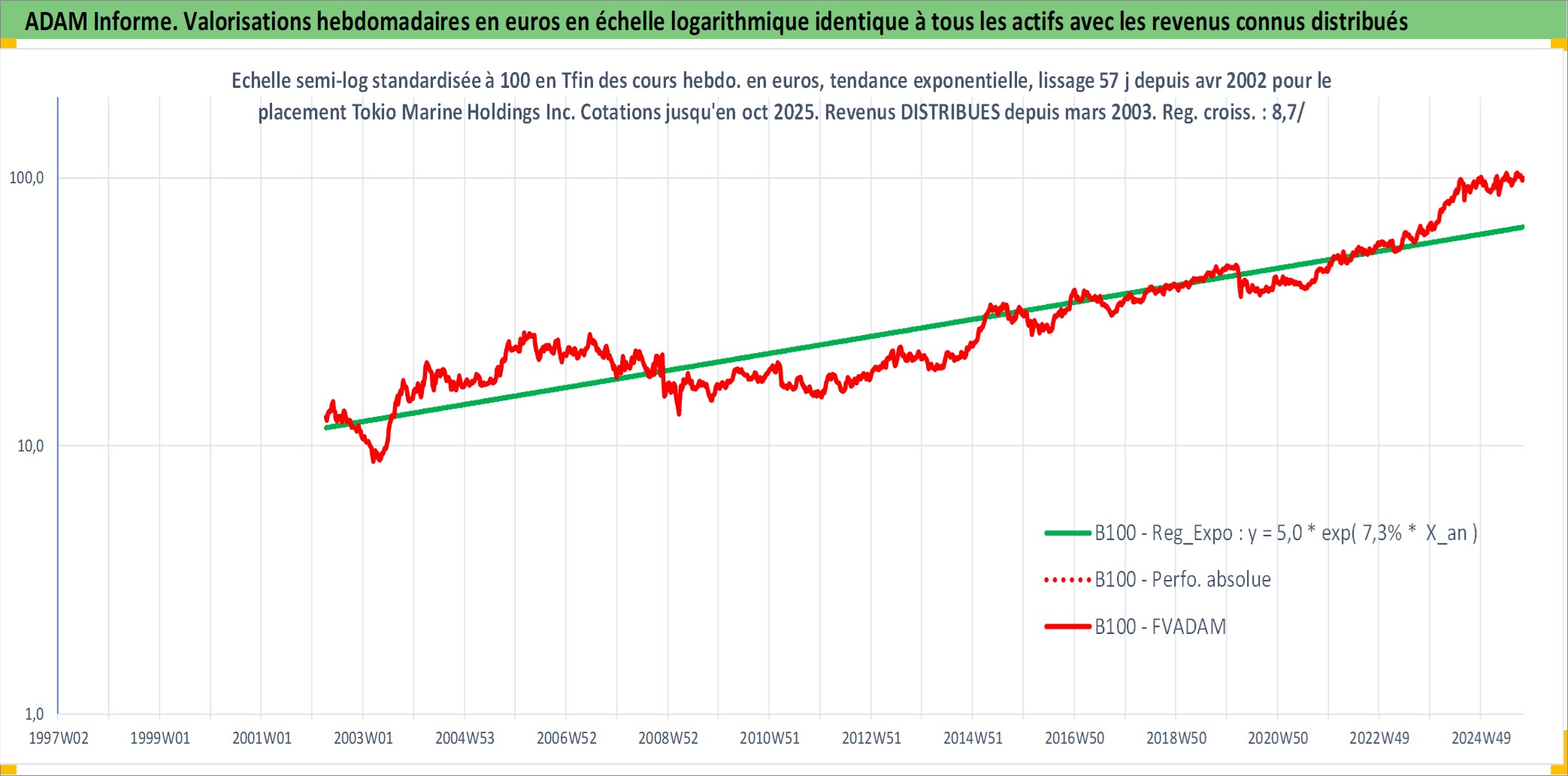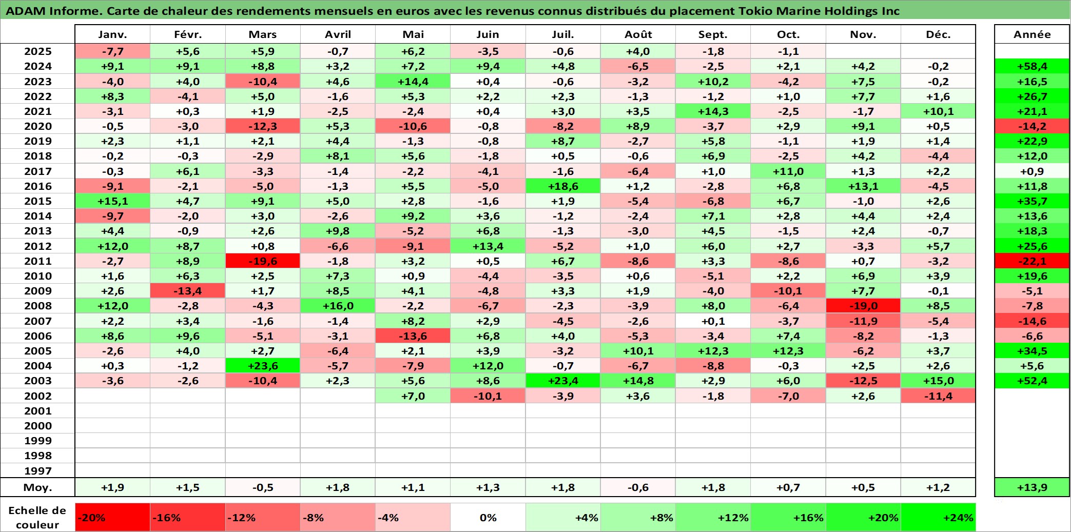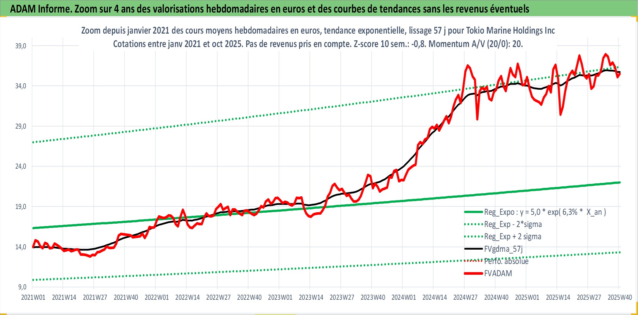 Site dédié aux investisseursPage dédiée sur site financeAnalyse des valorisations hebdomadaires de l'action Tokio Marine Holdings Inc. Cet actif est cote en JPY. Les valorisations sont en contrevaleur EURO et couvrent les semaines 2002W15 a 2025W40. Les revenus de cet actif financier sont pris en compte depuis la semaine 2003W13. La note globale ESG de cet actif est estimee a 7.0 (apres rebasage entre 0 et 20).