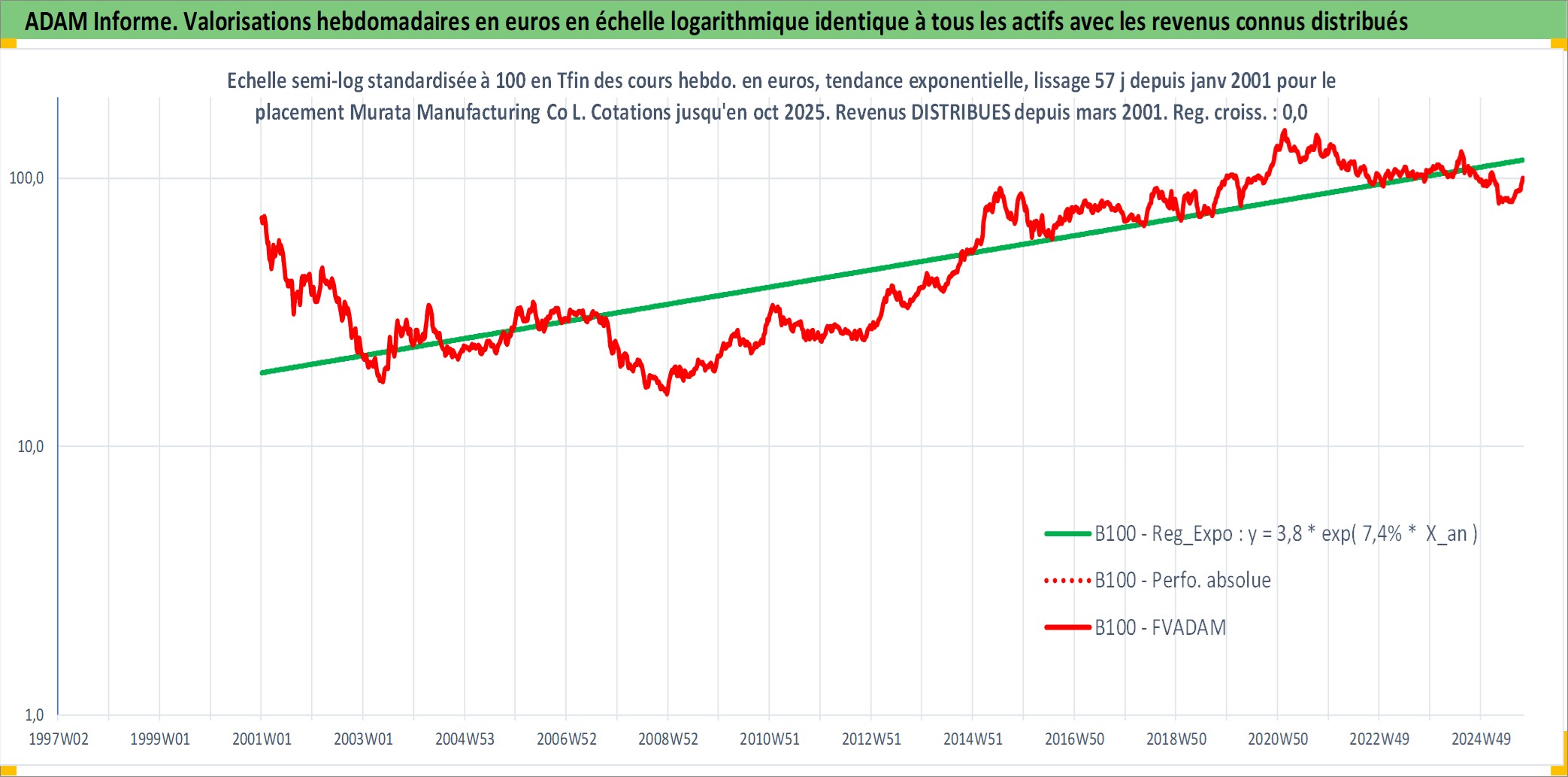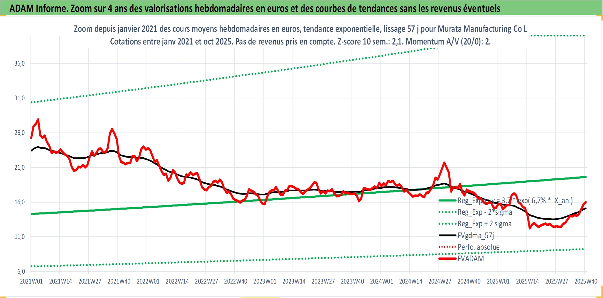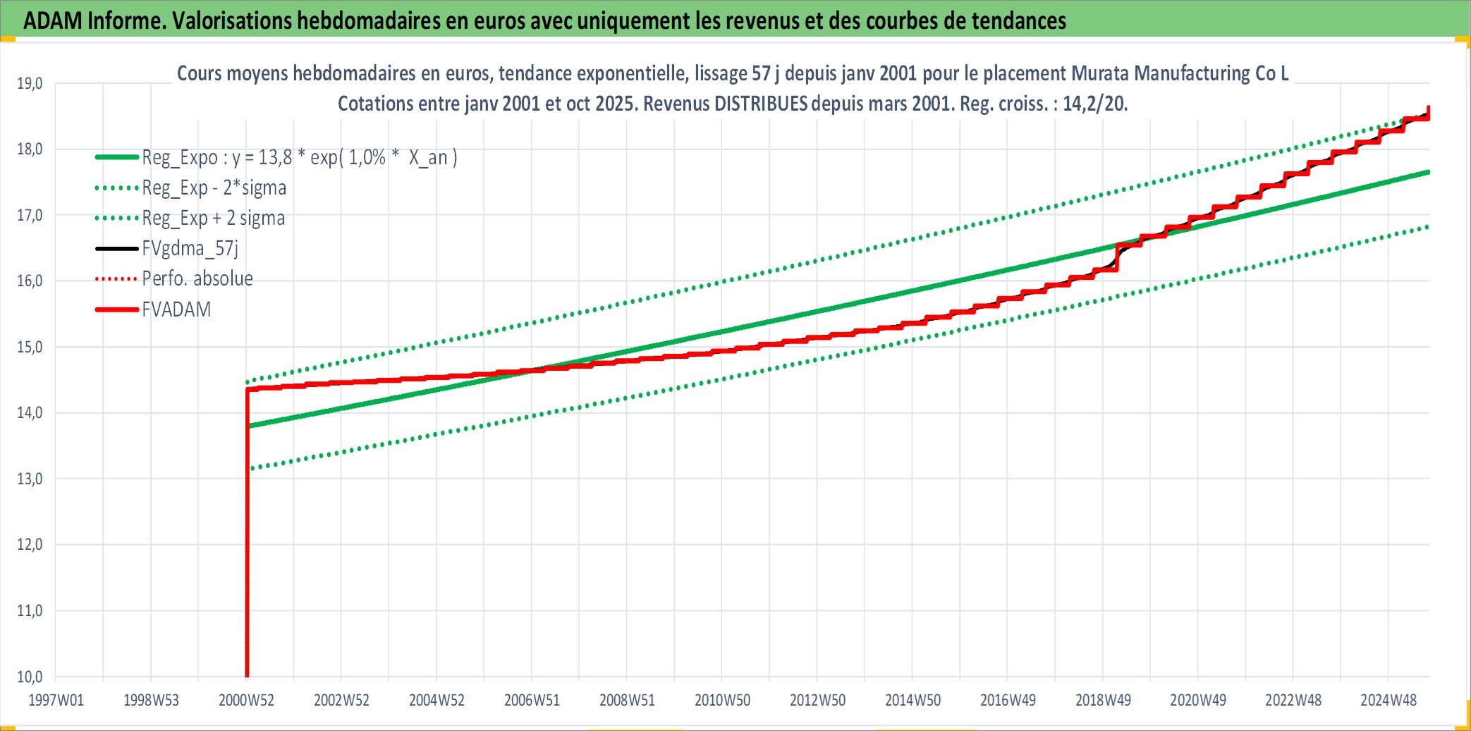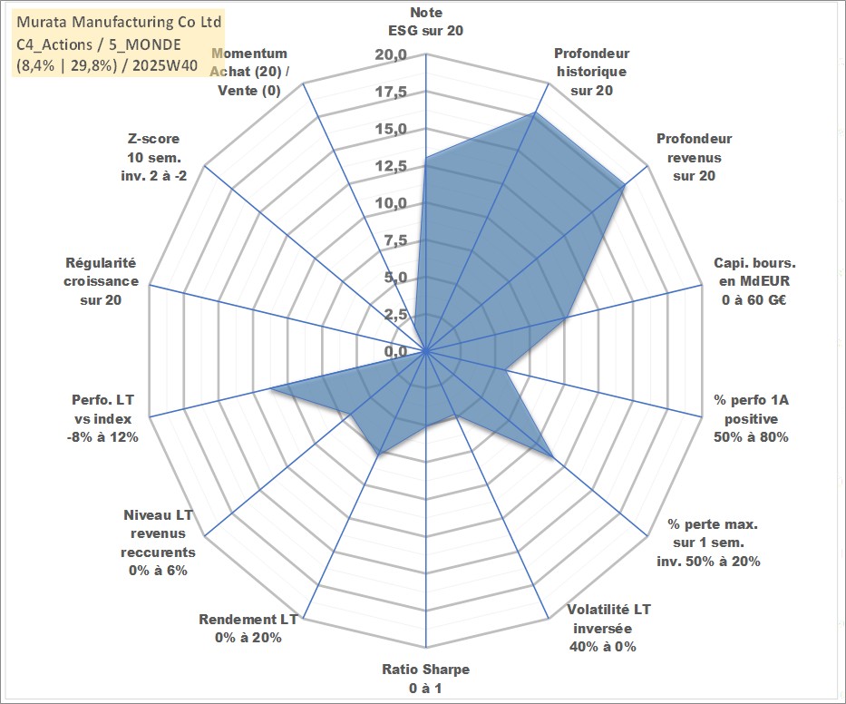 Site dédié aux investisseursPage dédiée sur site financeAnalyse des valorisations hebdomadaires de l'action Murata Manufacturing Co Ltd. Cet actif est cote en JPY. Les valorisations sont en contrevaleur EURO et couvrent les semaines 2001W01 a 2025W40. Les revenus de cet actif financier sont pris en compte depuis la semaine 2001W13. La note globale ESG de cet actif est estimee a 13.0 (apres rebasage entre 0 et 20).