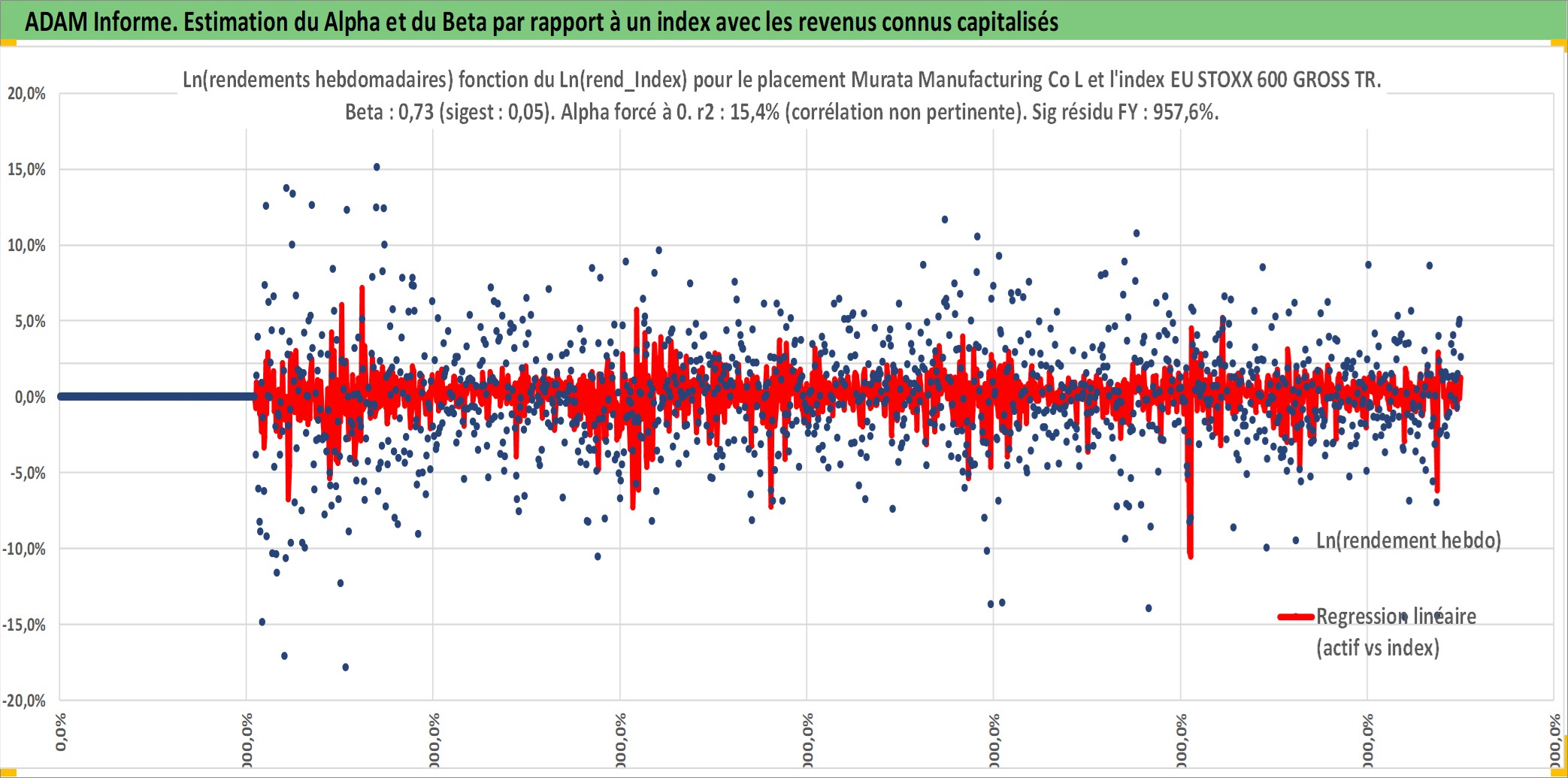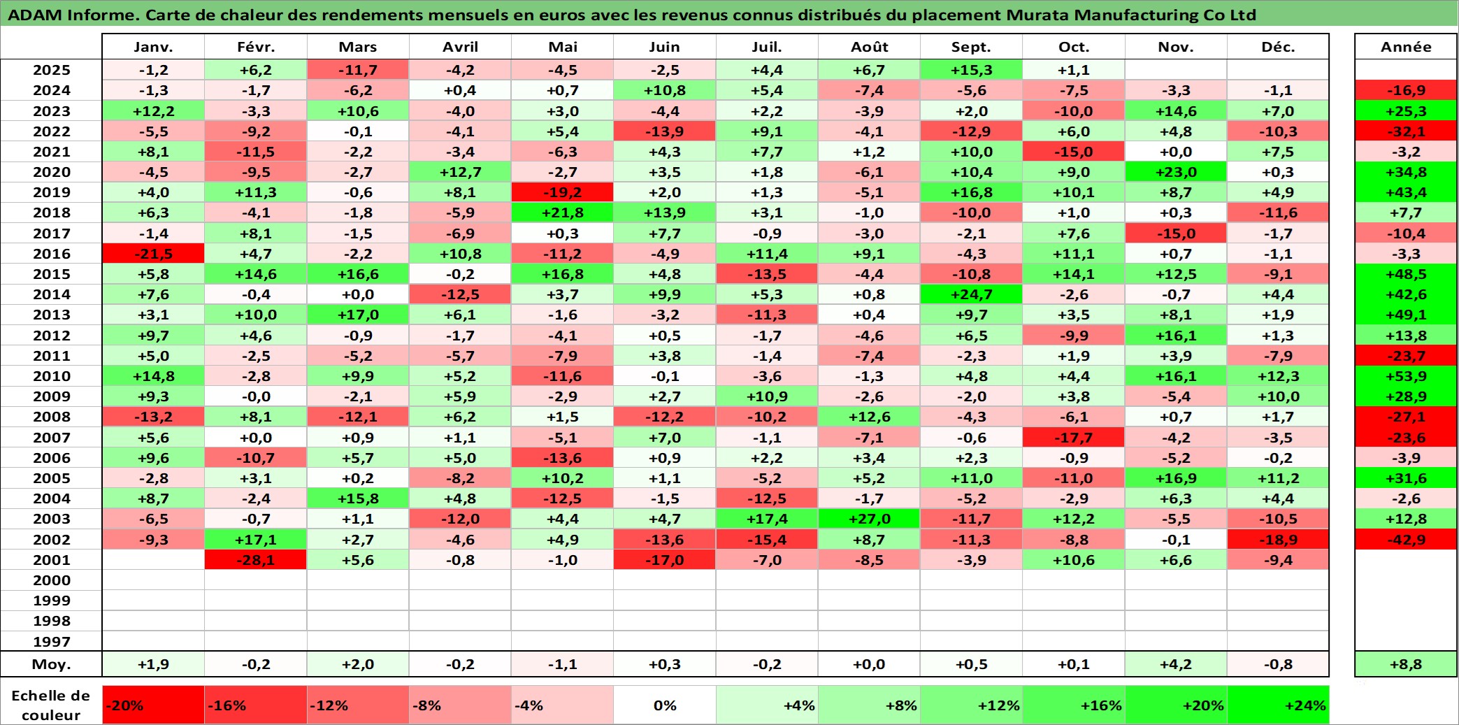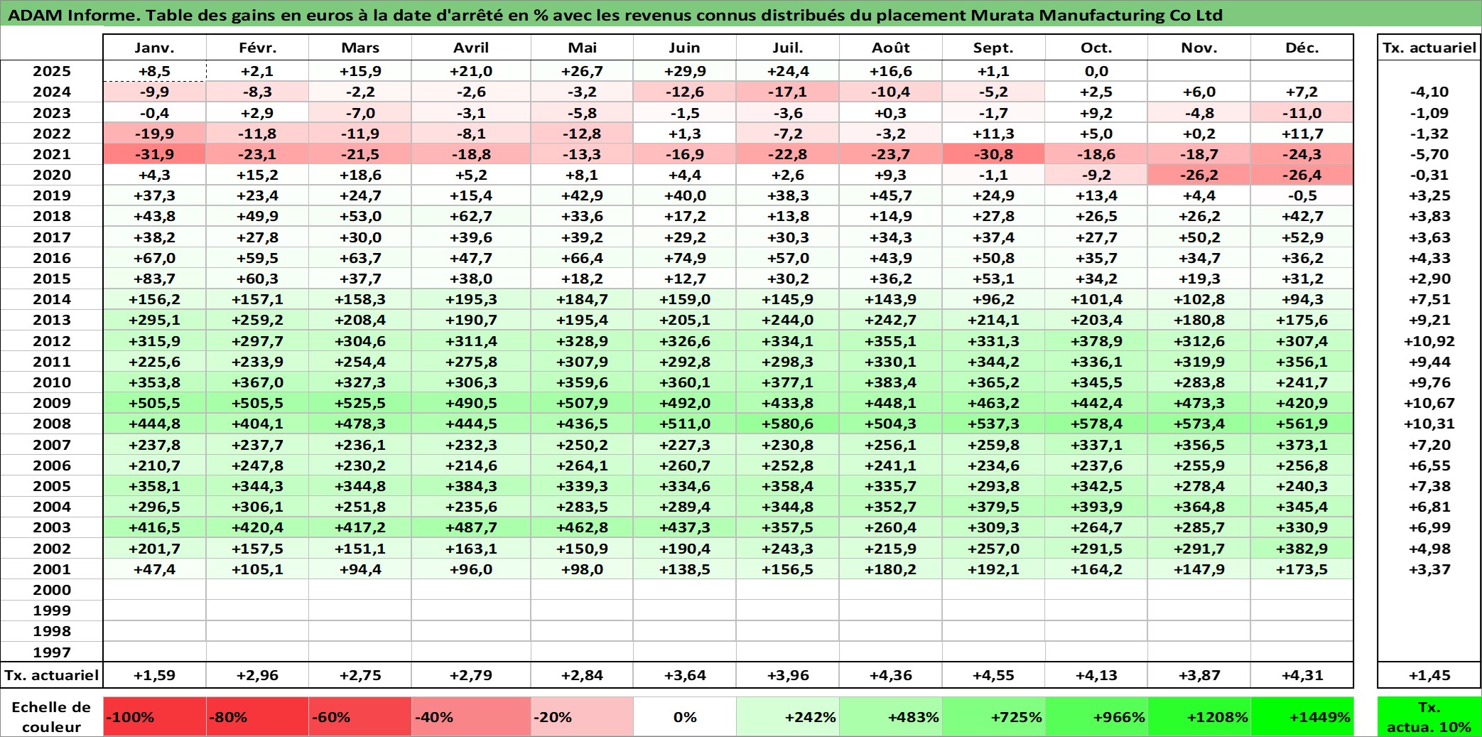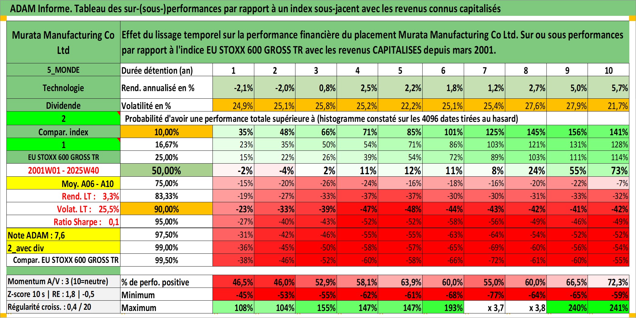 Site dédié aux investisseursPage dédiée sur site financeAnalyse des valorisations hebdomadaires de l'action Murata Manufacturing Co Ltd. Cet actif est cote en JPY. Les valorisations sont en contrevaleur EURO et couvrent les semaines 2001W01 a 2025W40. Les revenus de cet actif financier sont pris en compte depuis la semaine 2001W13. La note globale ESG de cet actif est estimee a 13.0 (apres rebasage entre 0 et 20).
