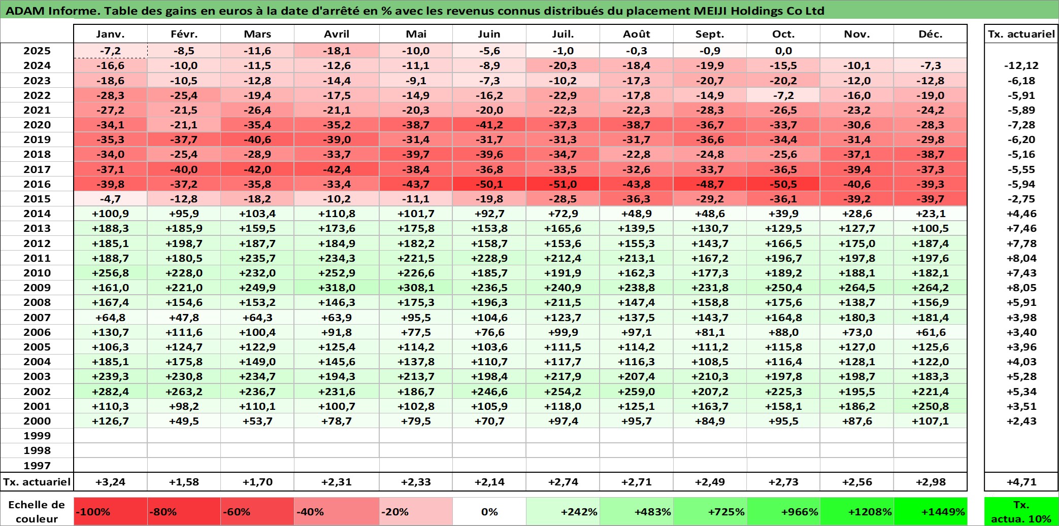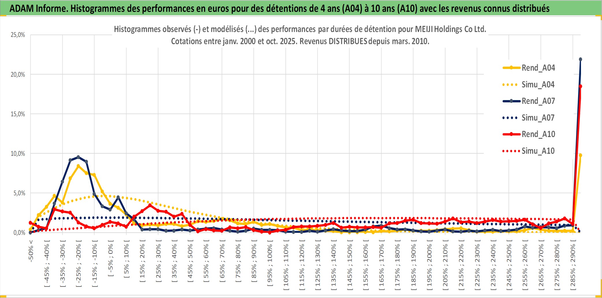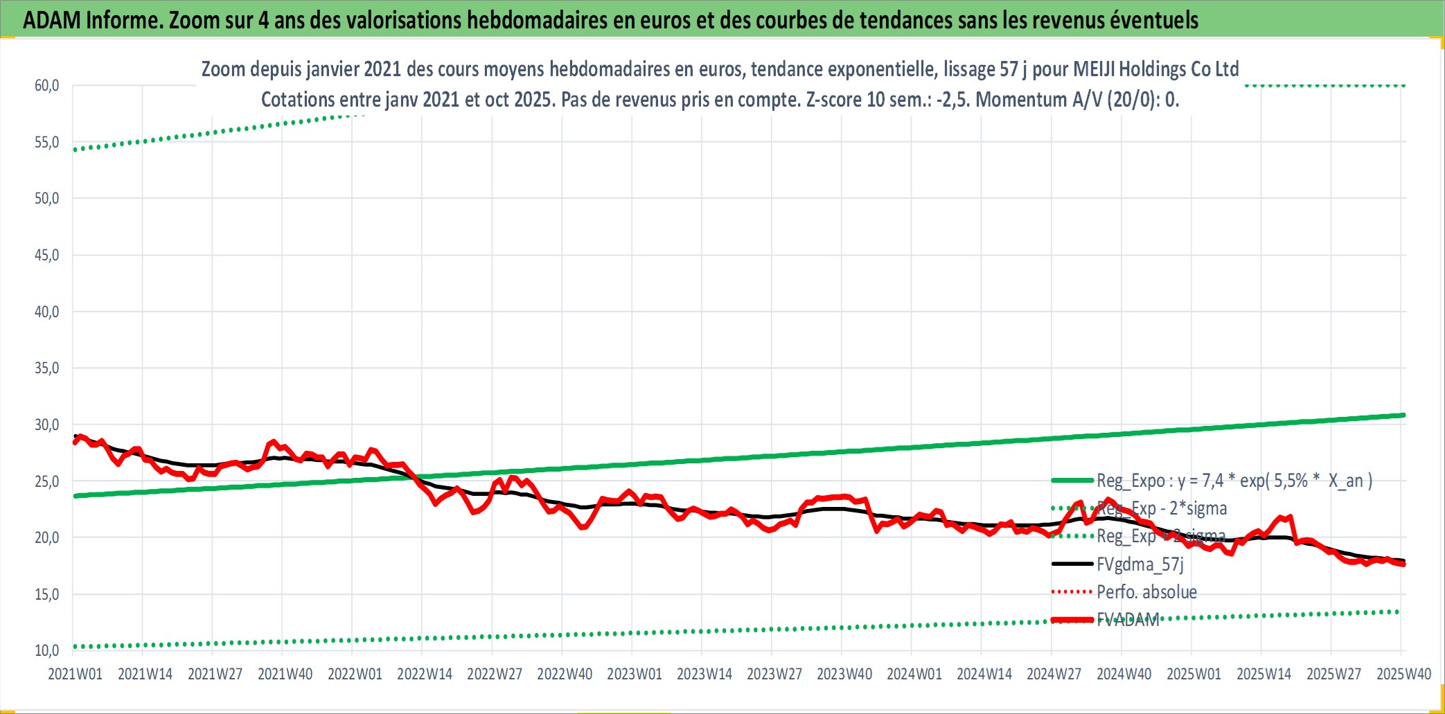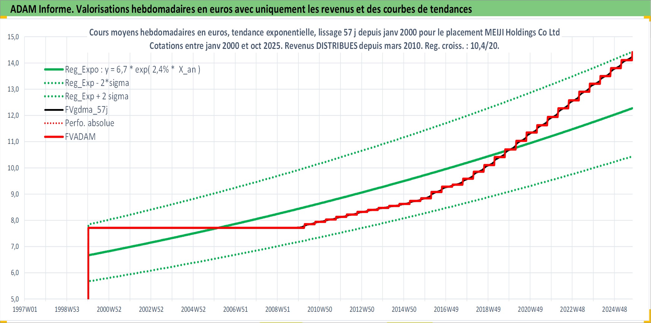 Site dédié aux investisseursPage dédiée sur site financeAnalyse des valorisations hebdomadaires de l'action MEIJI Holdings Co Ltd. Cet actif est cote en JPY. Les valorisations sont en contrevaleur EURO et couvrent les semaines 2000W01 a 2025W40. Les revenus de cet actif financier sont pris en compte depuis la semaine 2010W13. La note globale ESG de cet actif est estimee a 8.0 (apres rebasage entre 0 et 20).