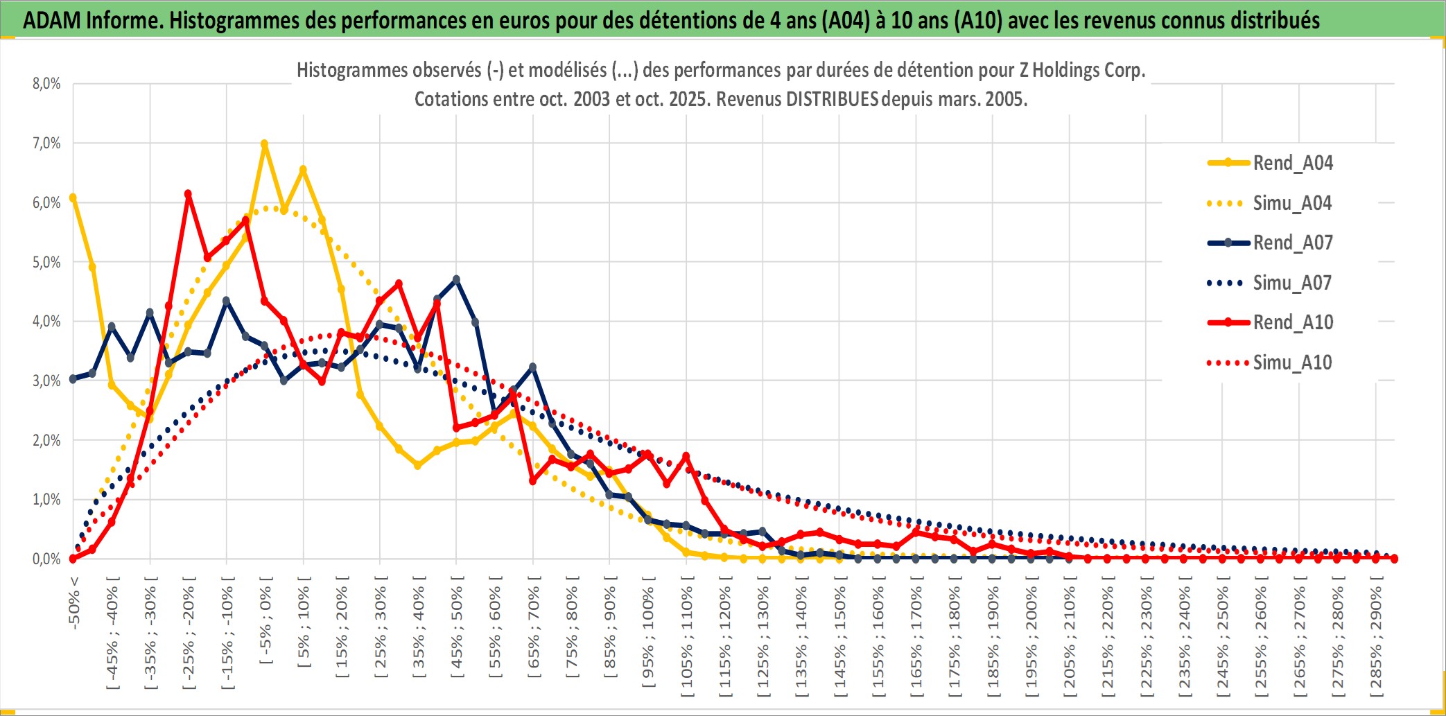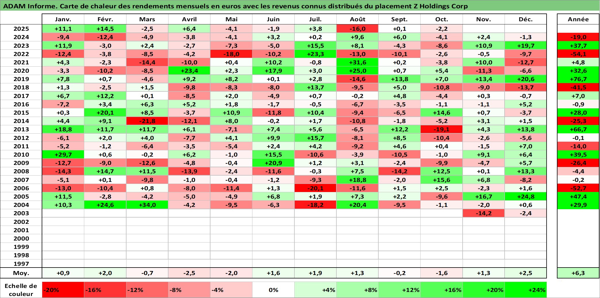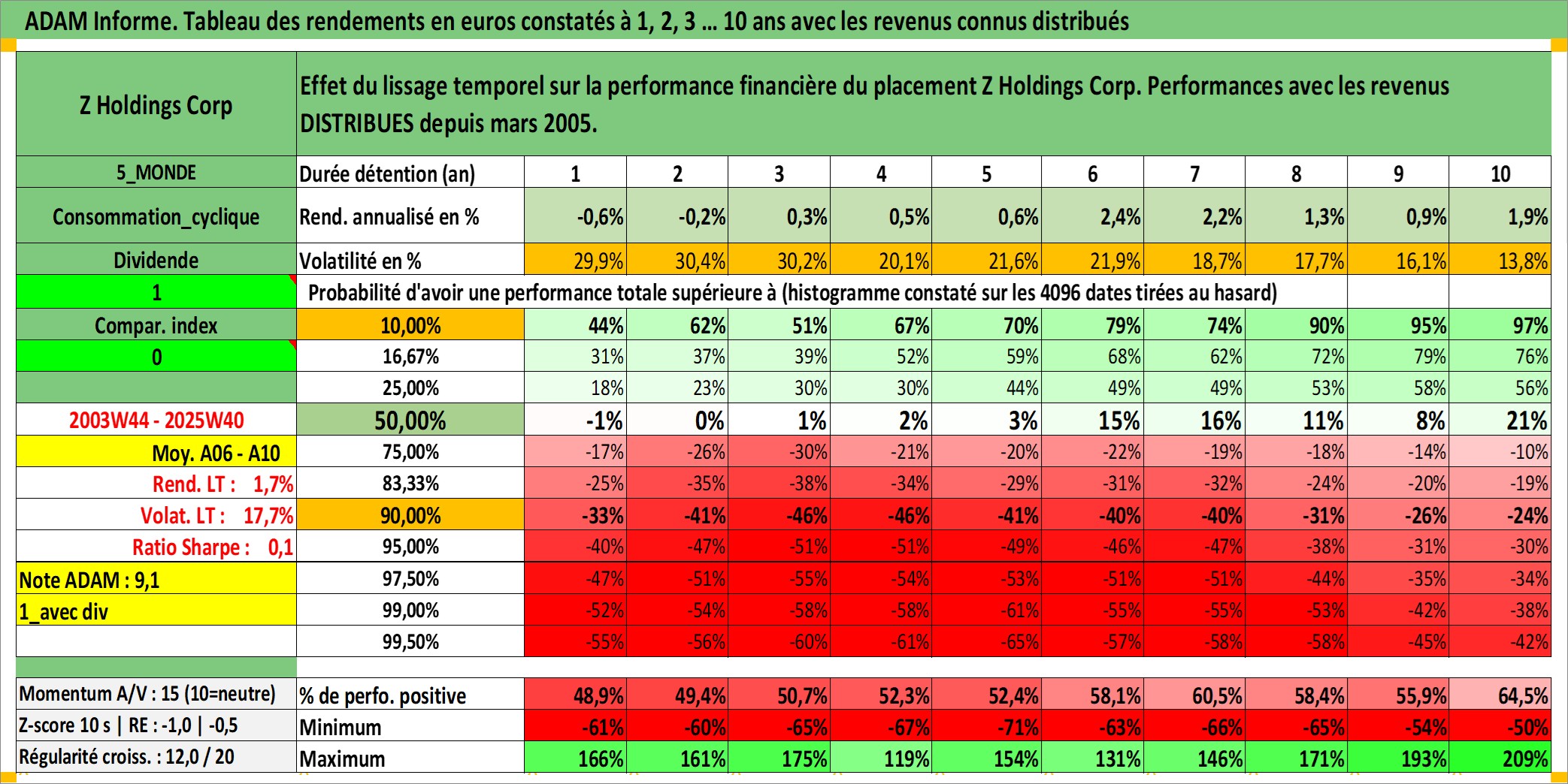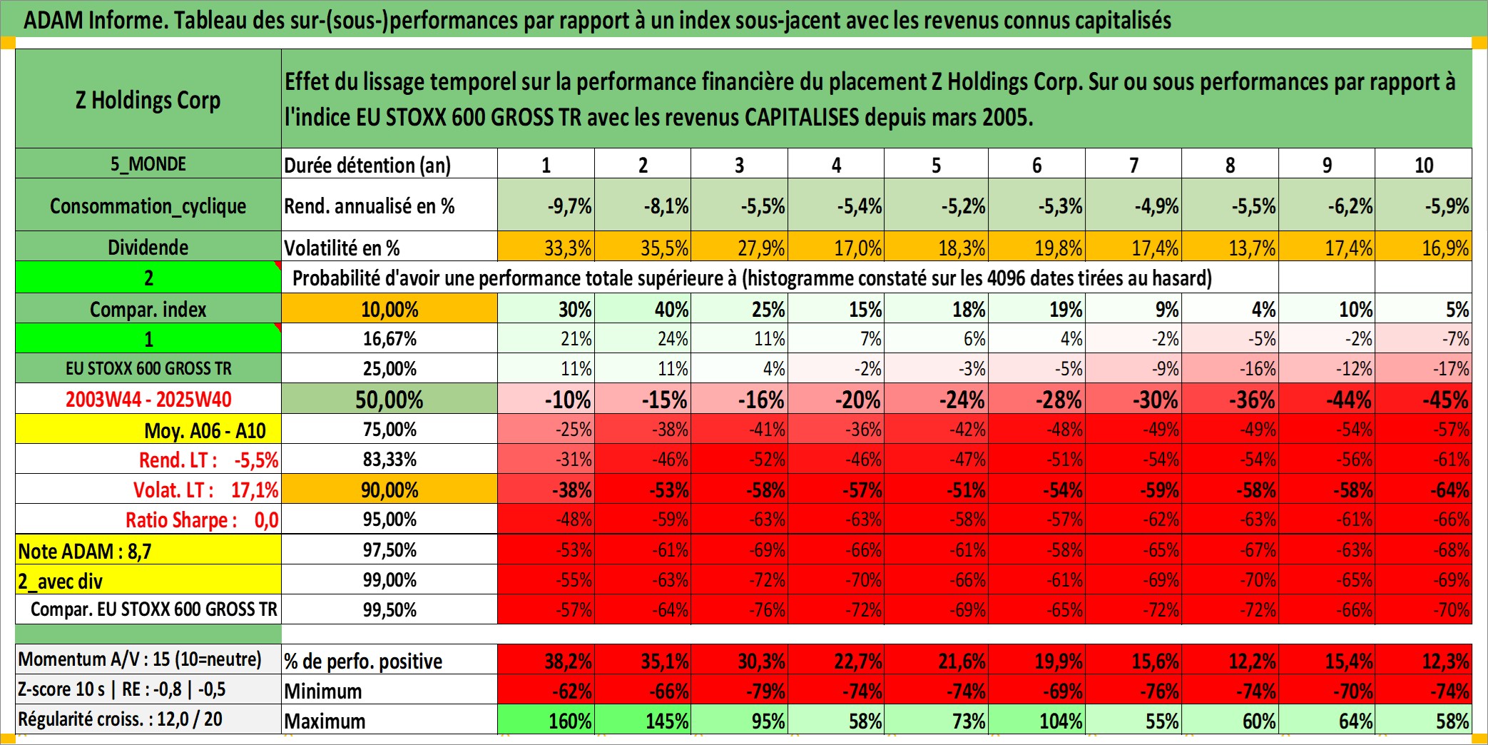 Site dédié aux investisseursPage dédiée sur site financeAnalyse des valorisations hebdomadaires de l'action Z Holdings Corp. Cet actif est cote en JPY. Les valorisations sont en contrevaleur EURO et couvrent les semaines 2003W44 a 2025W40. Les revenus de cet actif financier sont pris en compte depuis la semaine 2005W13. La note globale ESG de cet actif est estimee a 10.0 (apres rebasage entre 0 et 20).