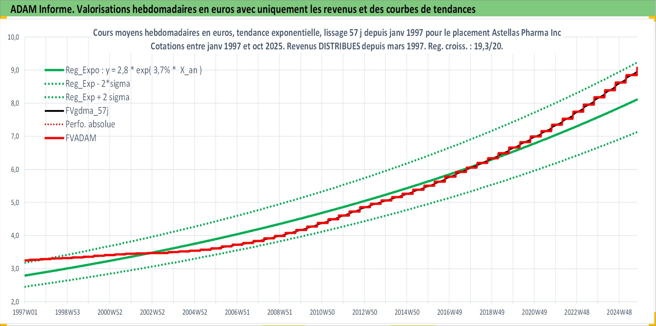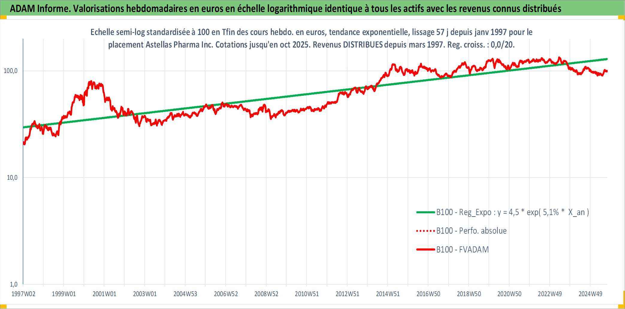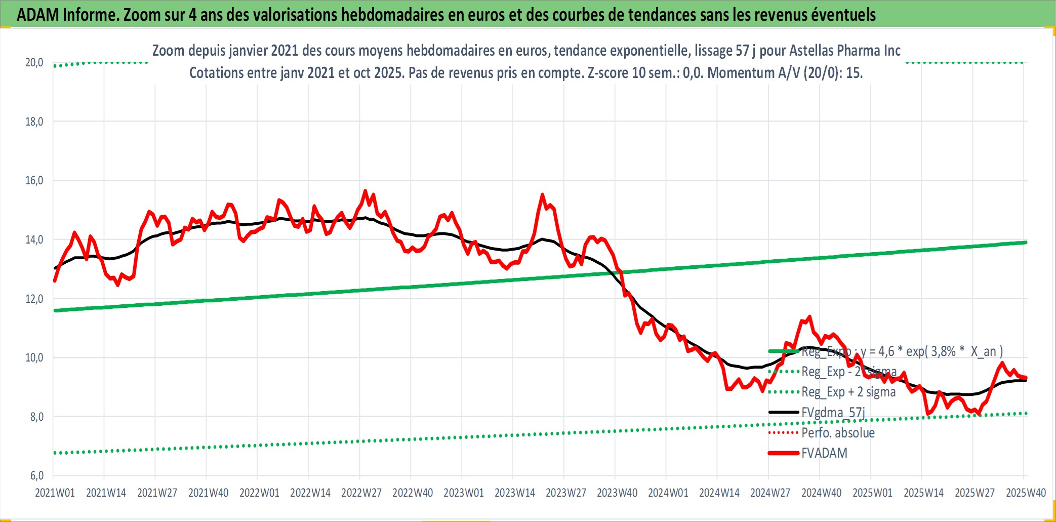 Site dédié aux investisseursPage dédiée sur site financeAnalyse des valorisations hebdomadaires de l'action Astellas Pharma Inc. Cet actif est cote en JPY. Les valorisations sont en contrevaleur EURO et couvrent les semaines 1997W01 a 2025W40. Les revenus de cet actif financier sont pris en compte depuis la semaine 1997W13. La note globale ESG de cet actif est estimee a 10.0 (apres rebasage entre 0 et 20).
