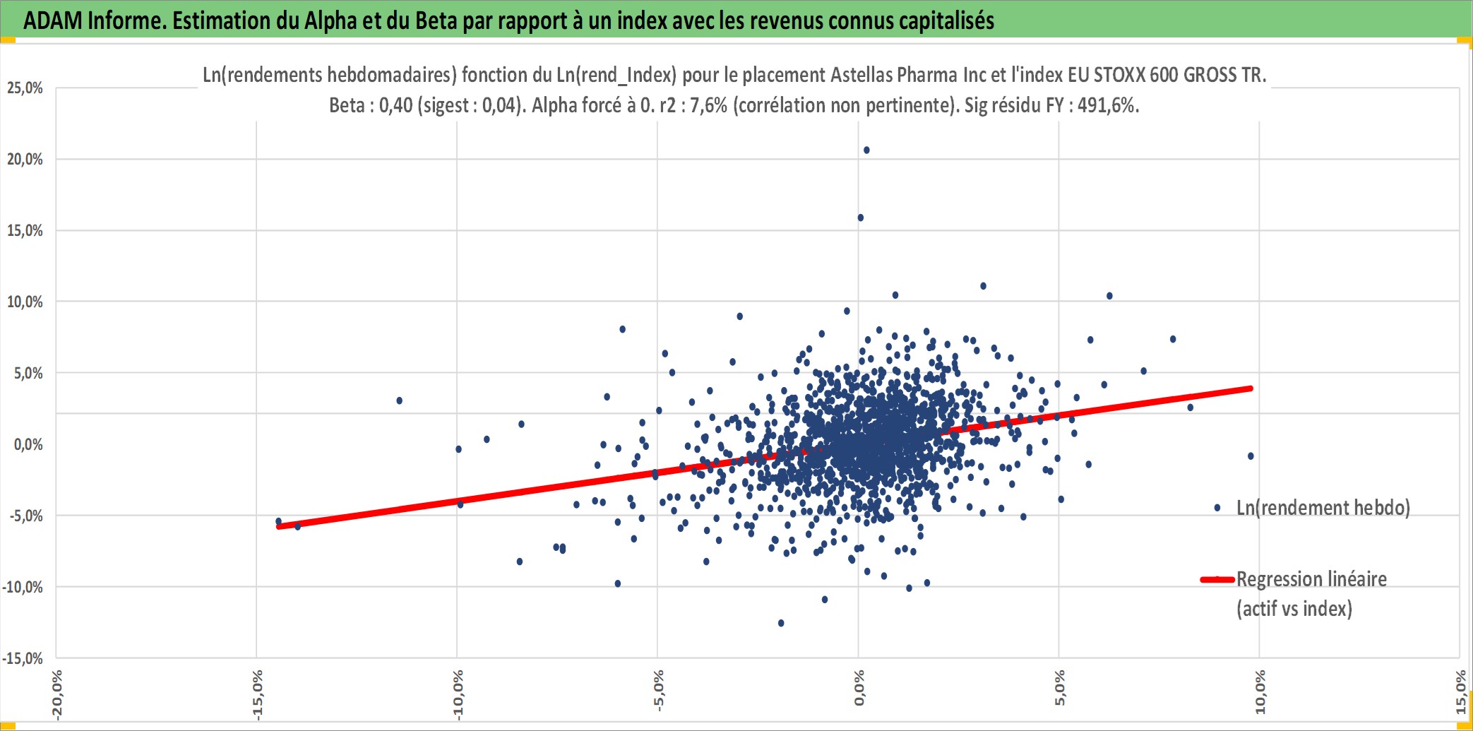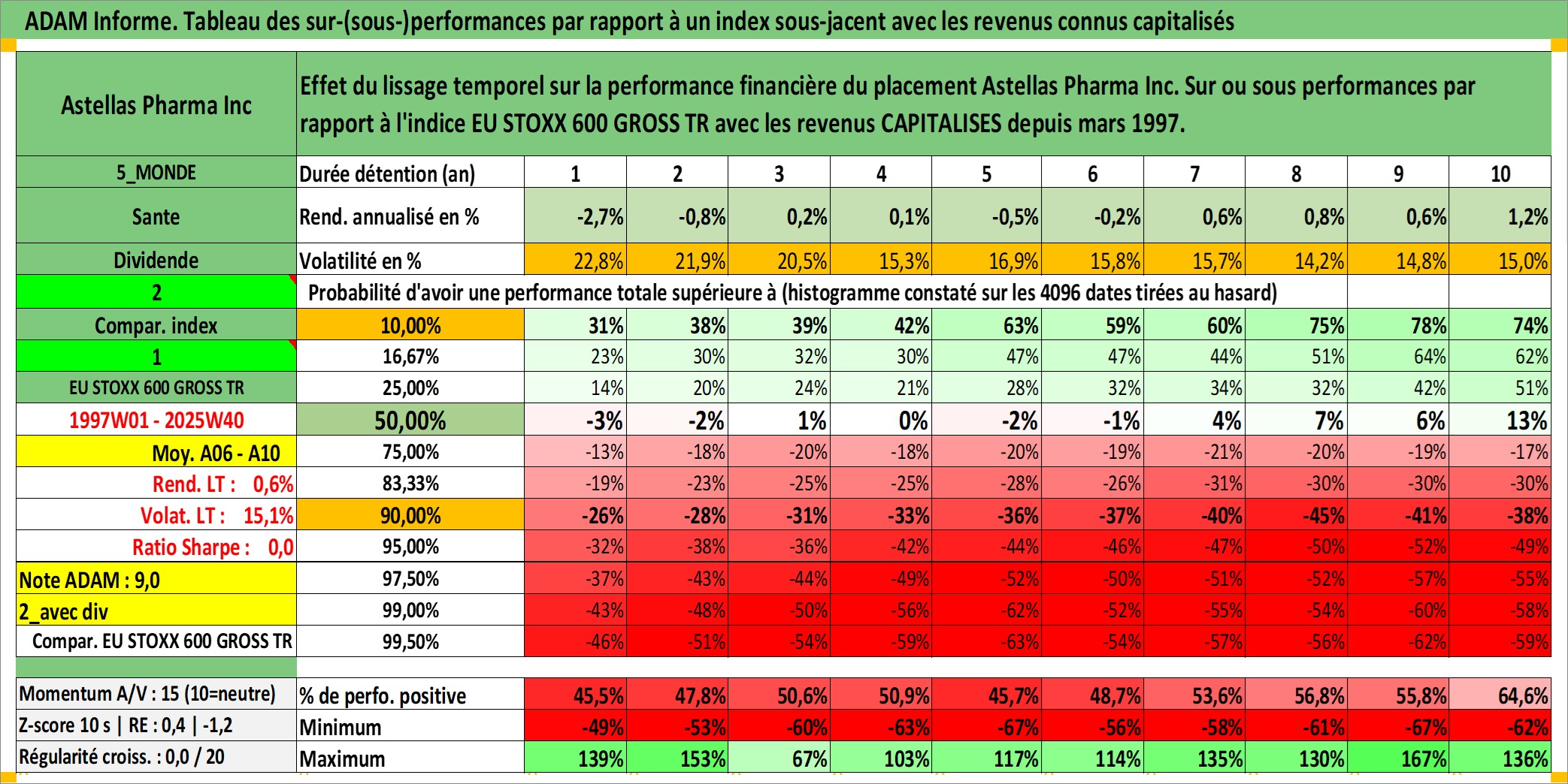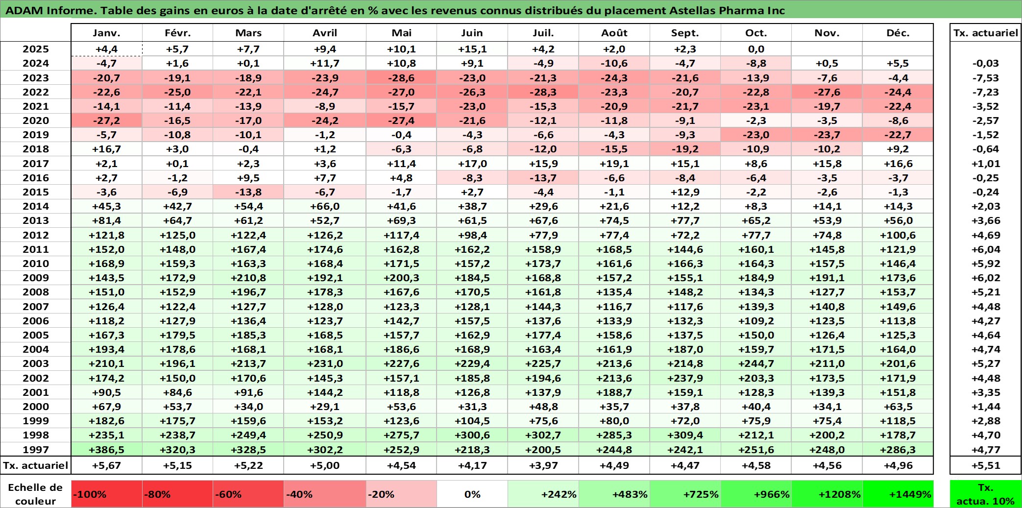Site dédié aux investisseursPage dédiée sur site financeAnalyse des valorisations hebdomadaires de l'action Astellas Pharma Inc. Cet actif est cote en JPY. Les valorisations sont en contrevaleur EURO et couvrent les semaines 1997W01 a 2025W40. Les revenus de cet actif financier sont pris en compte depuis la semaine 1997W13. La note globale ESG de cet actif est estimee a 10.0 (apres rebasage entre 0 et 20).