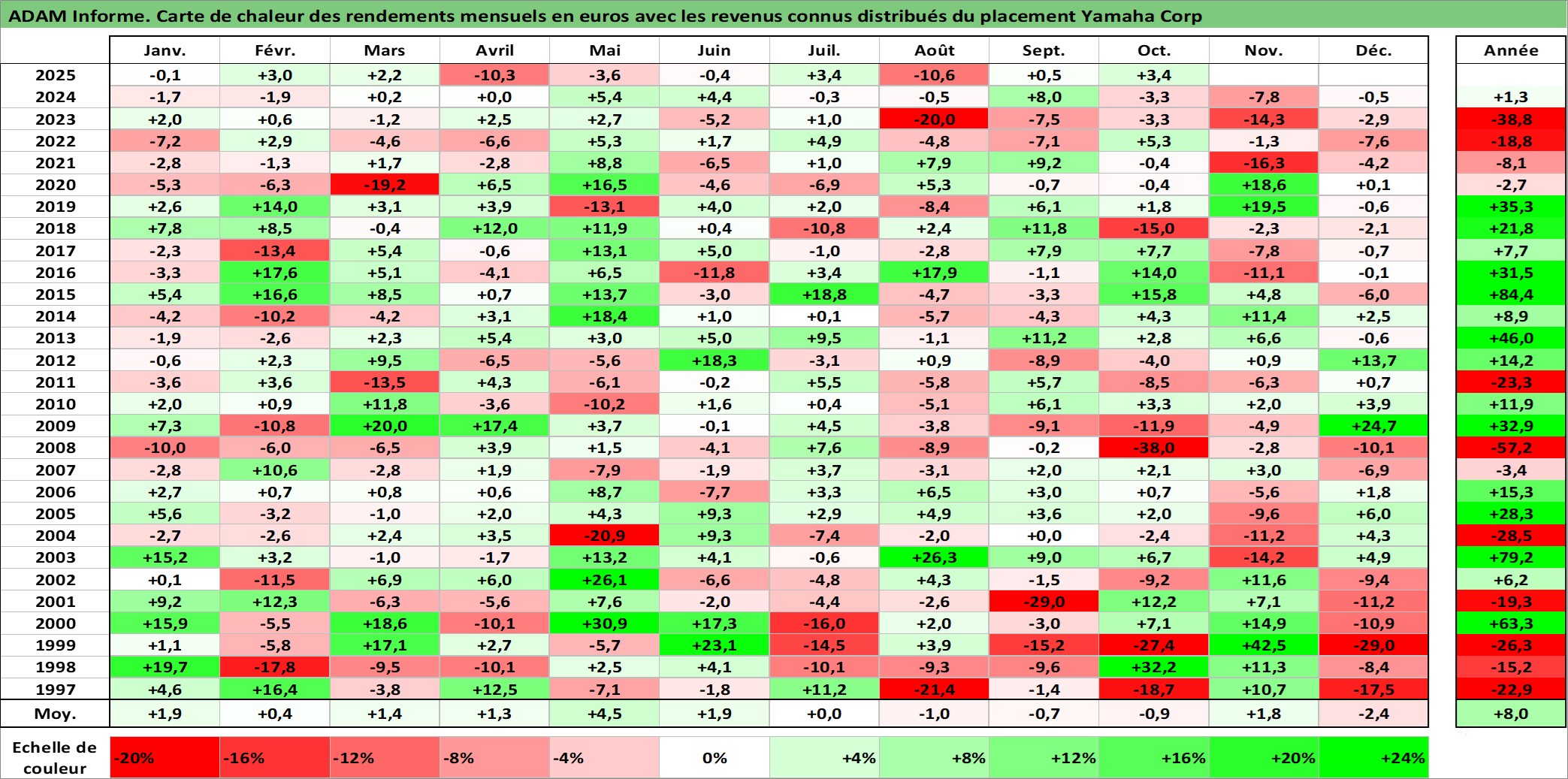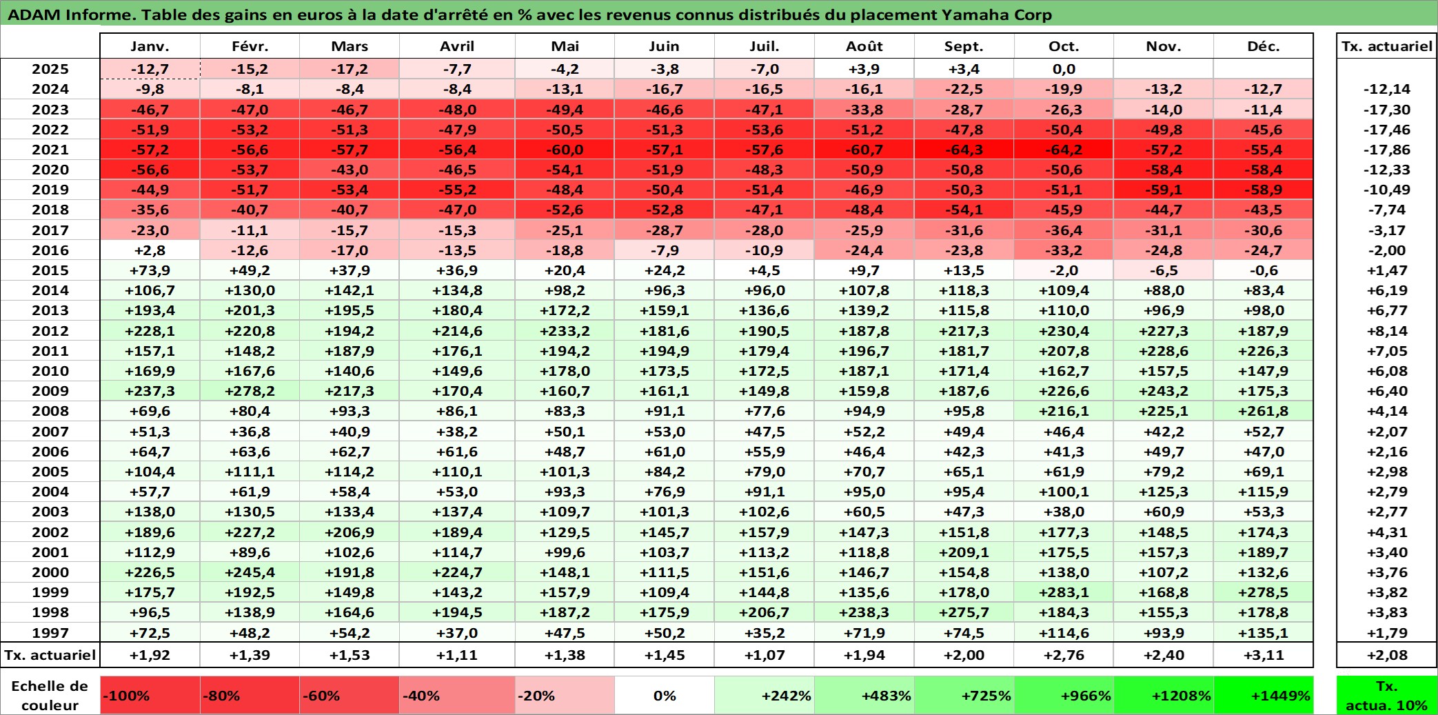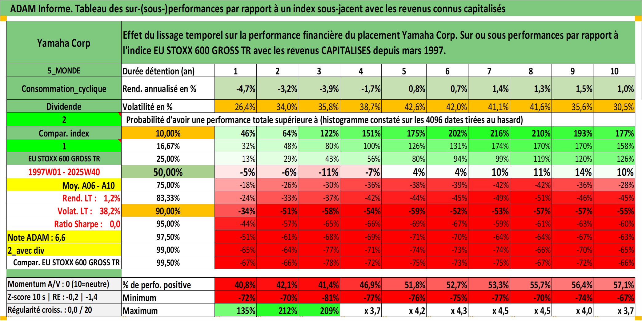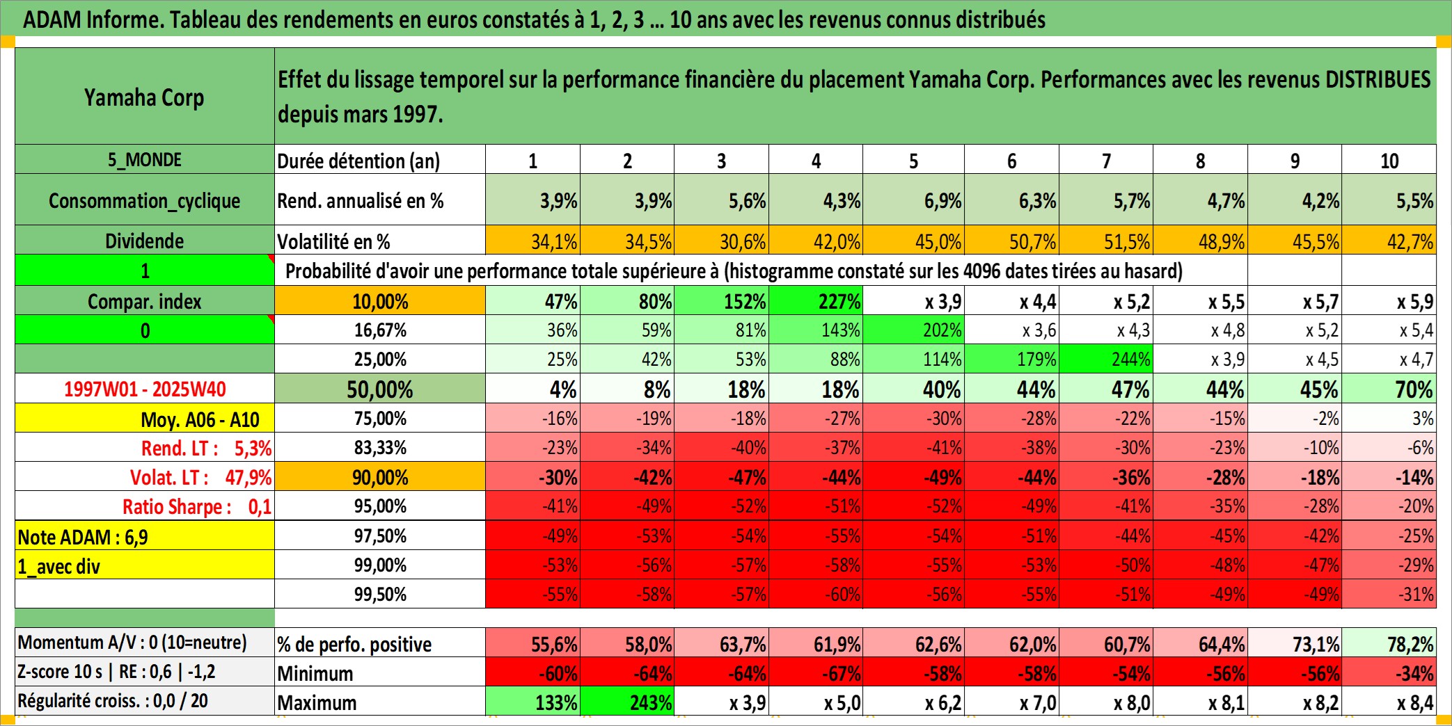 Site dédié aux investisseursPage dédiée sur site financeAnalyse des valorisations hebdomadaires de l'action Yamaha Corp. Cet actif est cote en JPY. Les valorisations sont en contrevaleur EURO et couvrent les semaines 1997W01 a 2025W40. Les revenus de cet actif financier sont pris en compte depuis la semaine 1997W13. La note ESG de cet actif n'est pas connue.