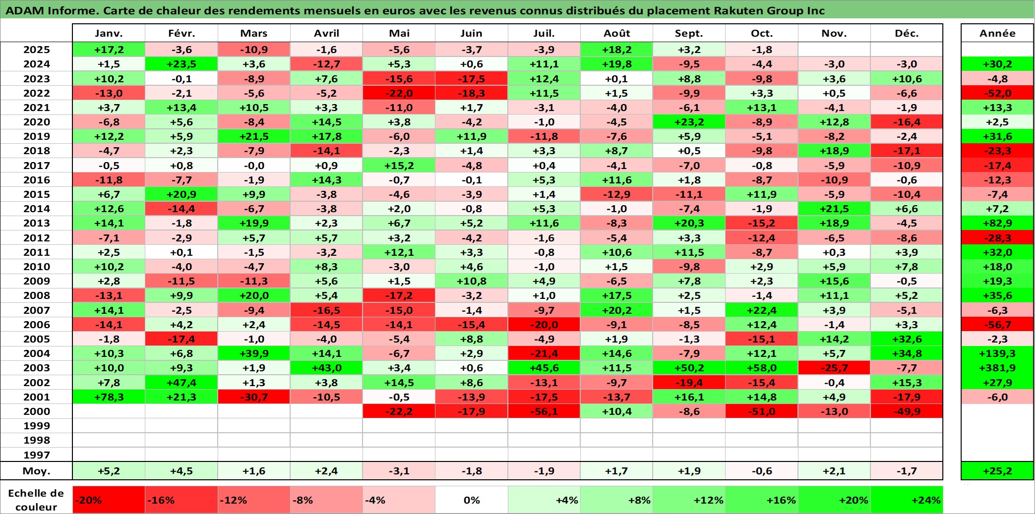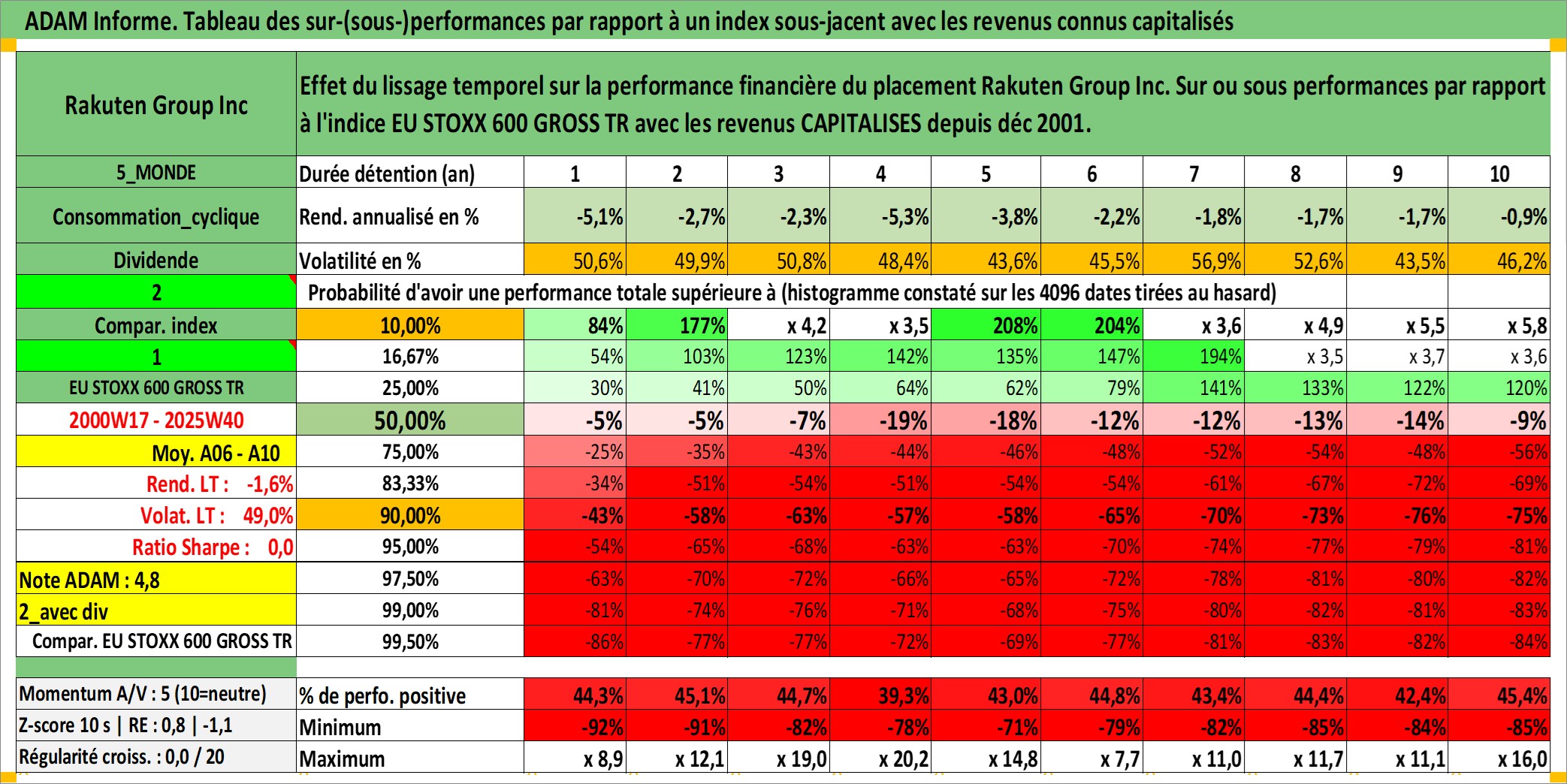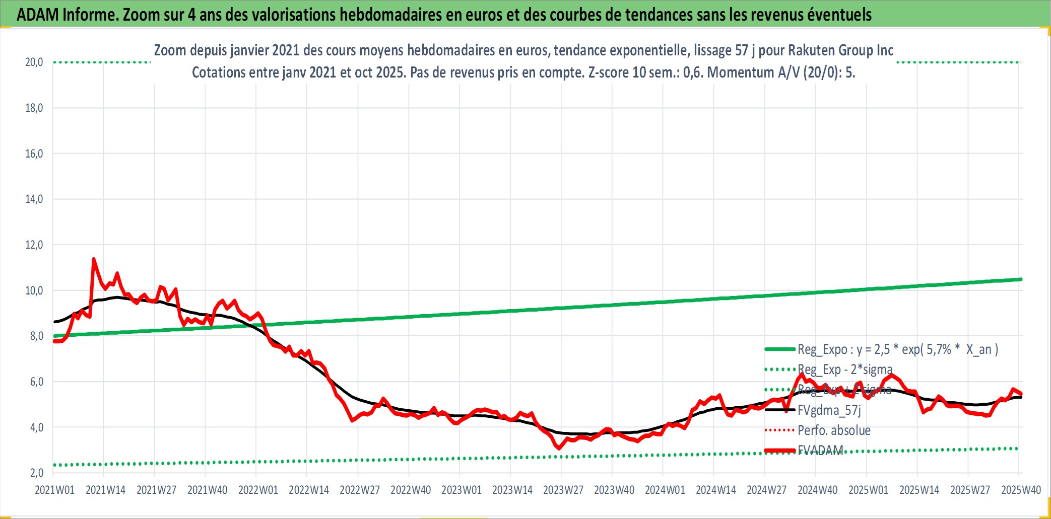 Site dédié aux investisseursPage dédiée sur site financeAnalyse des valorisations hebdomadaires de l'action Rakuten Group Inc. Cet actif est cote en JPY. Les valorisations sont en contrevaleur EURO et couvrent les semaines 2000W17 a 2025W40. Les revenus de cet actif financier sont pris en compte depuis la semaine 2001W52. La note globale ESG de cet actif est estimee a 9.0 (apres rebasage entre 0 et 20).