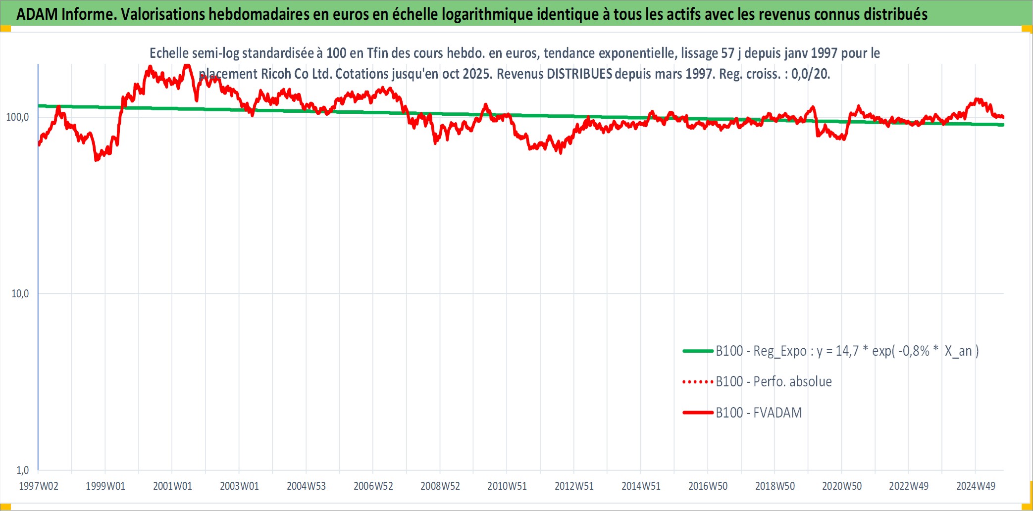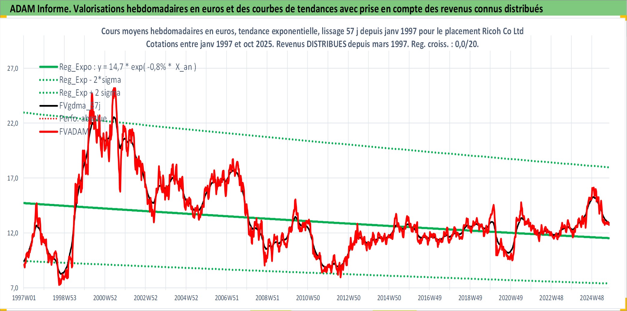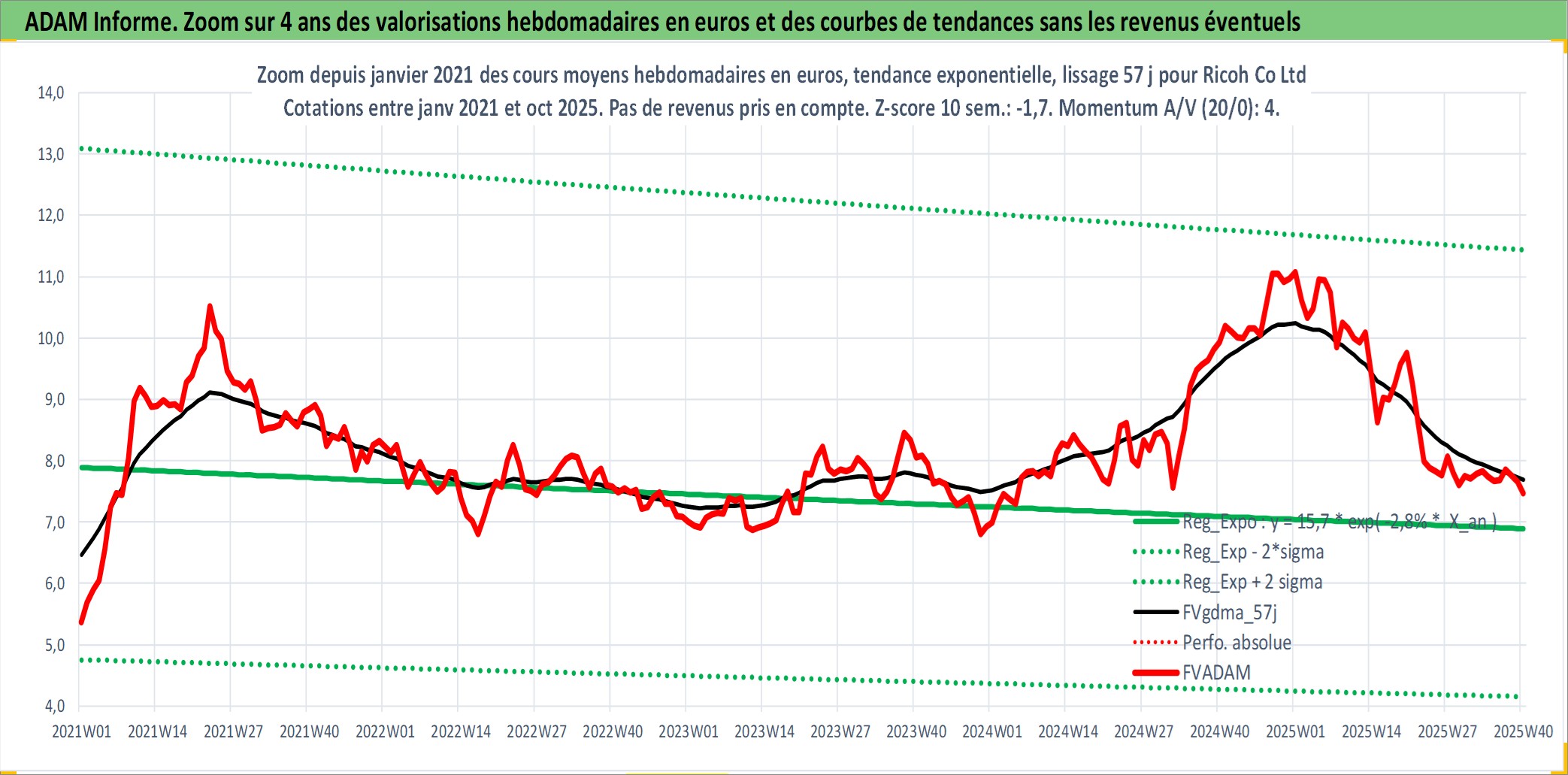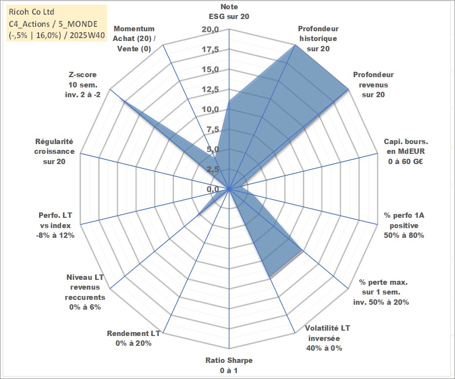 Site dédié aux investisseursPage dédiée sur site financeAnalyse des valorisations hebdomadaires de l'action Ricoh Co Ltd. Cet actif est cote en JPY. Les valorisations sont en contrevaleur EURO et couvrent les semaines 1997W01 a 2025W40. Les revenus de cet actif financier sont pris en compte depuis la semaine 1997W13. La note globale ESG de cet actif est estimee a 11.0 (apres rebasage entre 0 et 20).