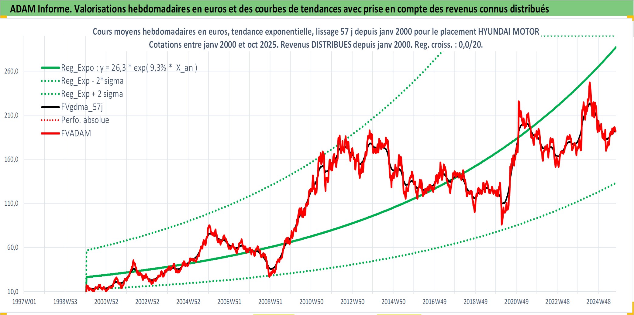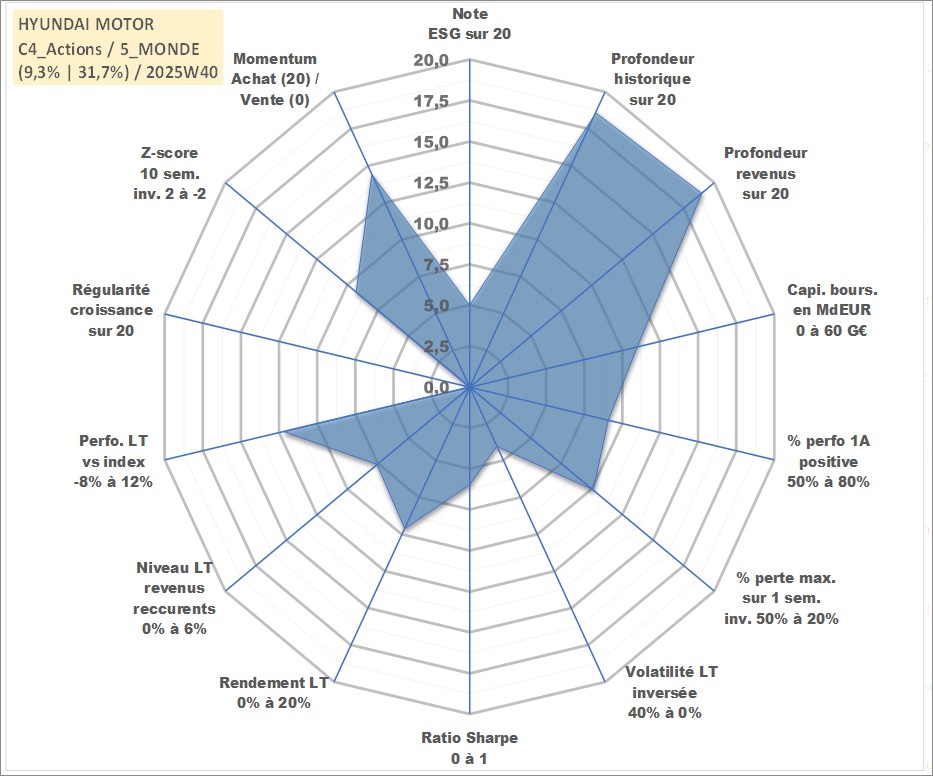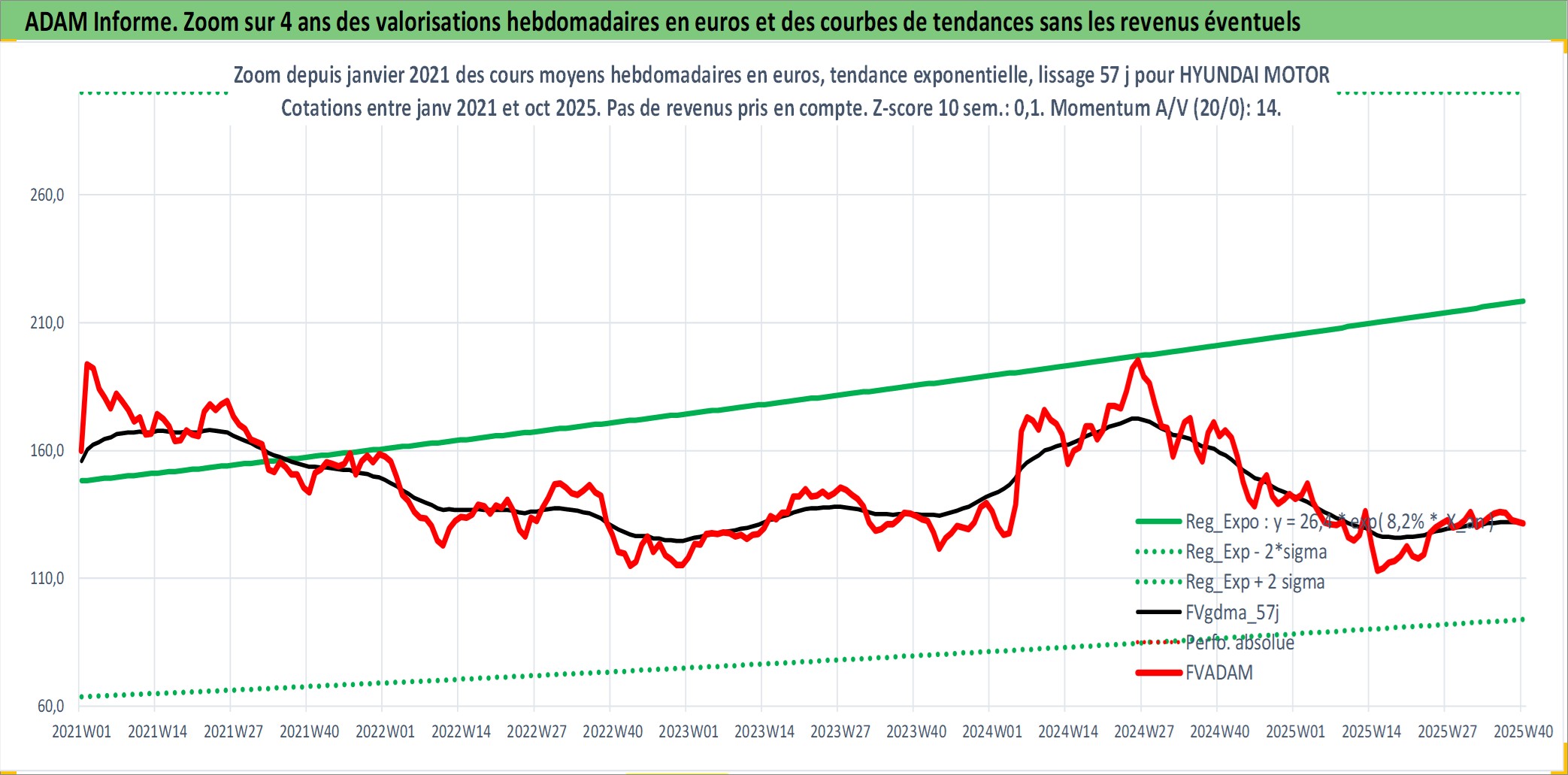 Site dédié aux investisseursPage dédiée sur site financeAnalyse des valorisations hebdomadaires de l'action HYUNDAI MOTOR. Cet actif est cote en KRW. Les valorisations sont en contrevaleur EURO et couvrent les semaines 2000W02 a 2025W40. Les revenus de cet actif financier sont pris en compte depuis la semaine 2000W01. La note globale ESG de cet actif est estimee a 5.0 (apres rebasage entre 0 et 20).