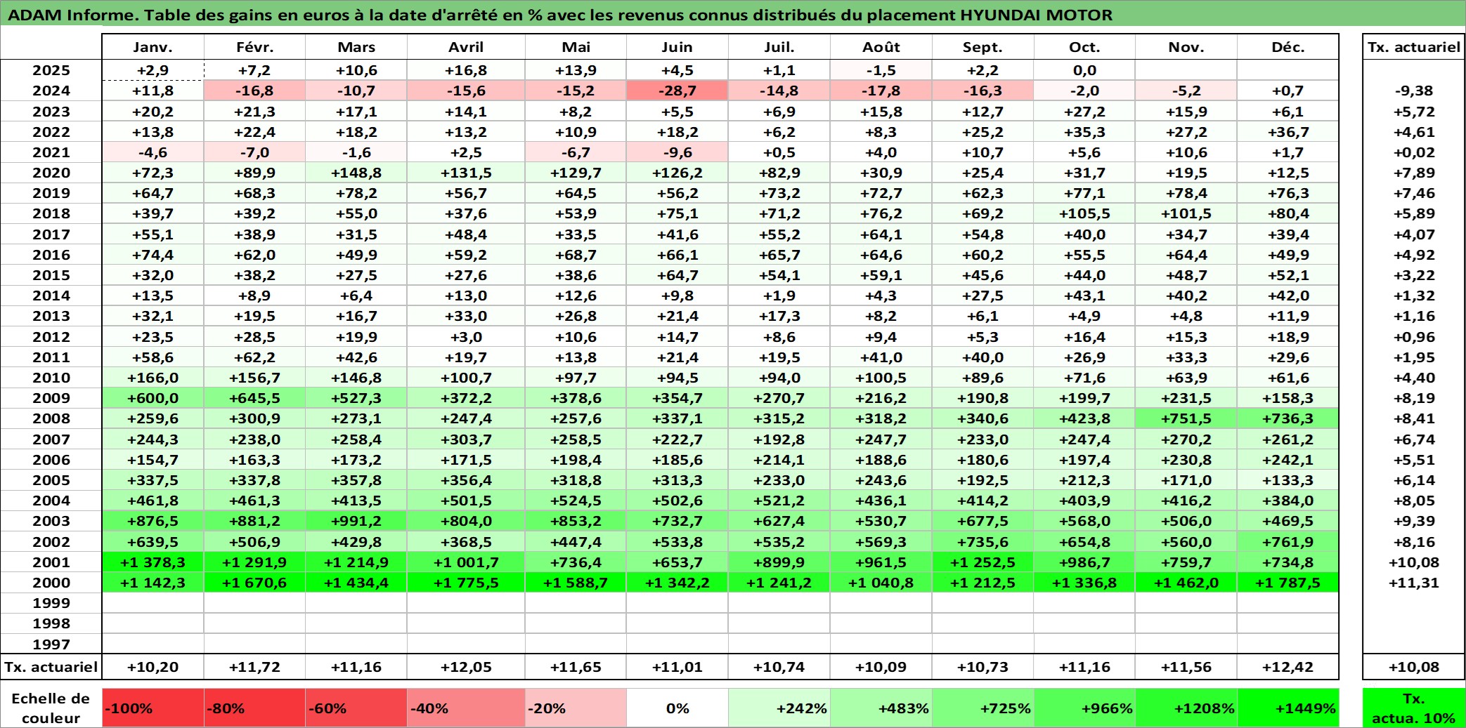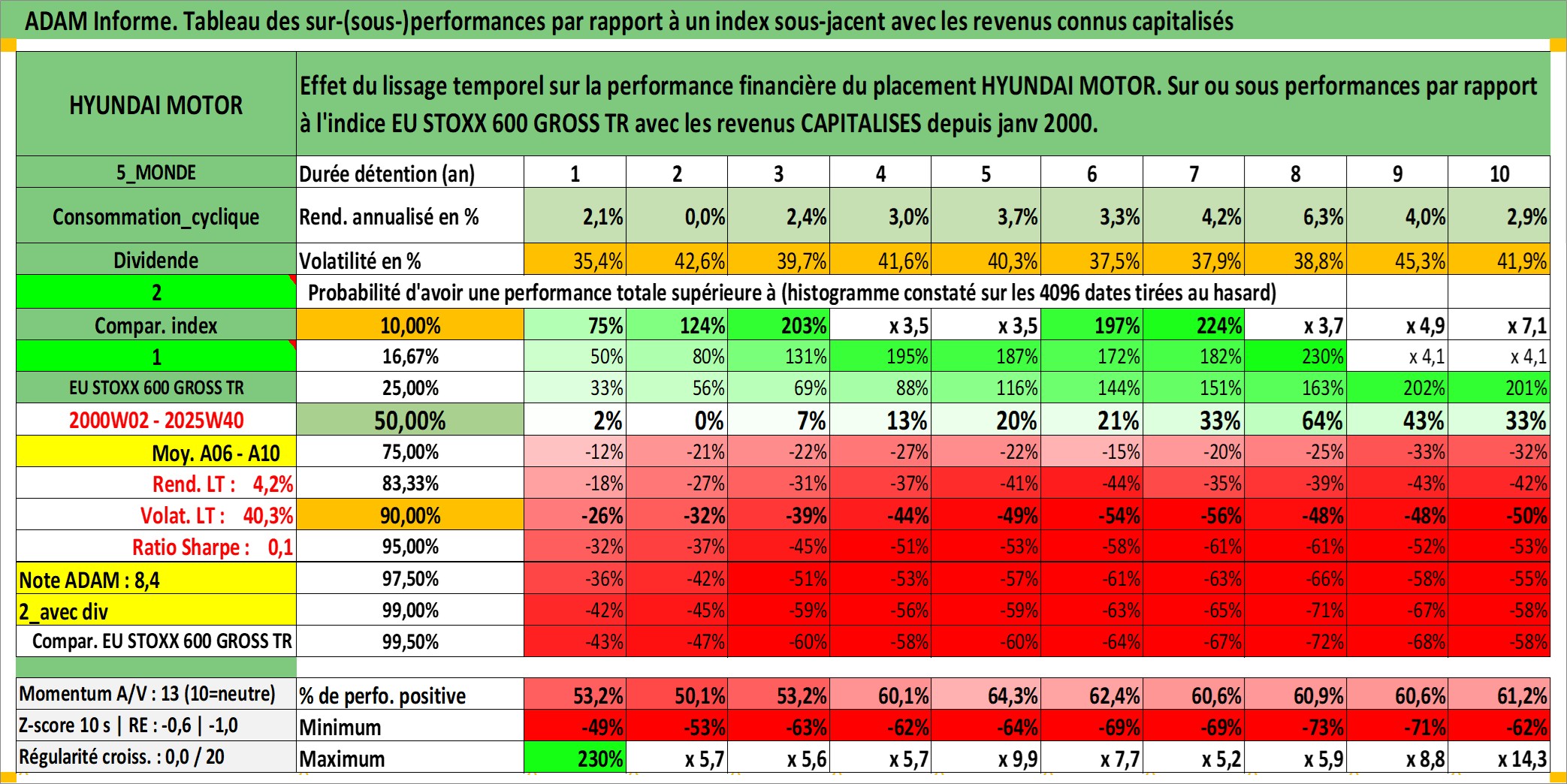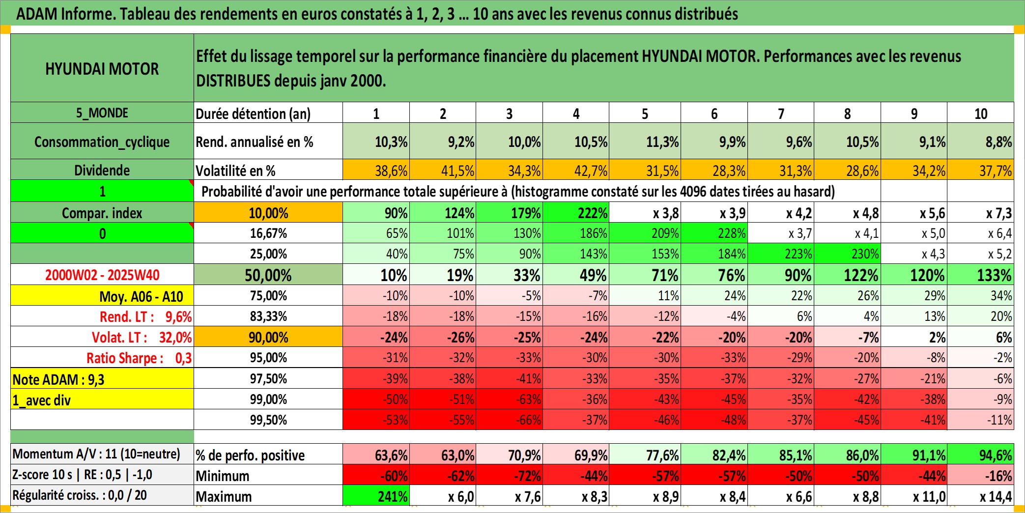 Site dédié aux investisseursPage dédiée sur site financeAnalyse des valorisations hebdomadaires de l'action HYUNDAI MOTOR. Cet actif est cote en KRW. Les valorisations sont en contrevaleur EURO et couvrent les semaines 2000W02 a 2025W40. Les revenus de cet actif financier sont pris en compte depuis la semaine 2000W01. La note globale ESG de cet actif est estimee a 5.0 (apres rebasage entre 0 et 20).
