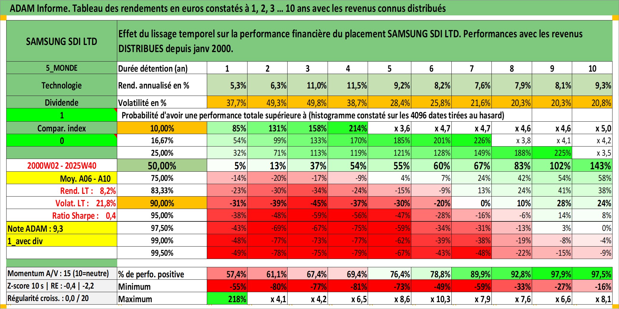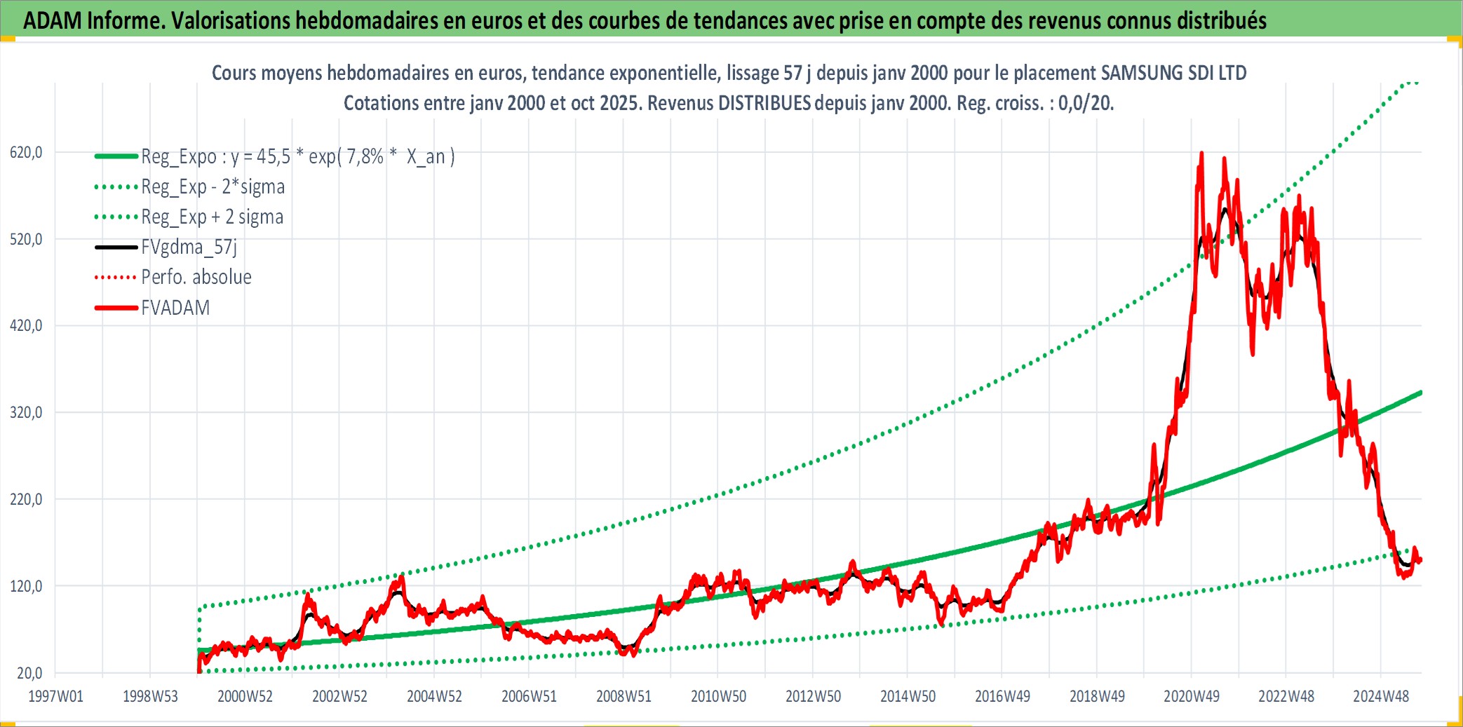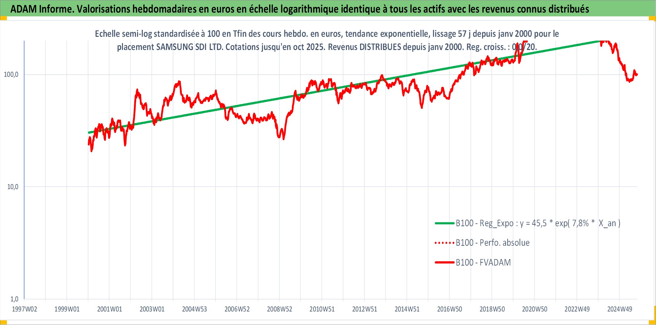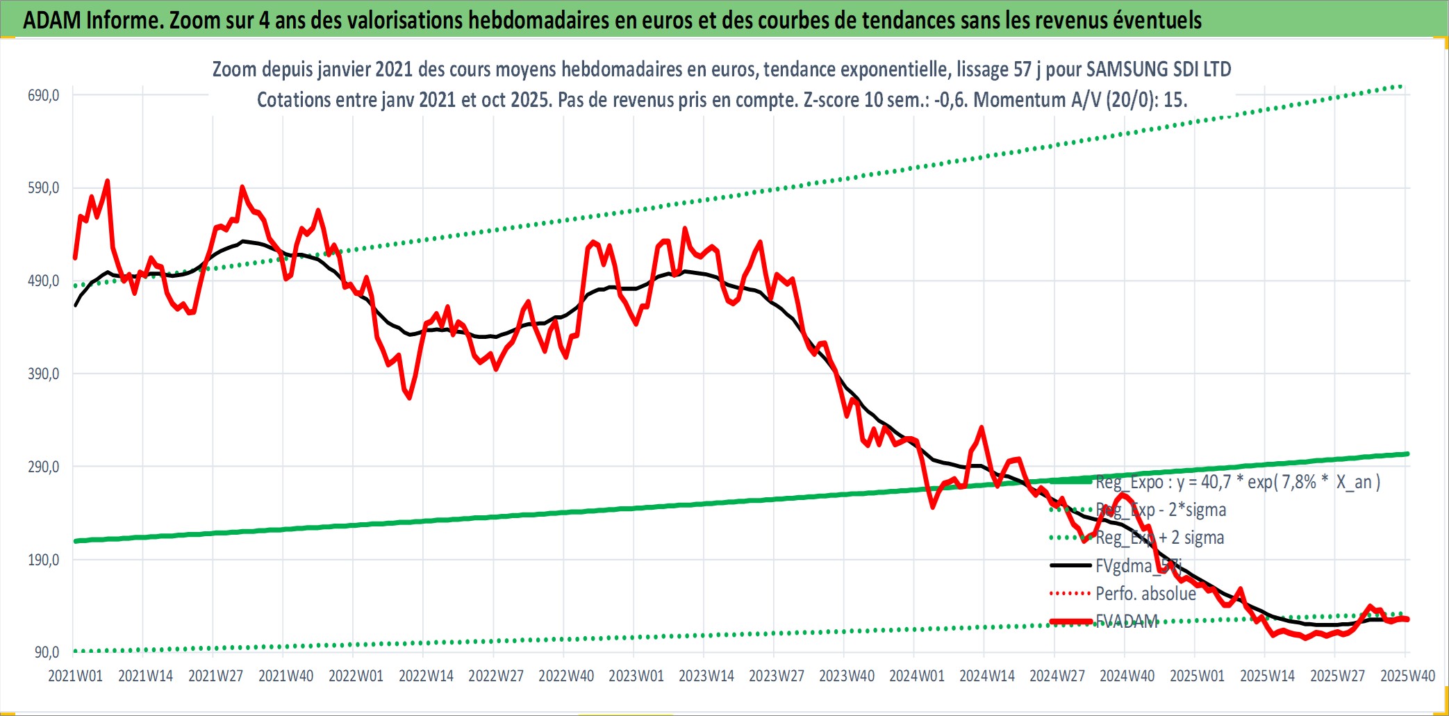 Site dédié aux investisseursPage dédiée sur site financeAnalyse des valorisations hebdomadaires de l'action SAMSUNG SDI LTD. Cet actif est cote en KRW. Les valorisations sont en contrevaleur EURO et couvrent les semaines 2000W02 a 2025W40. Les revenus de cet actif financier sont pris en compte depuis la semaine 2000W01. La note globale ESG de cet actif est estimee a 10.0 (apres rebasage entre 0 et 20).