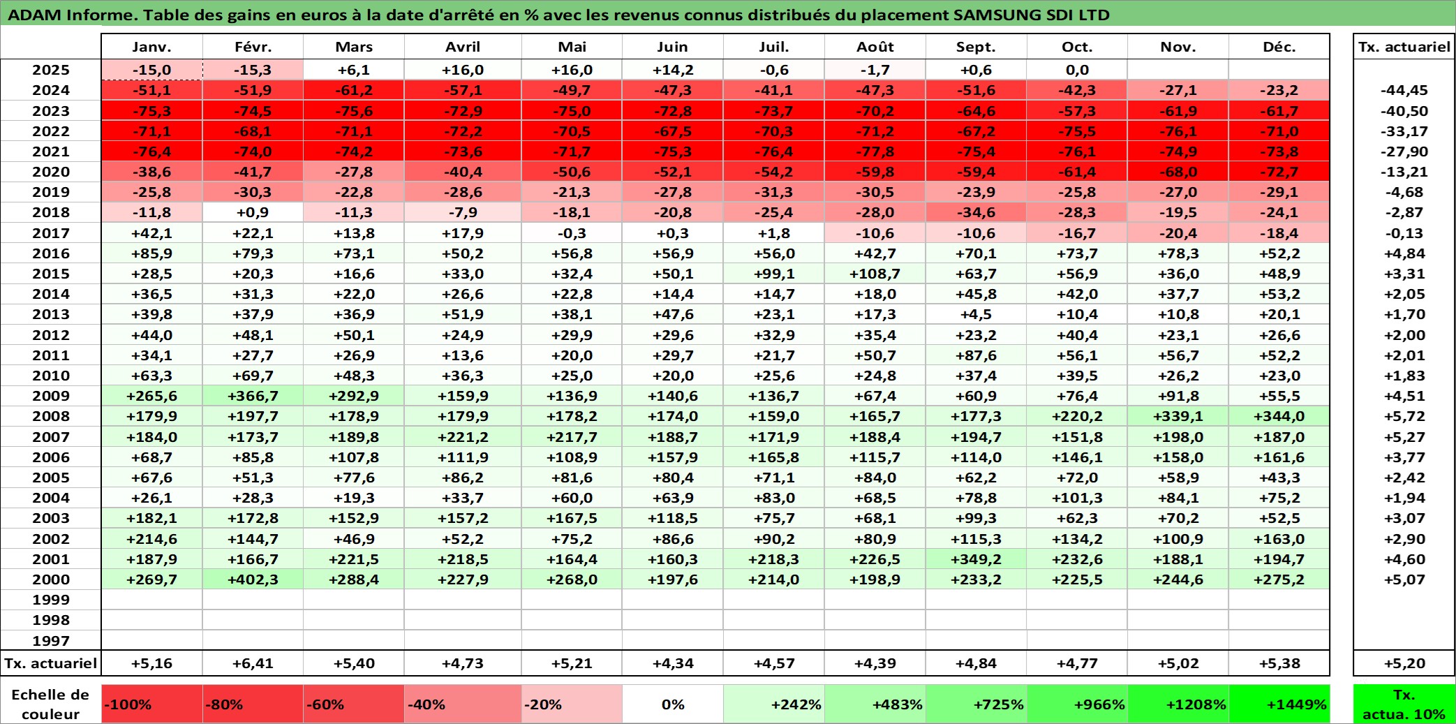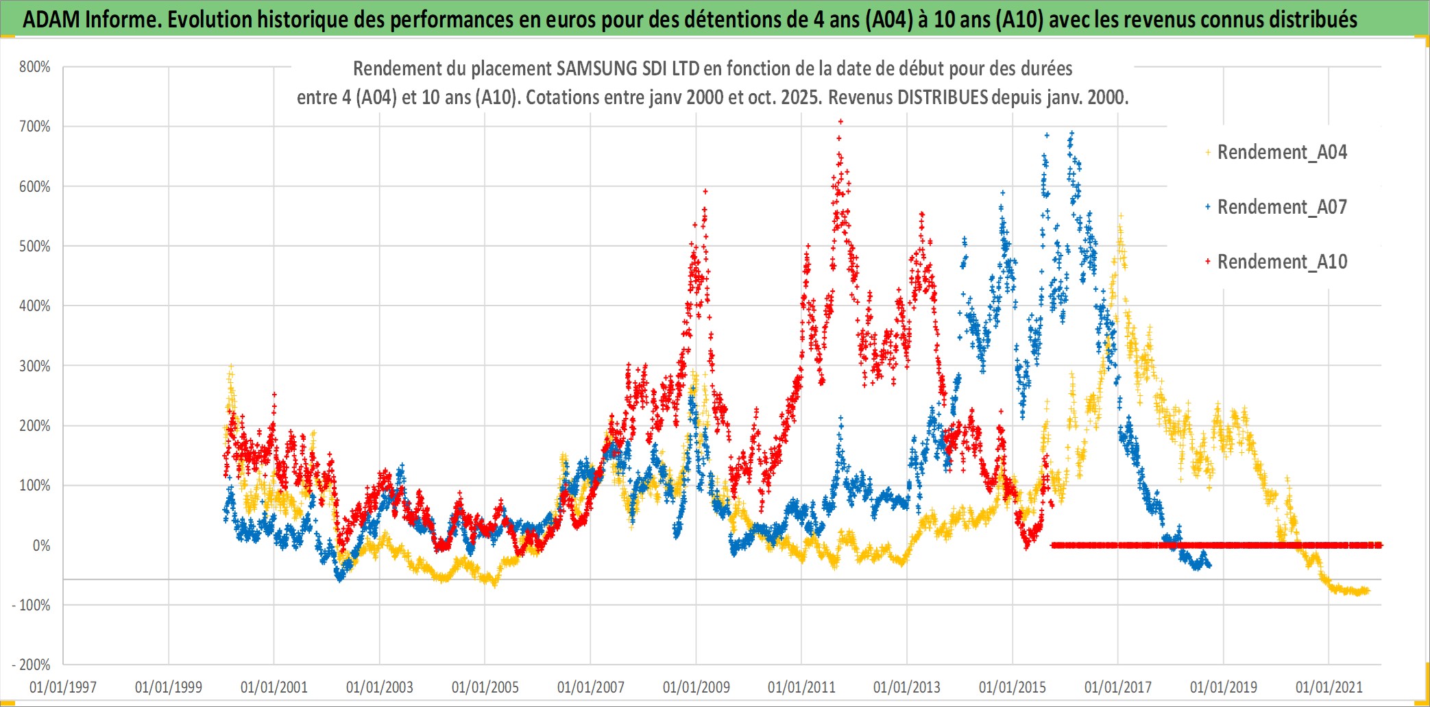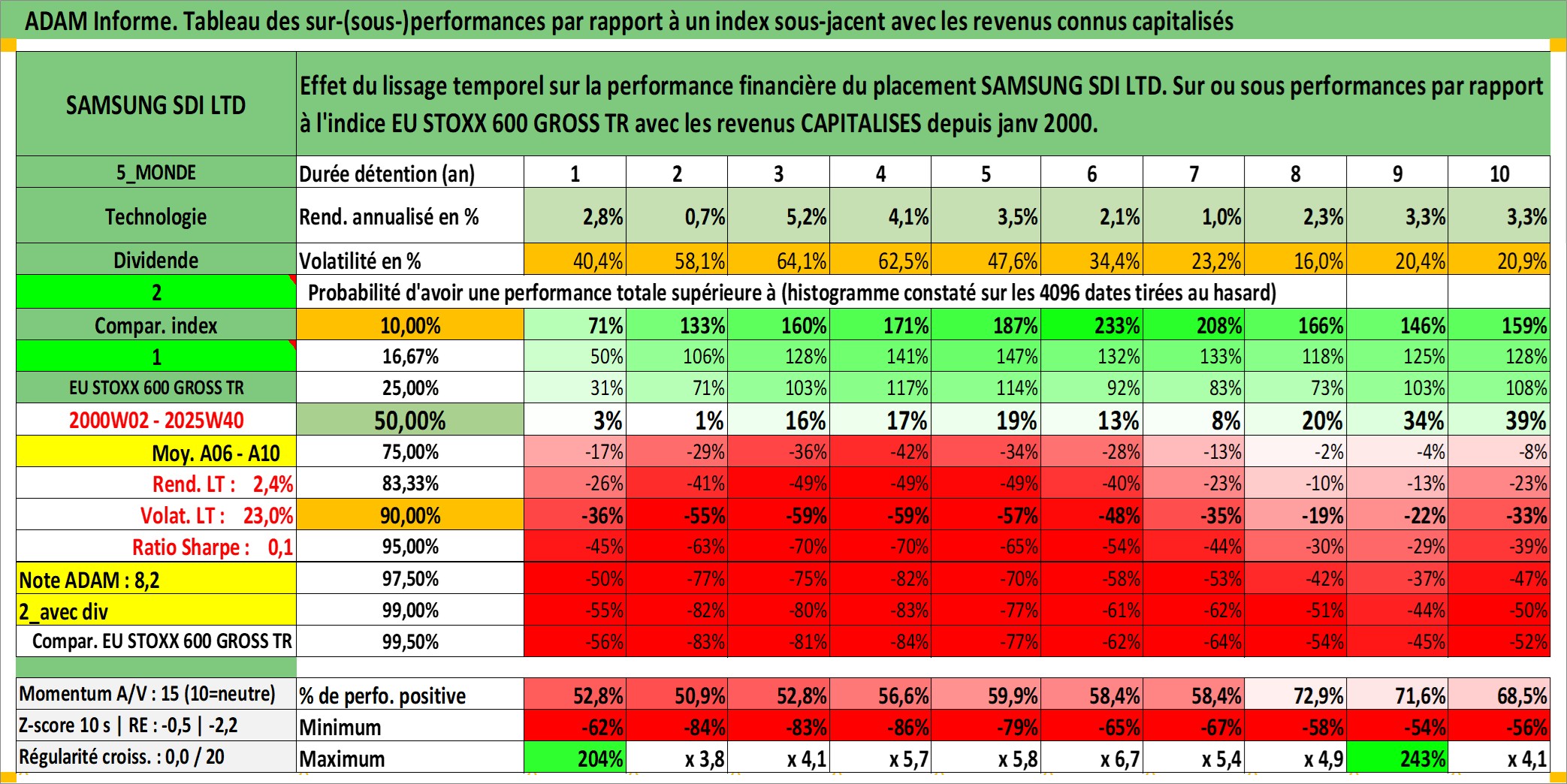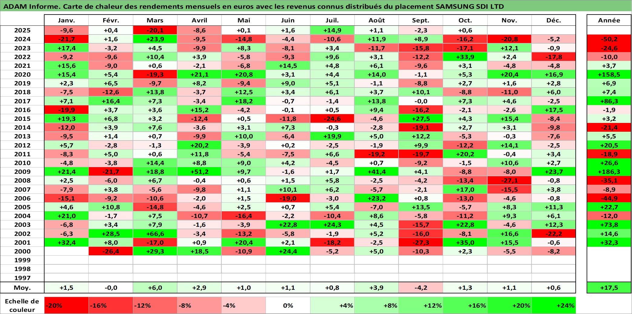 Site dédié aux investisseursPage dédiée sur site financeAnalyse des valorisations hebdomadaires de l'action SAMSUNG SDI LTD. Cet actif est cote en KRW. Les valorisations sont en contrevaleur EURO et couvrent les semaines 2000W02 a 2025W40. Les revenus de cet actif financier sont pris en compte depuis la semaine 2000W01. La note globale ESG de cet actif est estimee a 10.0 (apres rebasage entre 0 et 20).