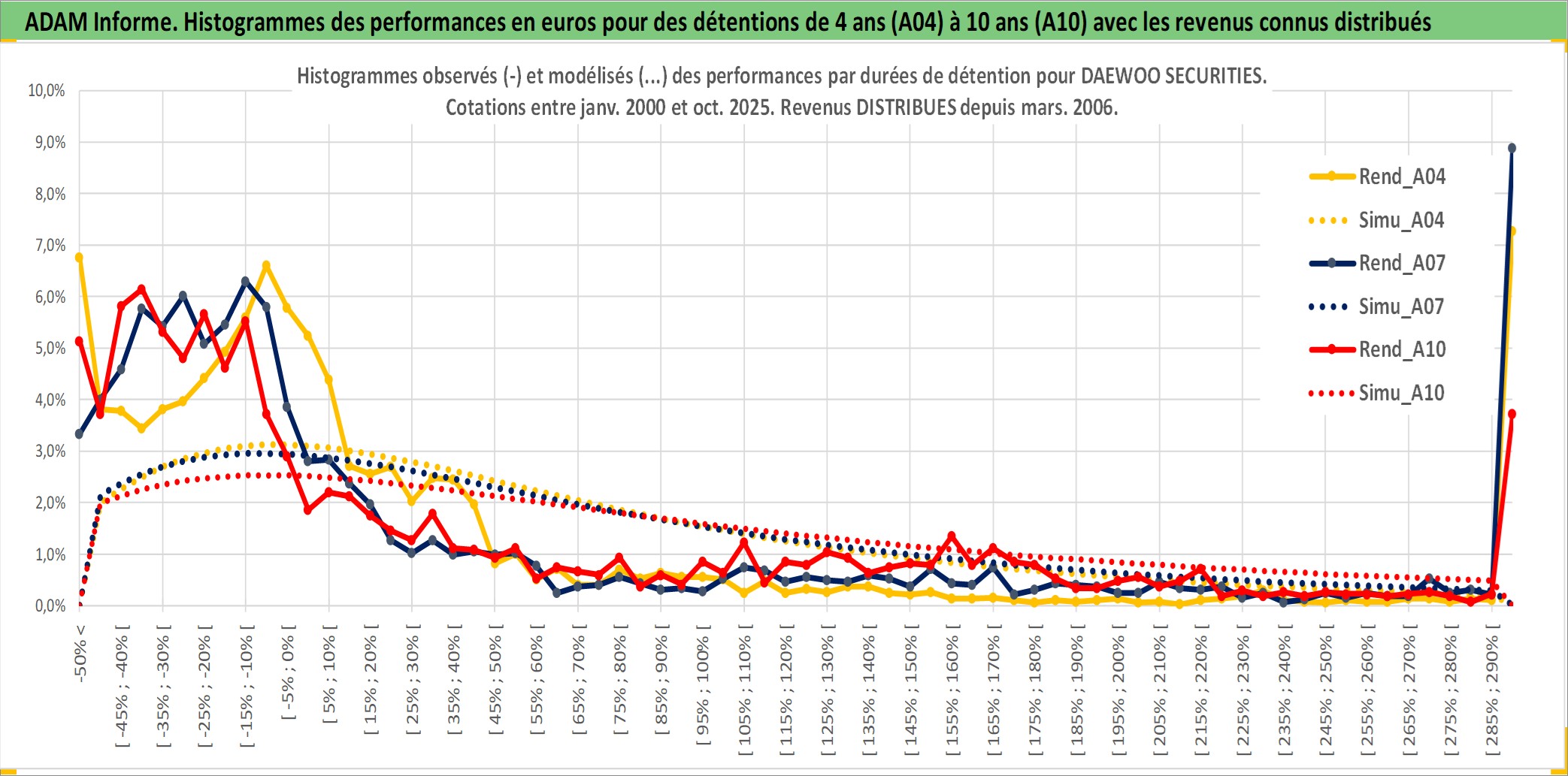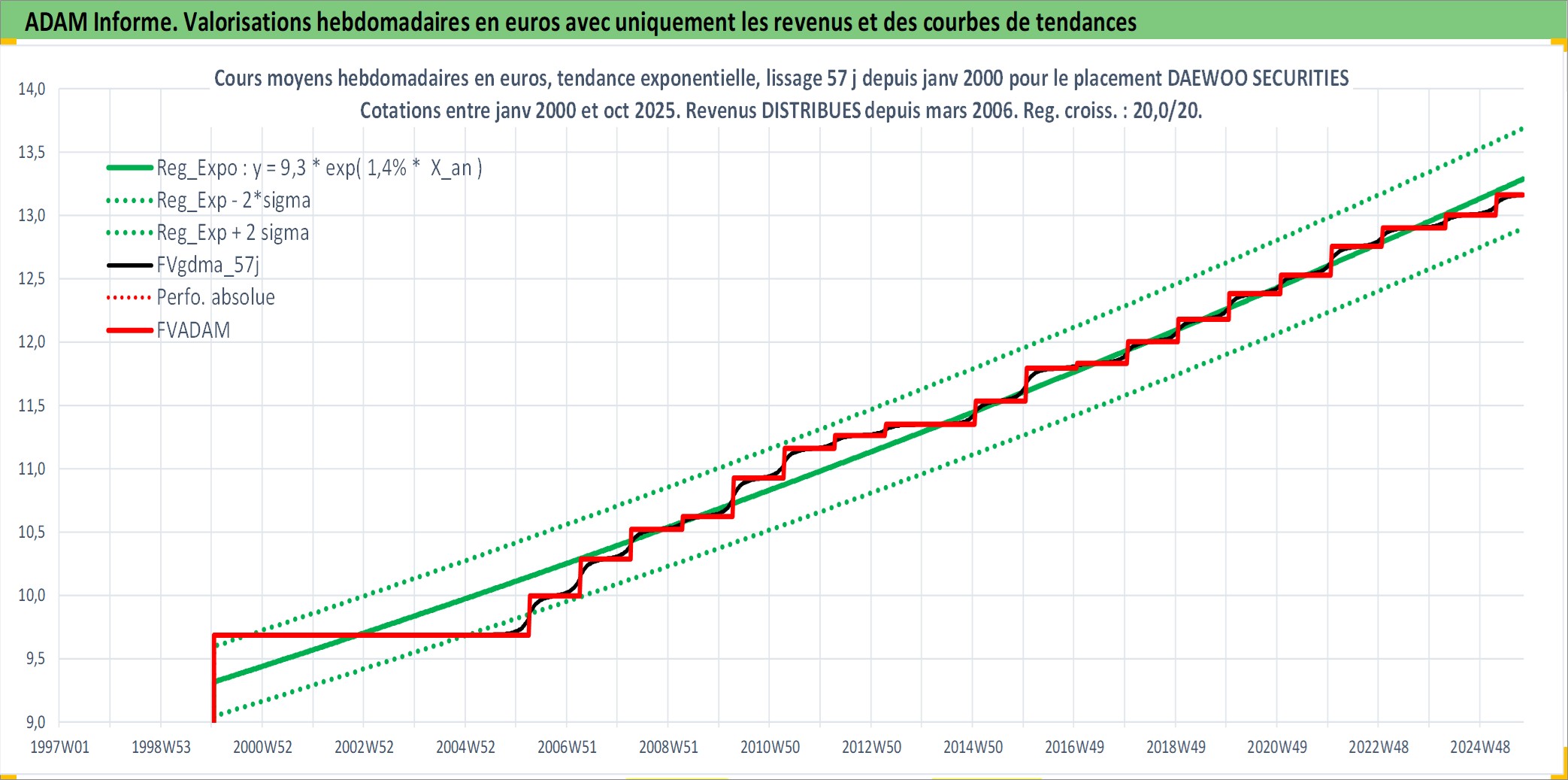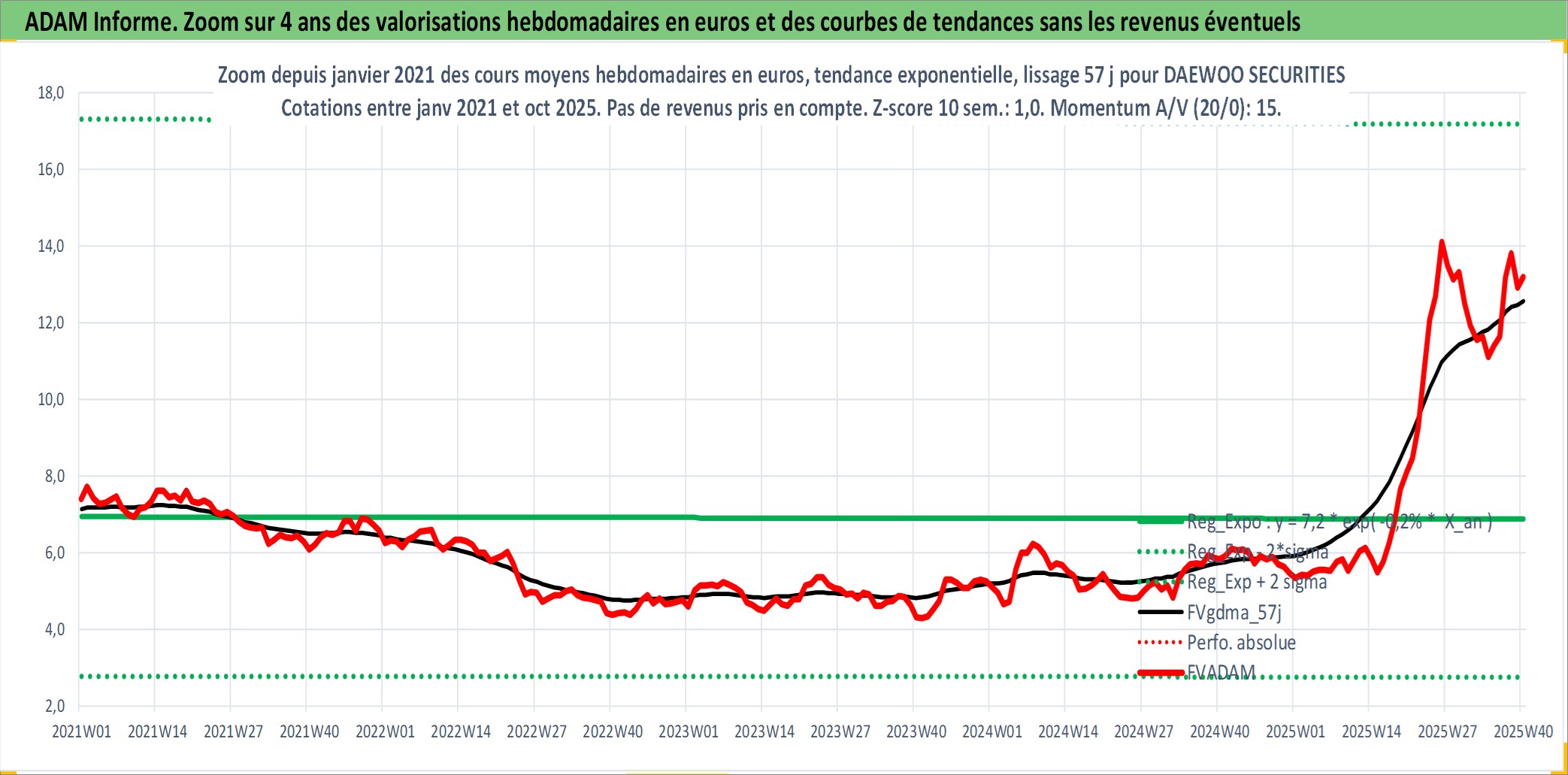 Site dédié aux investisseursPage dédiée sur site financeAnalyse des valorisations hebdomadaires de l'action DAEWOO SECURITIES. Cet actif est cote en KRW. Les valorisations sont en contrevaleur EURO et couvrent les semaines 2000W02 a 2025W40. Les revenus de cet actif financier sont pris en compte depuis la semaine 2006W13. La note globale ESG de cet actif est estimee a 8.0 (apres rebasage entre 0 et 20).