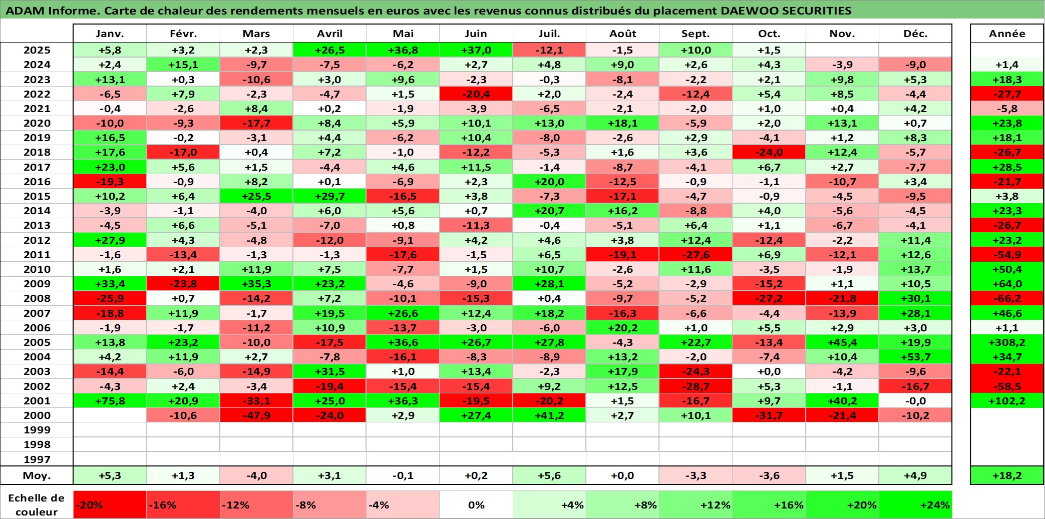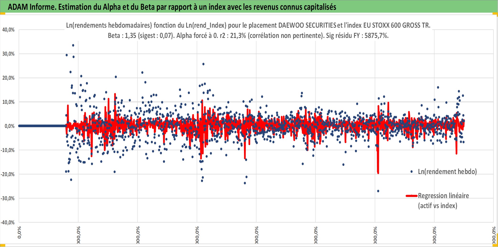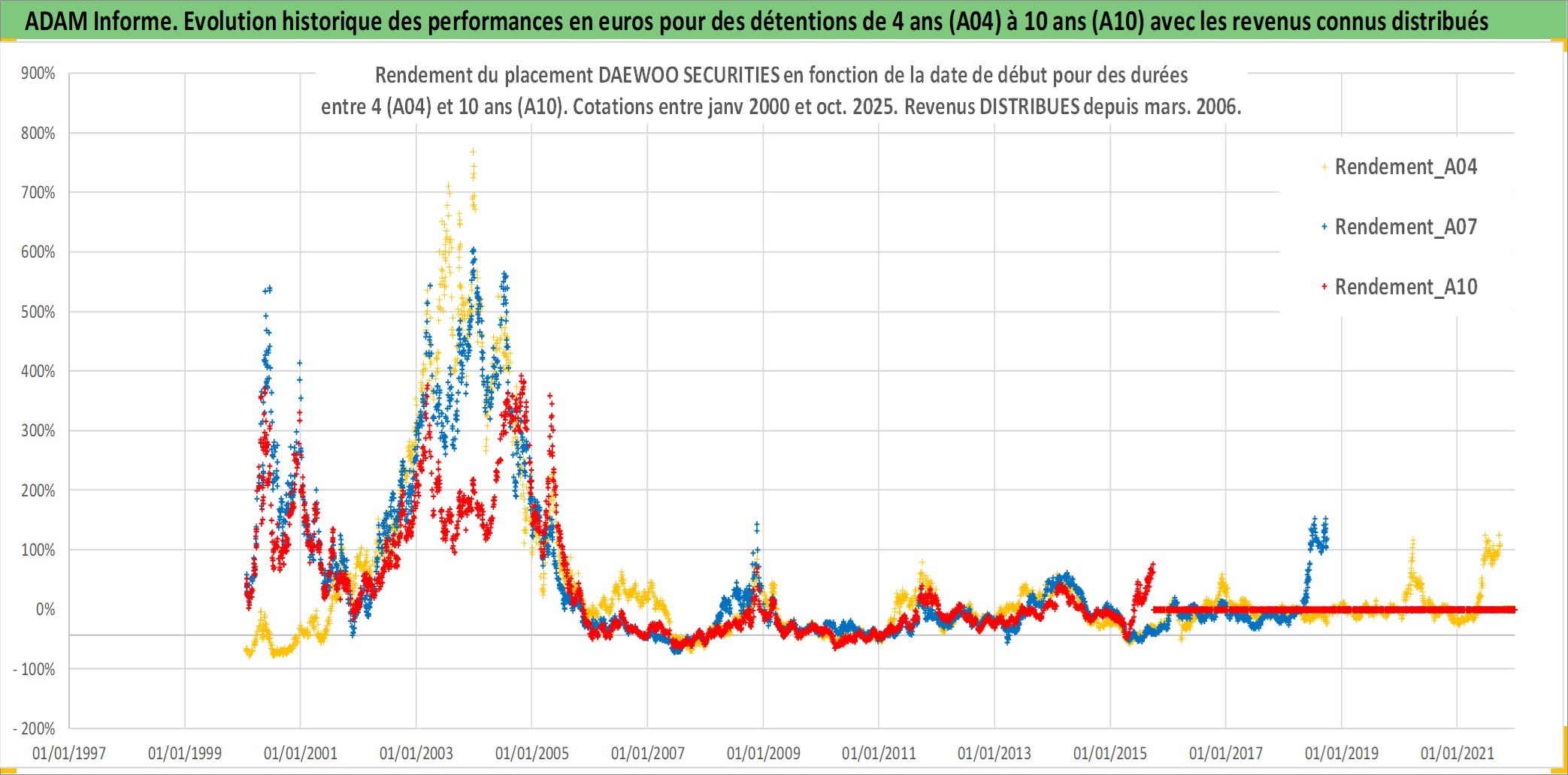 Site dédié aux investisseursPage dédiée sur site financeAnalyse des valorisations hebdomadaires de l'action DAEWOO SECURITIES. Cet actif est cote en KRW. Les valorisations sont en contrevaleur EURO et couvrent les semaines 2000W02 a 2025W40. Les revenus de cet actif financier sont pris en compte depuis la semaine 2006W13. La note globale ESG de cet actif est estimee a 8.0 (apres rebasage entre 0 et 20).