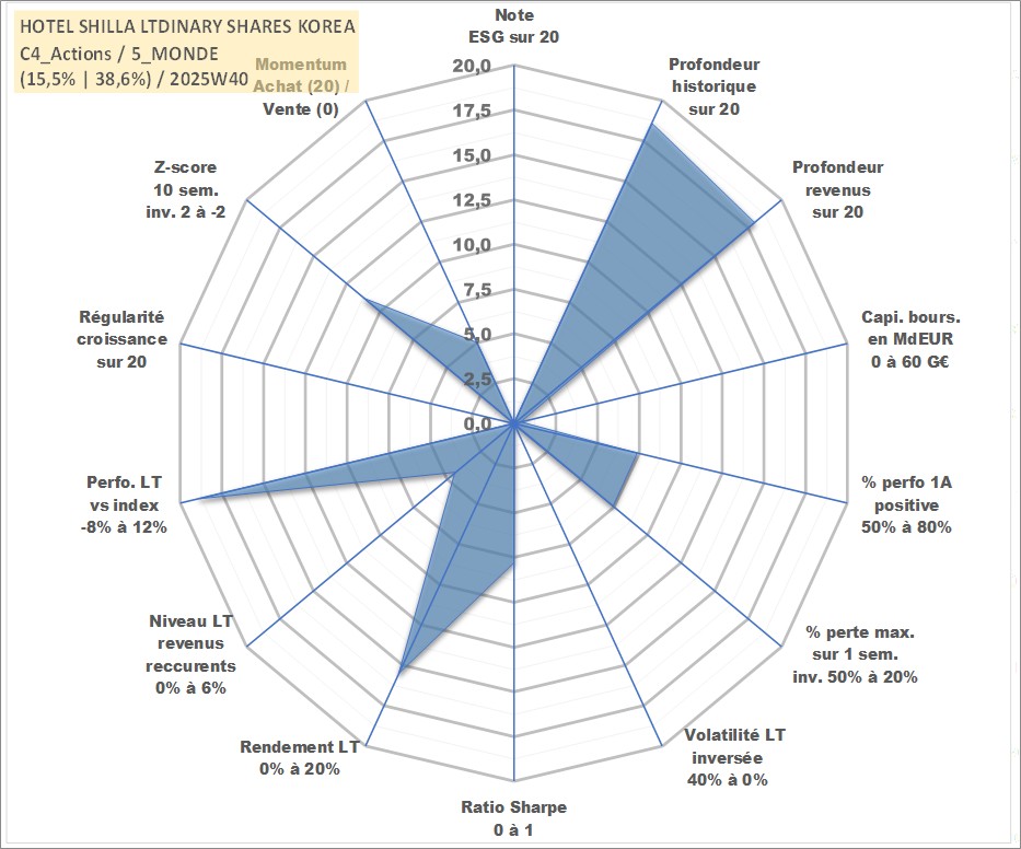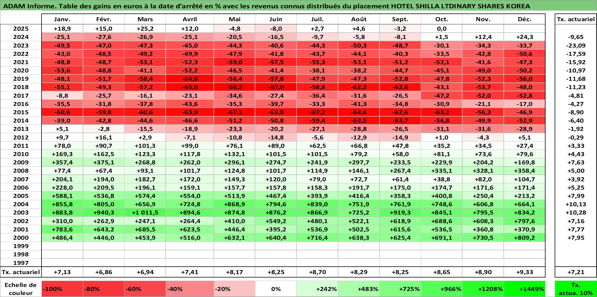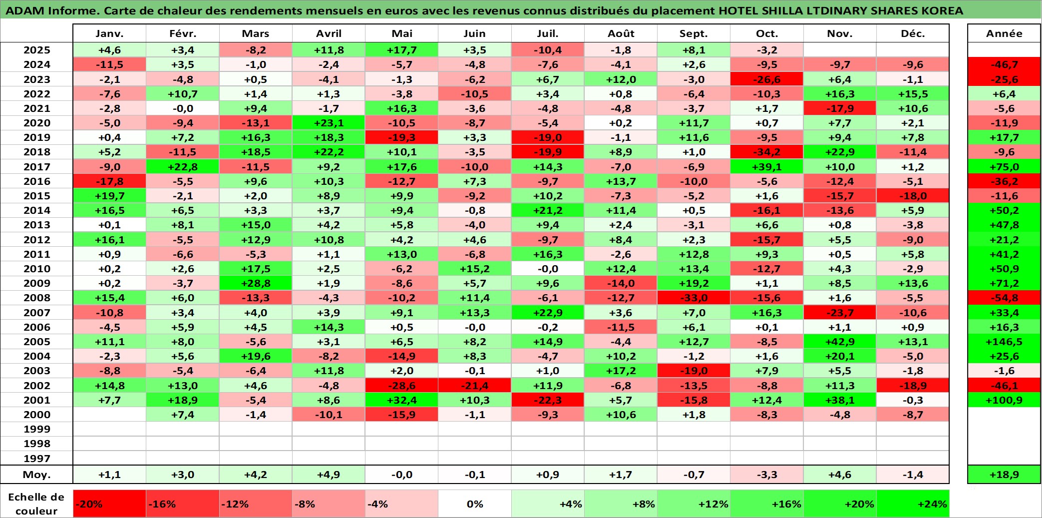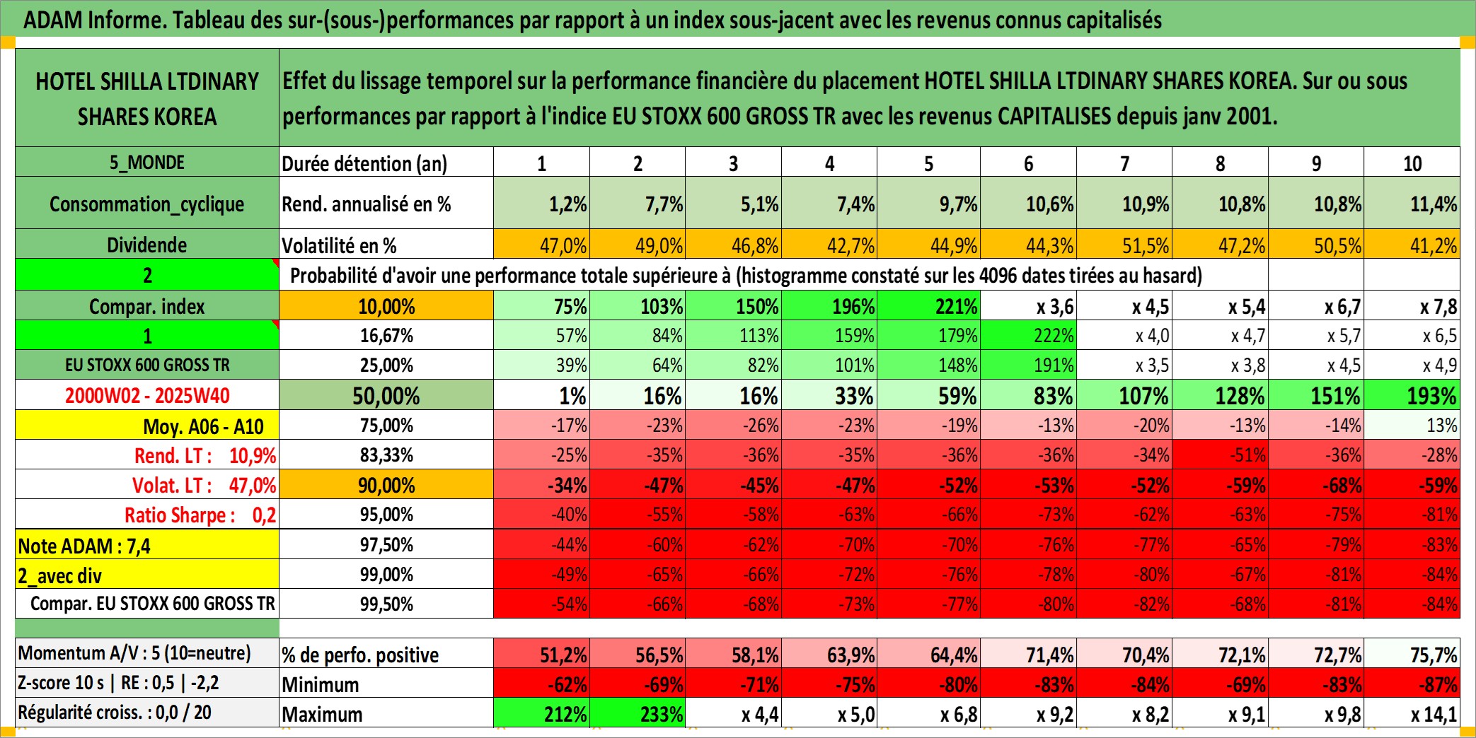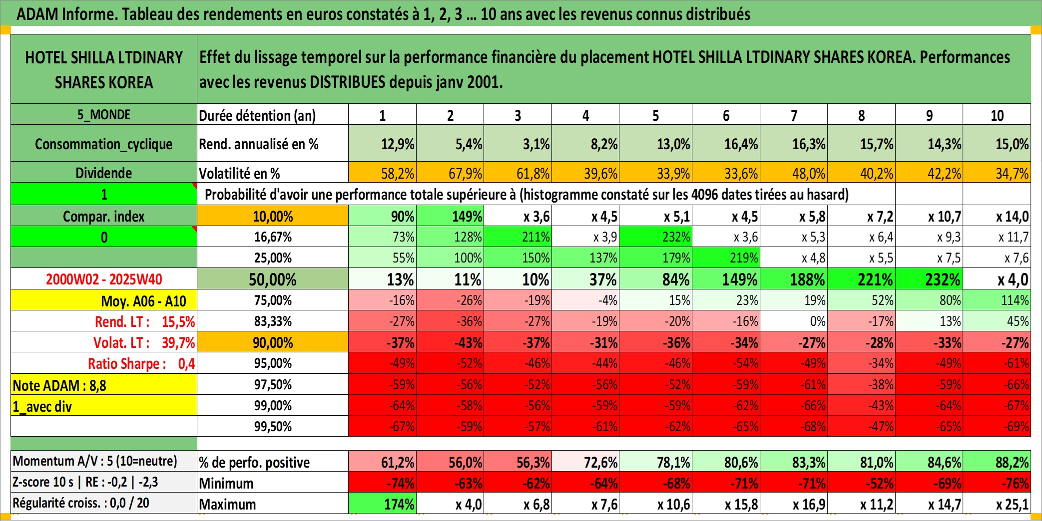 Site dédié aux investisseursPage dédiée sur site financeAnalyse des valorisations hebdomadaires de l'action HOTEL SHILLA LTDINARY SHARES KOREA. Cet actif est cote en KRW. Les valorisations sont en contrevaleur EURO et couvrent les semaines 2000W02 a 2025W40. Les revenus de cet actif financier sont pris en compte depuis la semaine 2001W01. La note ESG de cet actif n'est pas connue.