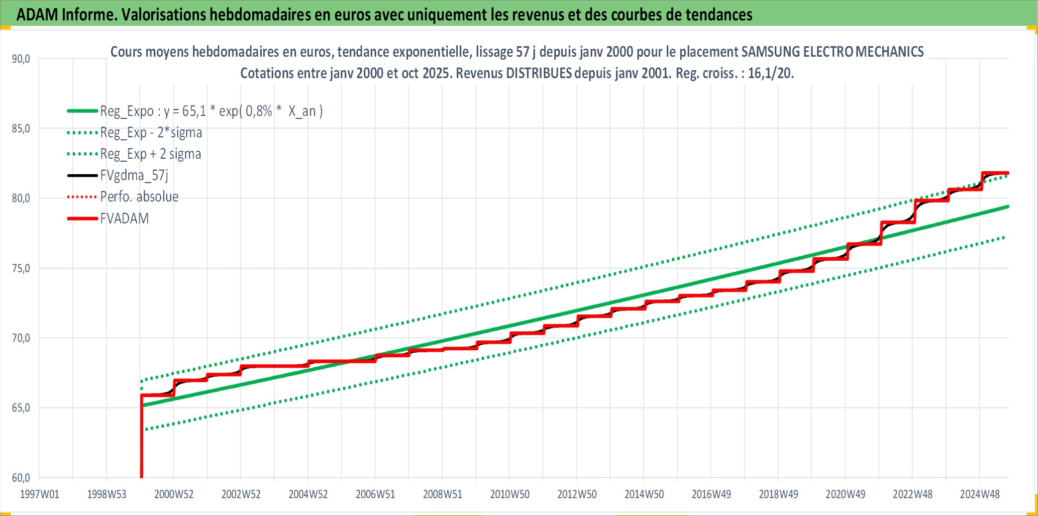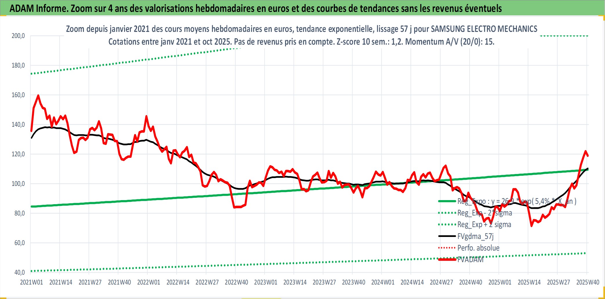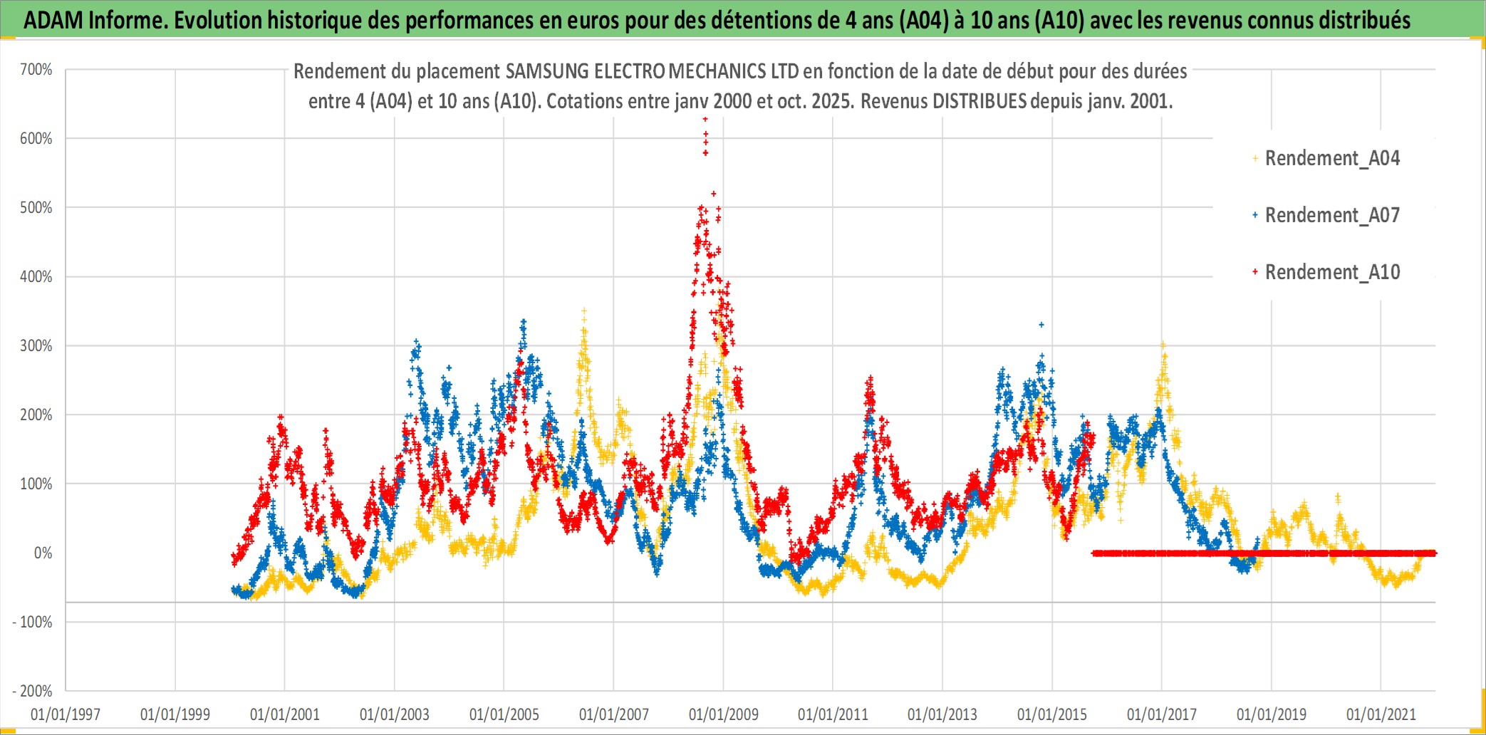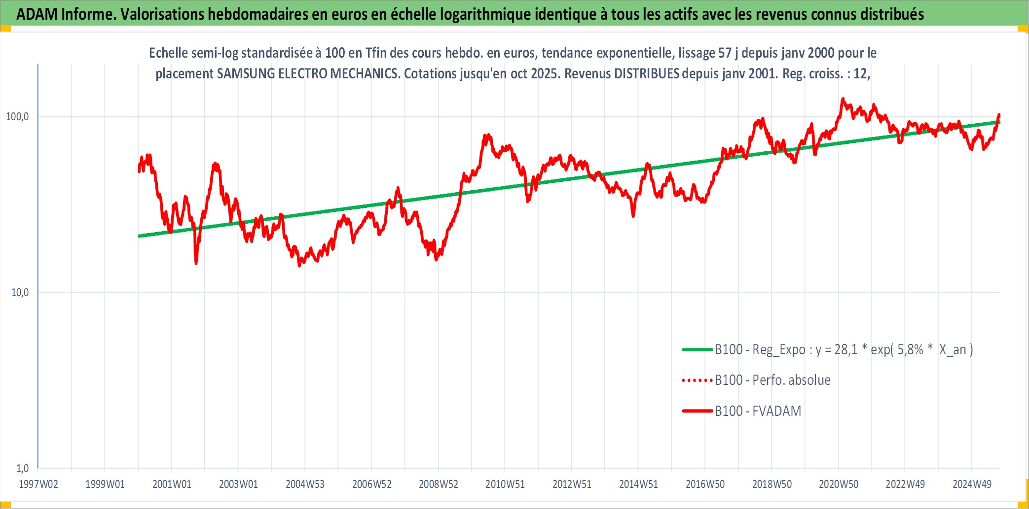 Site dédié aux investisseursPage dédiée sur site financeAnalyse des valorisations hebdomadaires de l'action SAMSUNG ELECTRO MECHANICS LTD. Cet actif est cote en KRW. Les valorisations sont en contrevaleur EURO et couvrent les semaines 2000W02 a 2025W40. Les revenus de cet actif financier sont pris en compte depuis la semaine 2001W01. La note ESG de cet actif n'est pas connue.