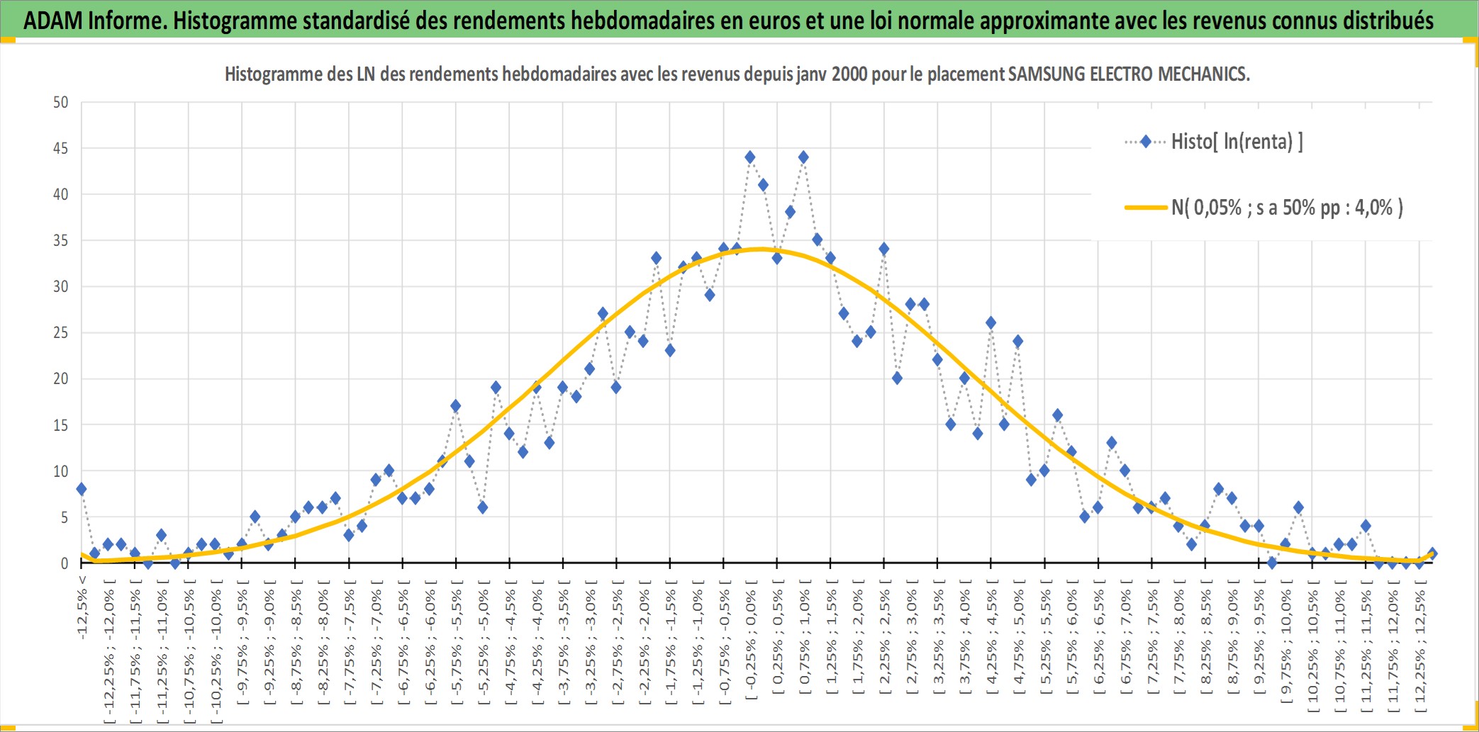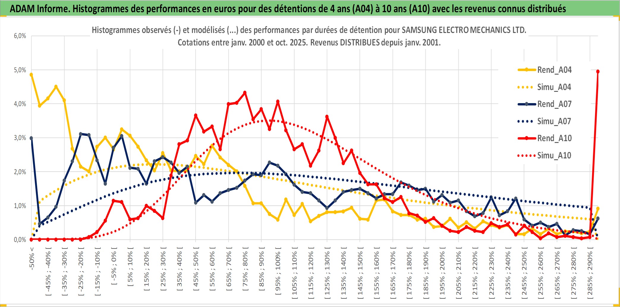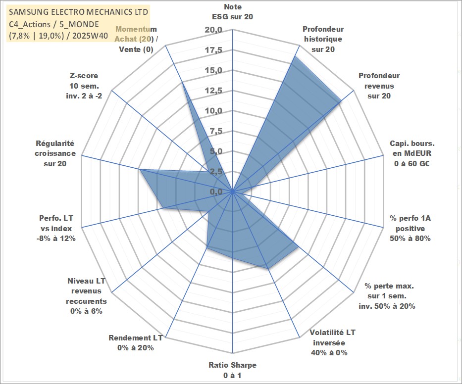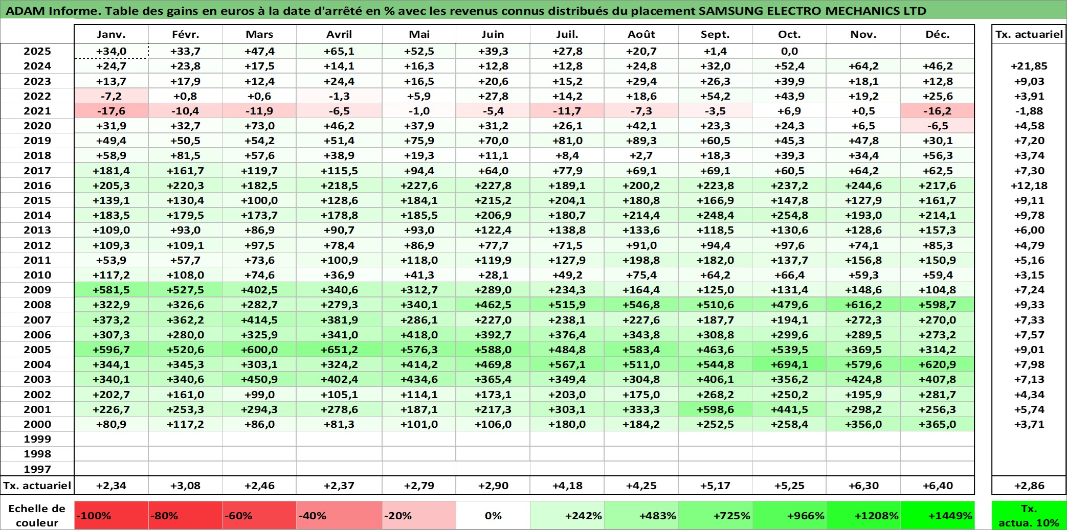 Site dédié aux investisseursPage dédiée sur site financeAnalyse des valorisations hebdomadaires de l'action SAMSUNG ELECTRO MECHANICS LTD. Cet actif est cote en KRW. Les valorisations sont en contrevaleur EURO et couvrent les semaines 2000W02 a 2025W40. Les revenus de cet actif financier sont pris en compte depuis la semaine 2001W01. La note ESG de cet actif n'est pas connue.