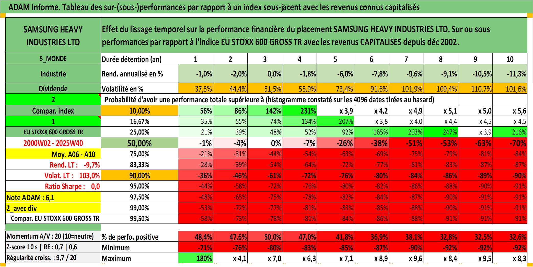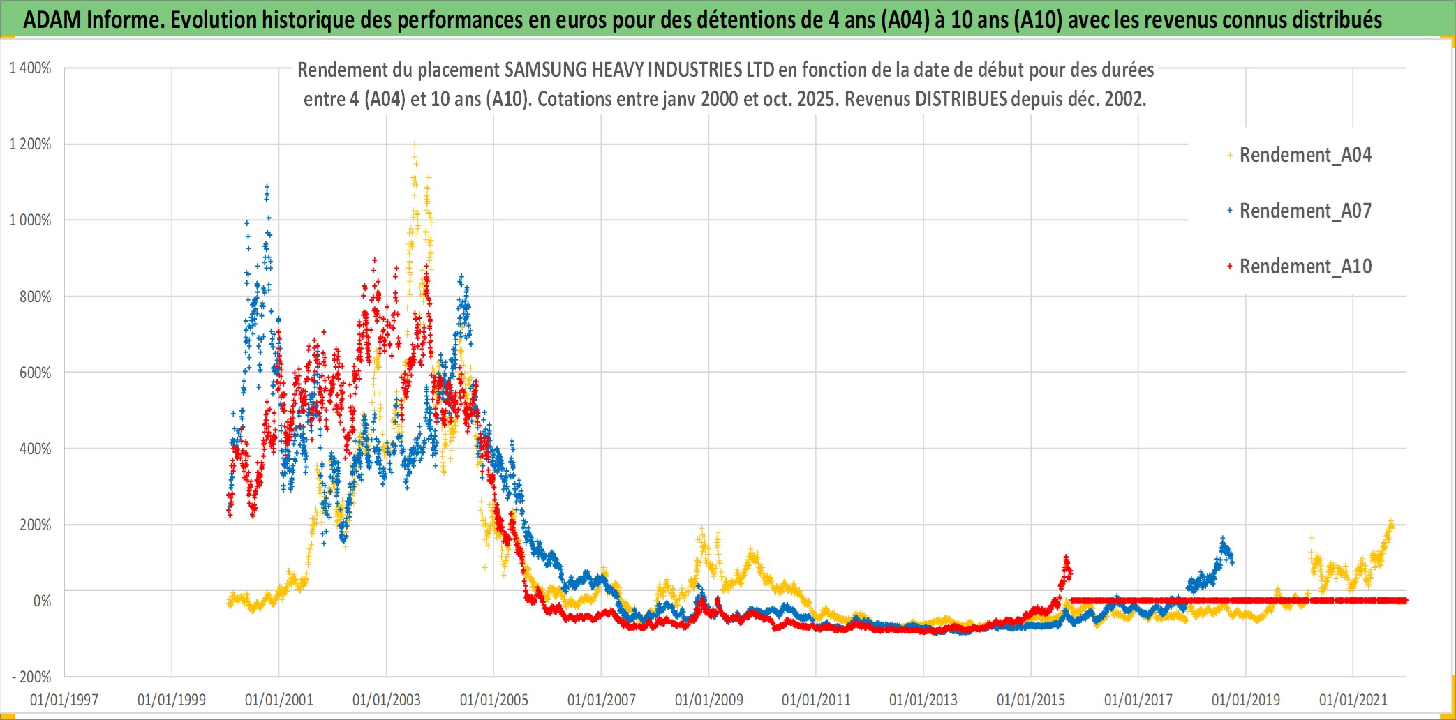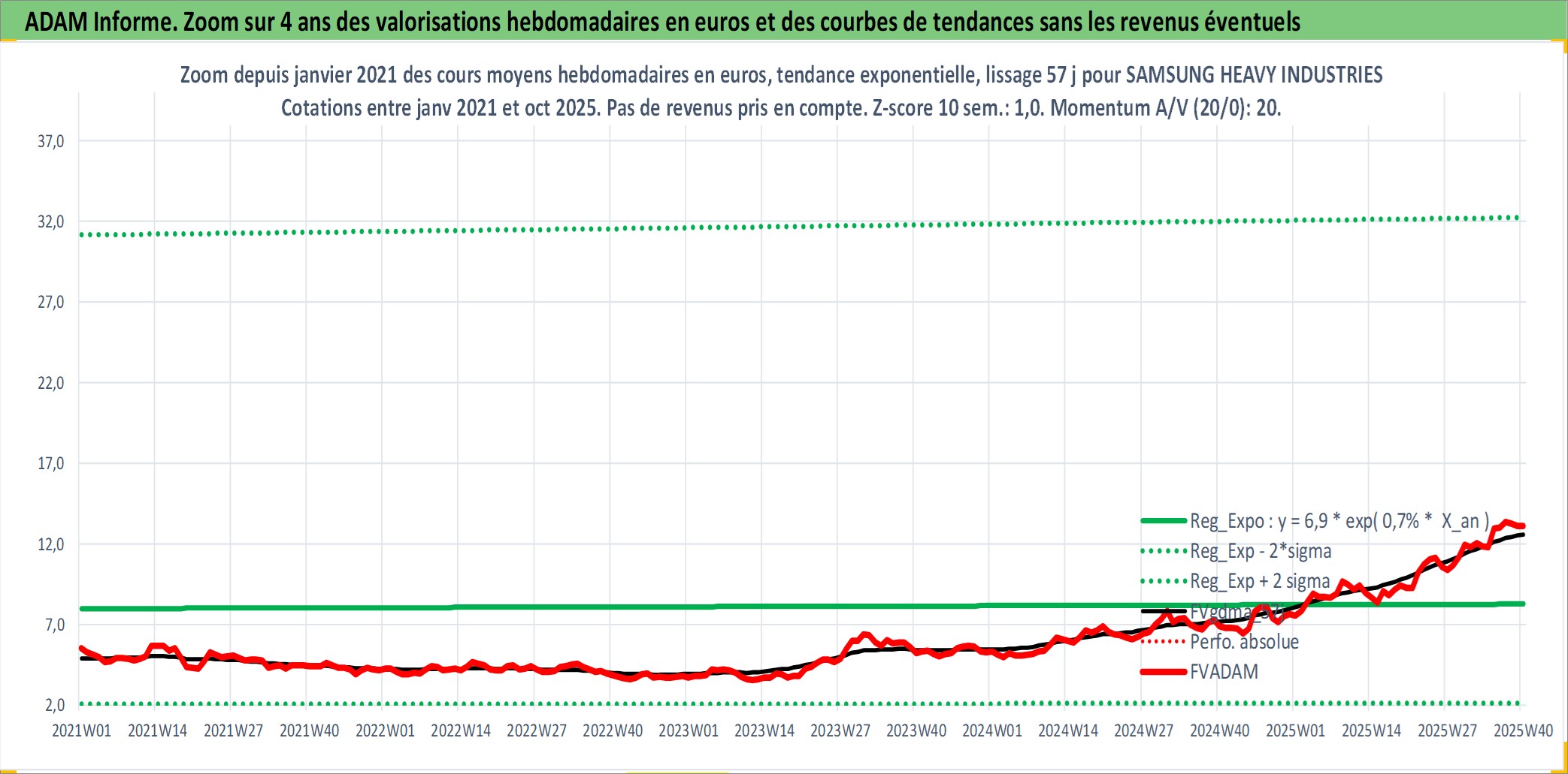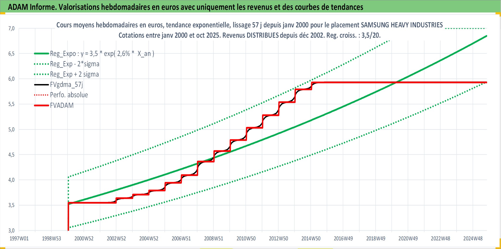 Site dédié aux investisseursPage dédiée sur site financeAnalyse des valorisations hebdomadaires de l'action SAMSUNG HEAVY INDUSTRIES LTD. Cet actif est cote en KRW. Les valorisations sont en contrevaleur EURO et couvrent les semaines 2000W02 a 2025W40. Les revenus de cet actif financier sont pris en compte depuis la semaine 2002W52. La note ESG de cet actif n'est pas connue.