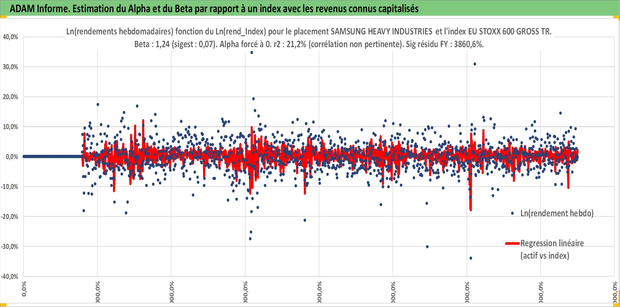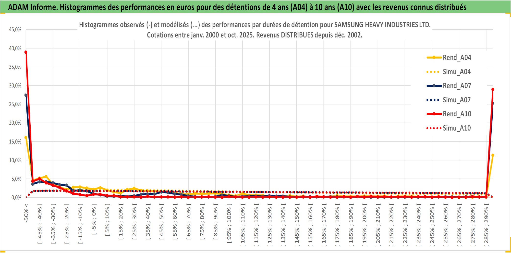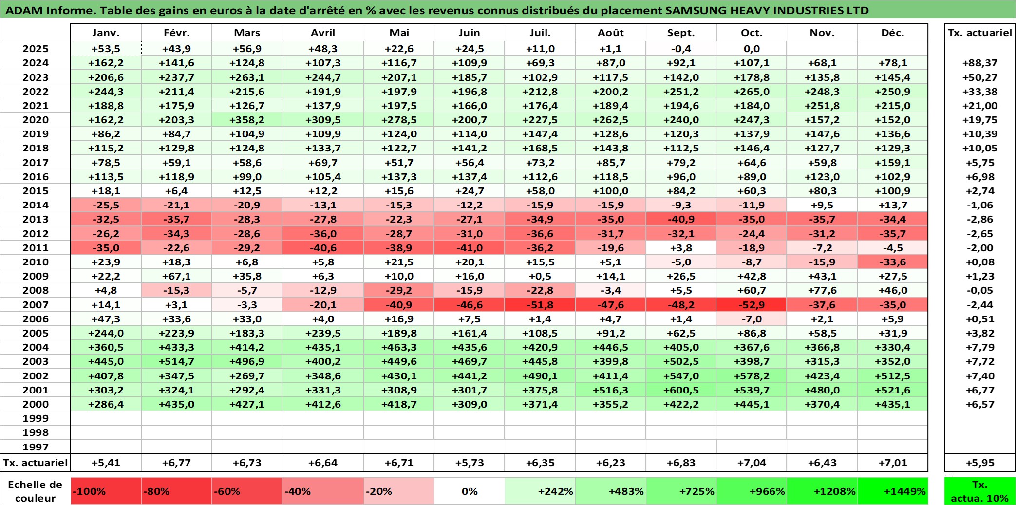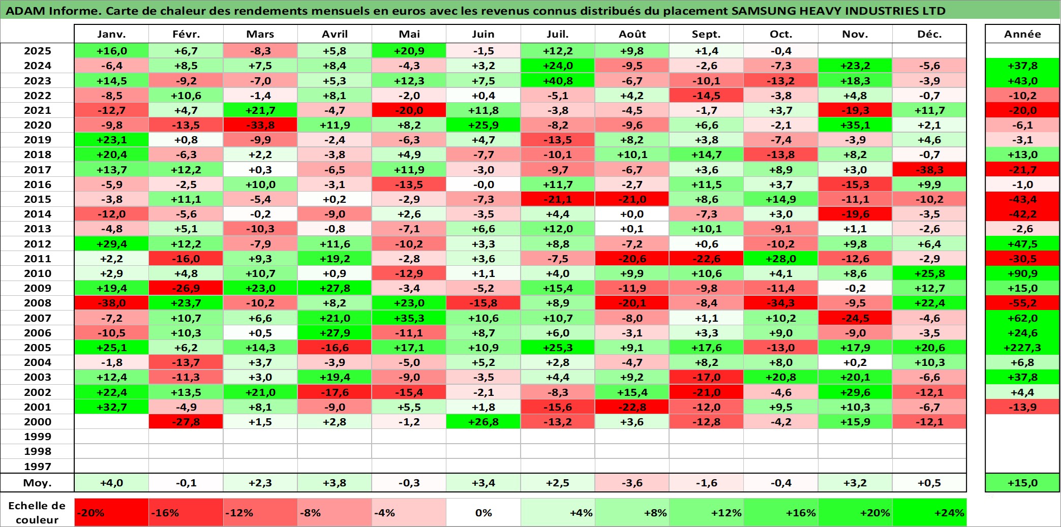 Site dédié aux investisseursPage dédiée sur site financeAnalyse des valorisations hebdomadaires de l'action SAMSUNG HEAVY INDUSTRIES LTD. Cet actif est cote en KRW. Les valorisations sont en contrevaleur EURO et couvrent les semaines 2000W02 a 2025W40. Les revenus de cet actif financier sont pris en compte depuis la semaine 2002W52. La note ESG de cet actif n'est pas connue.
