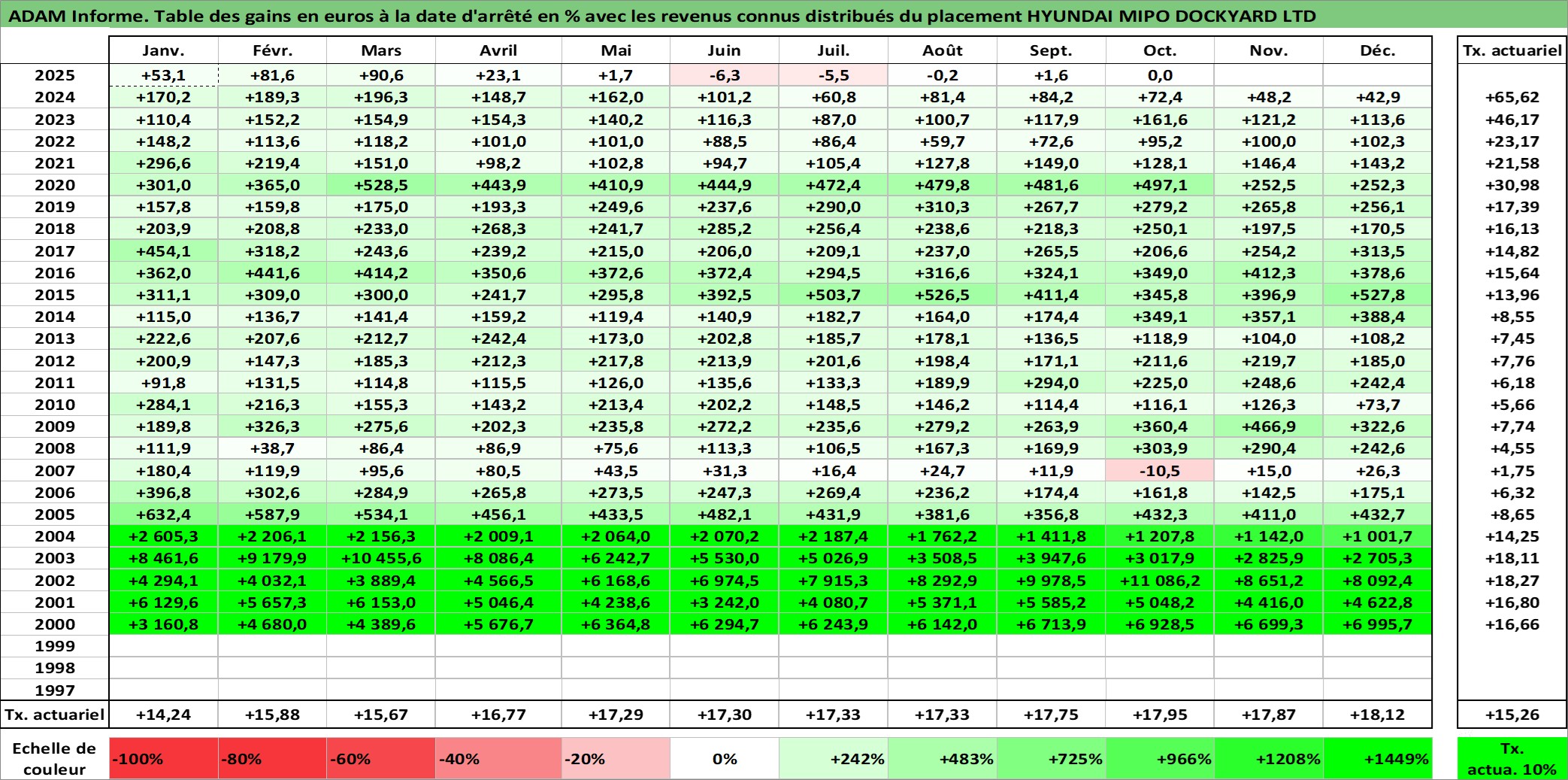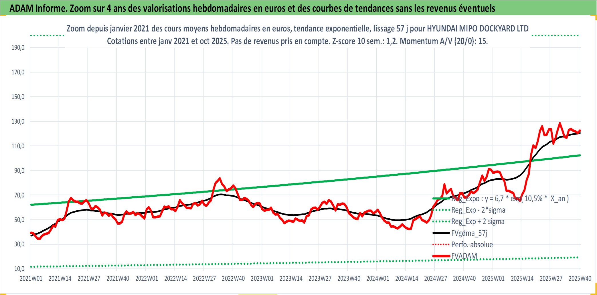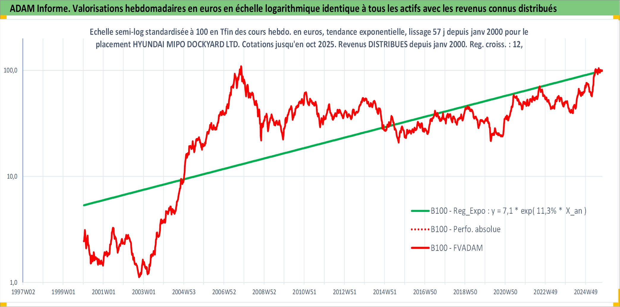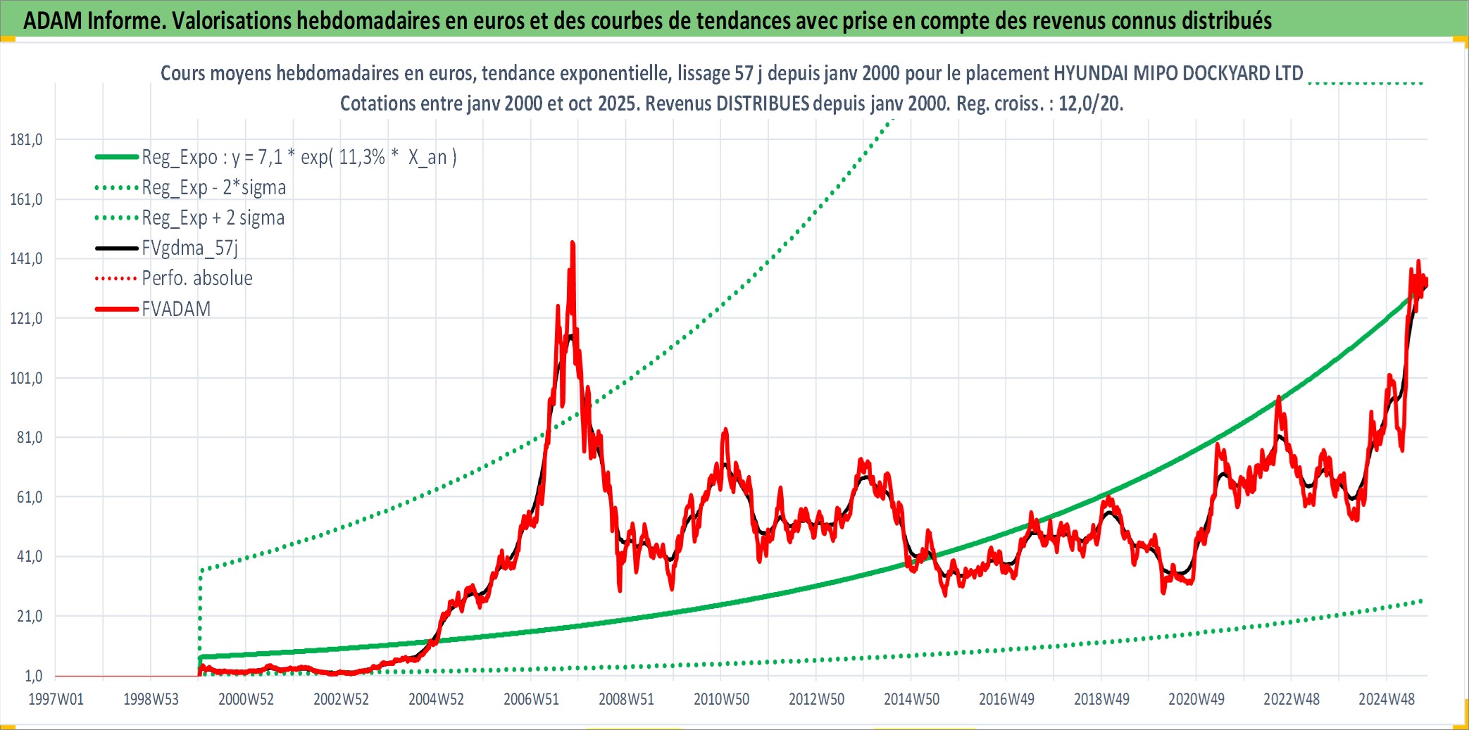 Site dédié aux investisseursPage dédiée sur site financeAnalyse des valorisations hebdomadaires de l'action HYUNDAI MIPO DOCKYARD LTD. Cet actif est cote en KRW. Les valorisations sont en contrevaleur EURO et couvrent les semaines 2000W02 a 2025W40. Les revenus de cet actif financier sont pris en compte depuis la semaine 2000W01. La note ESG de cet actif n'est pas connue.
