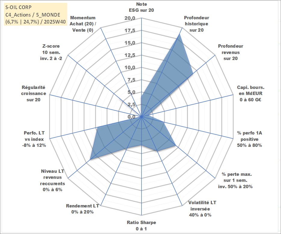 Site dédié aux investisseursPage dédiée sur site financeAnalyse des valorisations hebdomadaires de l'action S-OIL CORP. Cet actif est cote en KRW. Les valorisations sont en contrevaleur EURO et couvrent les semaines 2000W02 a 2025W40. Les revenus de cet actif financier sont pris en compte depuis la semaine 2006W26. La note globale ESG de cet actif est estimee a 4.0 (apres rebasage entre 0 et 20).