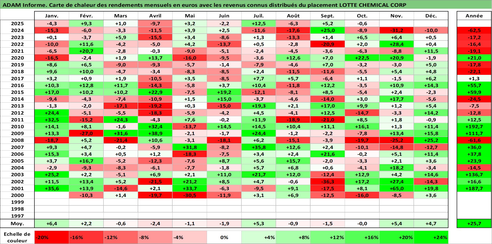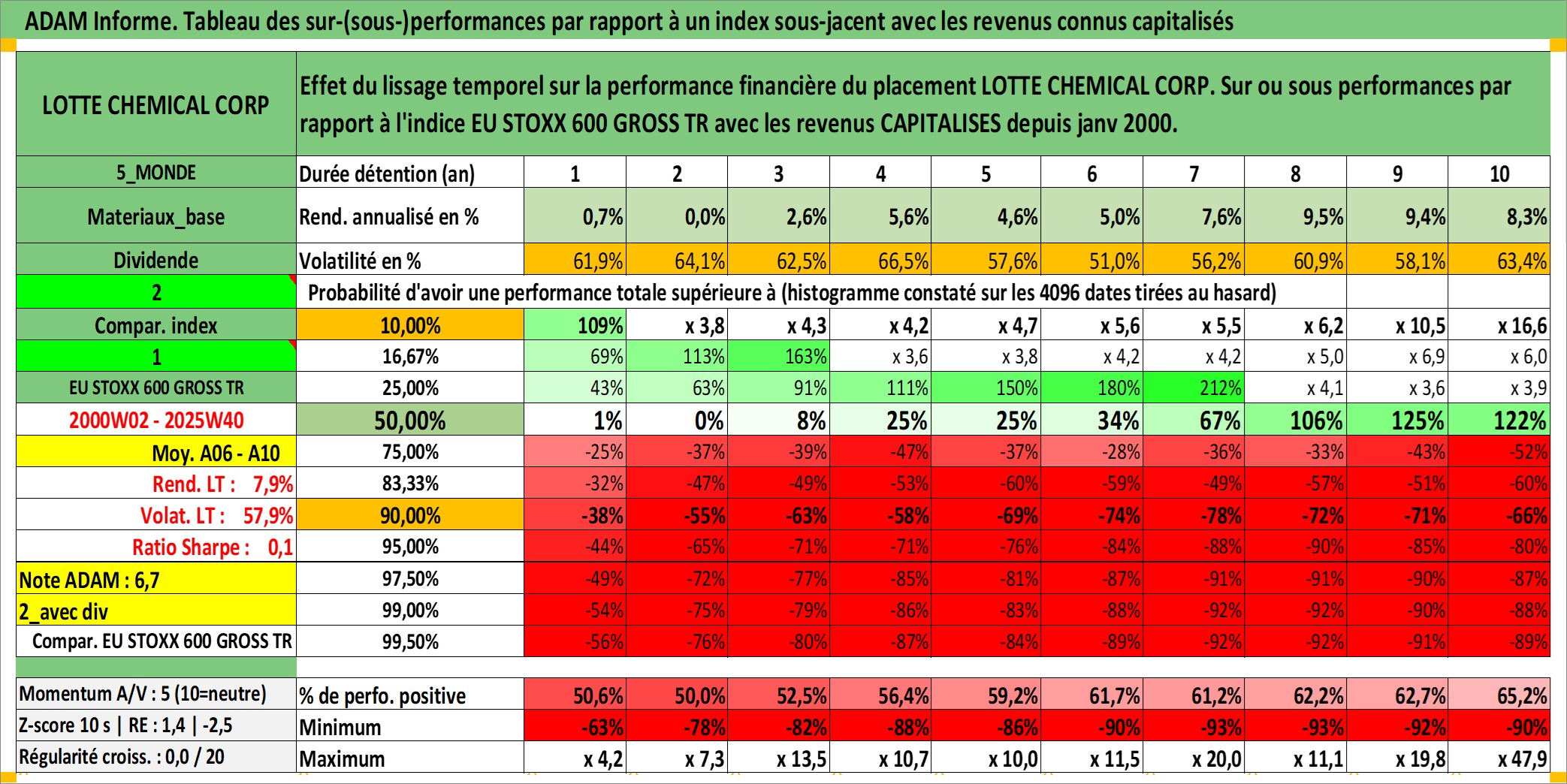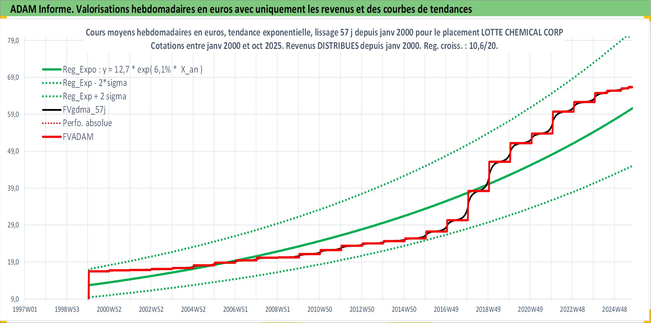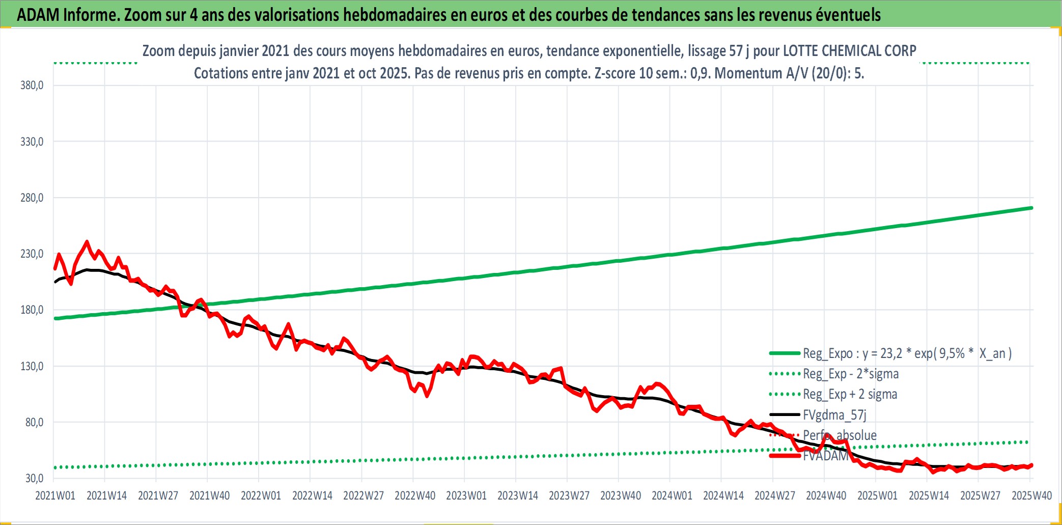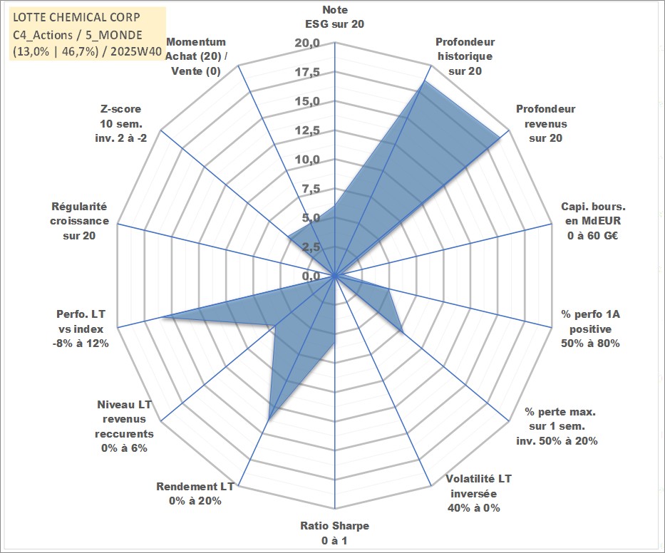 Site dédié aux investisseursPage dédiée sur site financeAnalyse des valorisations hebdomadaires de l'action LOTTE CHEMICAL CORP. Cet actif est cote en KRW. Les valorisations sont en contrevaleur EURO et couvrent les semaines 2000W02 a 2025W40. Les revenus de cet actif financier sont pris en compte depuis la semaine 2000W01. La note globale ESG de cet actif est estimee a 6.0 (apres rebasage entre 0 et 20).