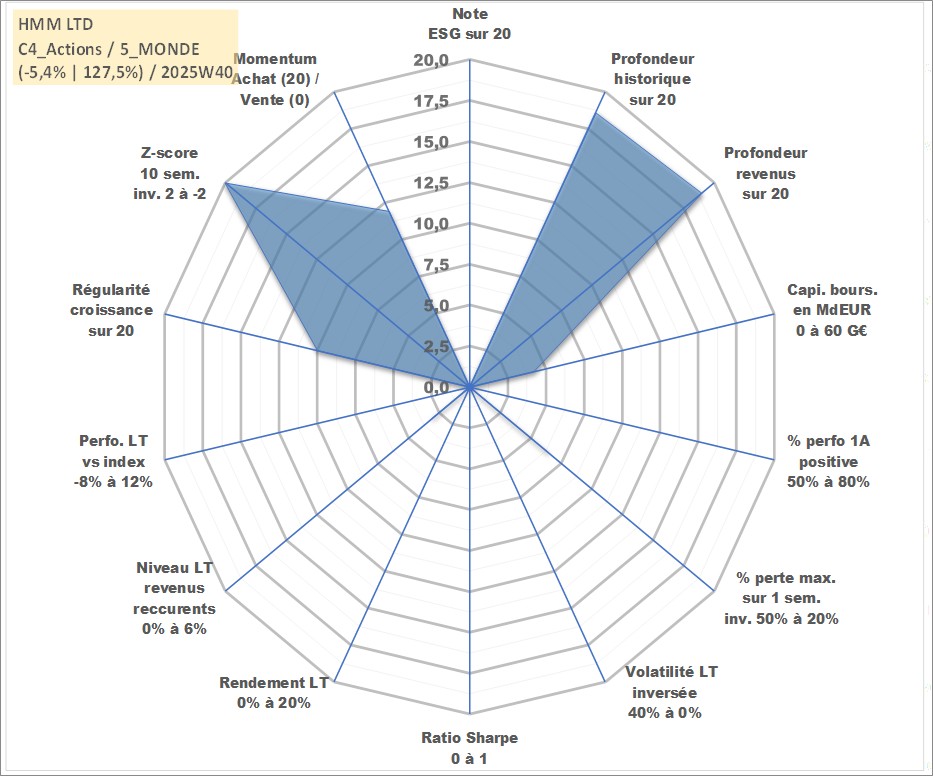 Site dédié aux investisseursPage dédiée sur site financeAnalyse des valorisations hebdomadaires de l'action HMM LTD. Cet actif est cote en KRW. Les valorisations sont en contrevaleur EURO et couvrent les semaines 2000W02 a 2025W40. Les revenus de cet actif financier sont pris en compte depuis la semaine 2000W01. La note ESG de cet actif n'est pas connue.