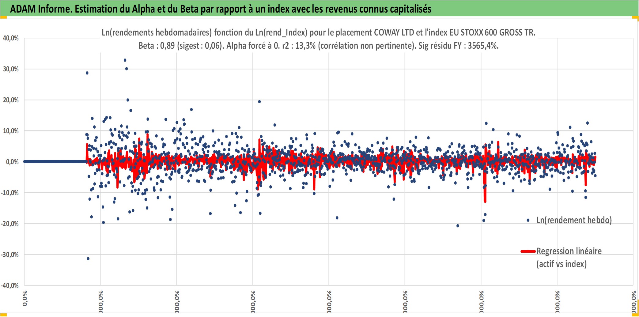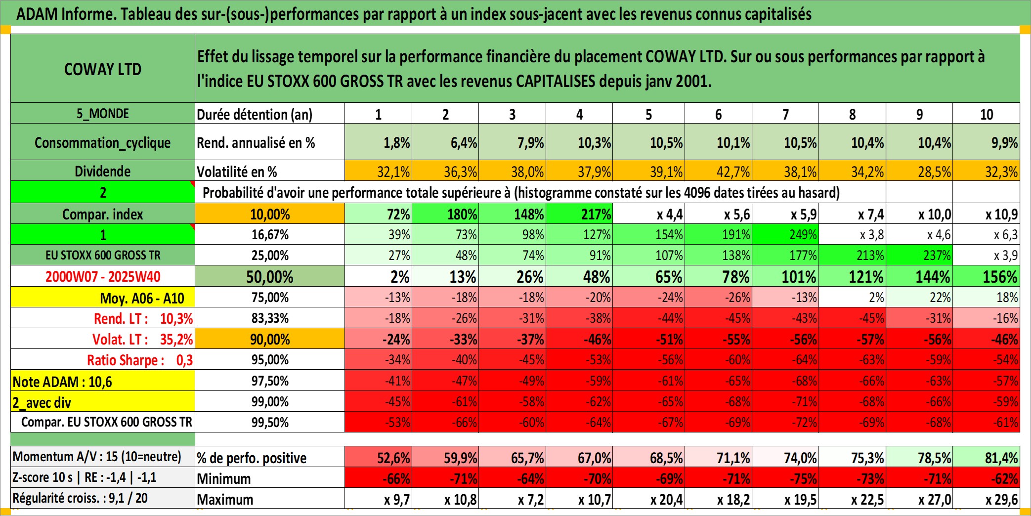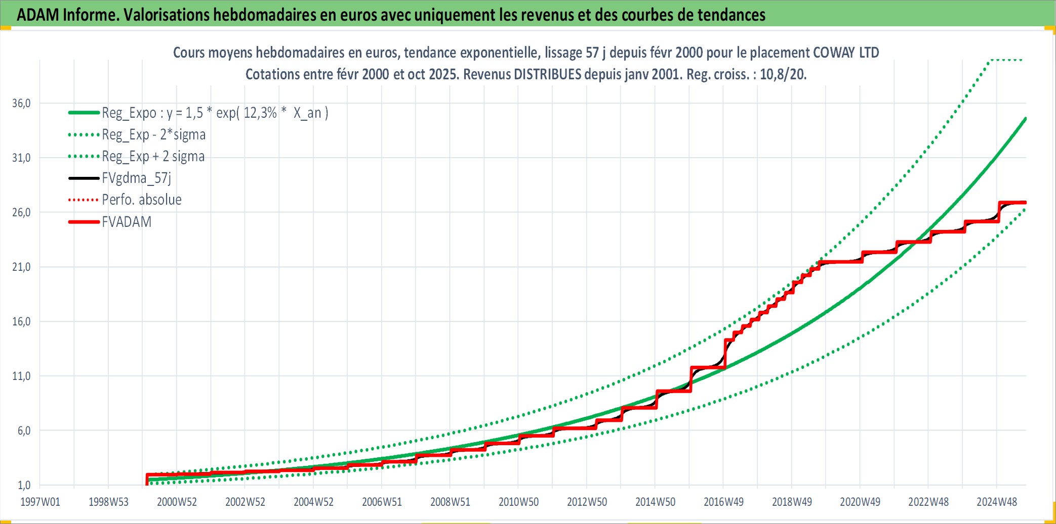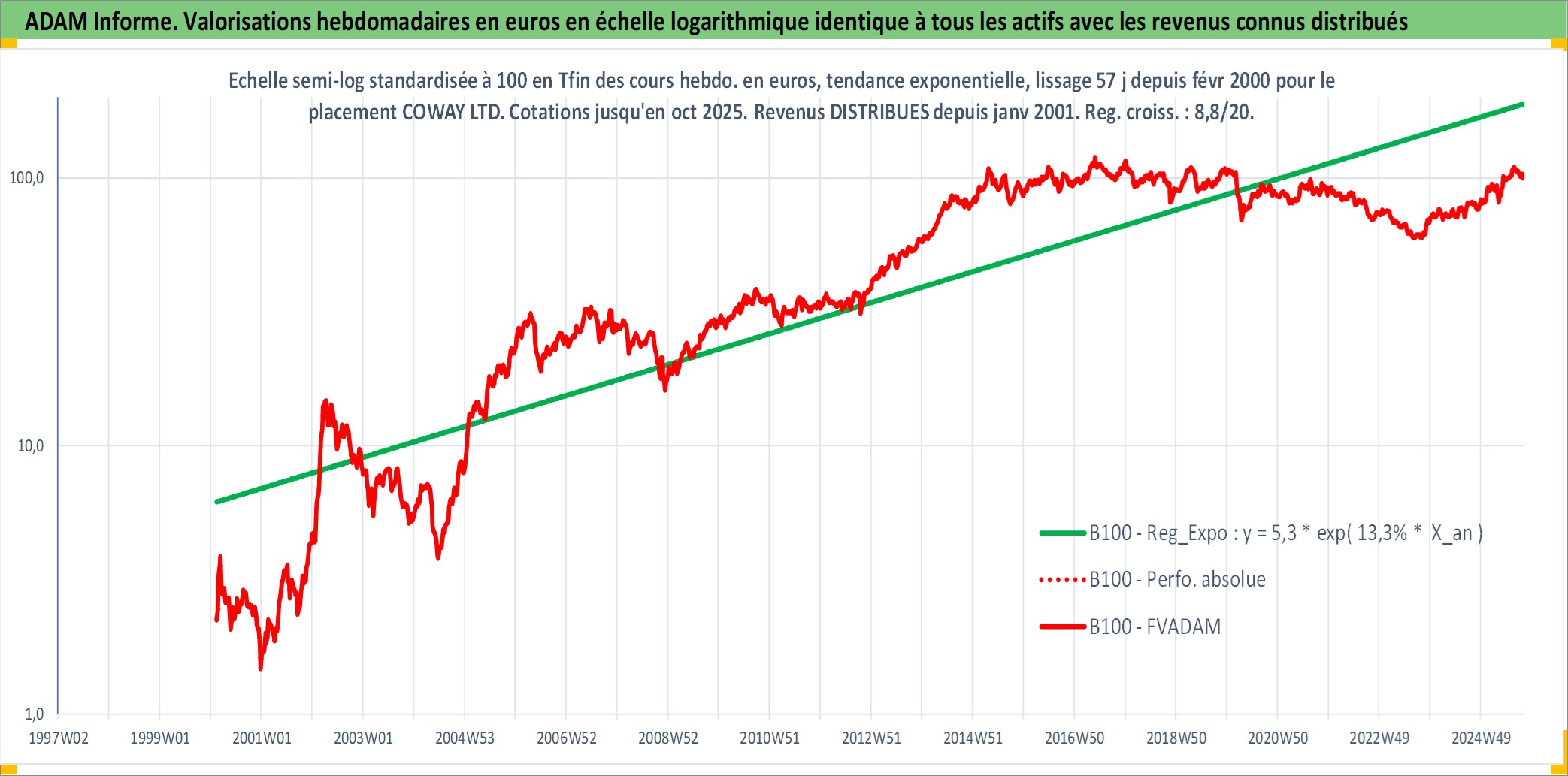 Site dédié aux investisseursPage dédiée sur site financeAnalyse des valorisations hebdomadaires de l'action COWAY LTD. Cet actif est cote en KRW. Les valorisations sont en contrevaleur EURO et couvrent les semaines 2000W07 a 2025W40. Les revenus de cet actif financier sont pris en compte depuis la semaine 2001W01. La note globale ESG de cet actif est estimee a 12.0 (apres rebasage entre 0 et 20).