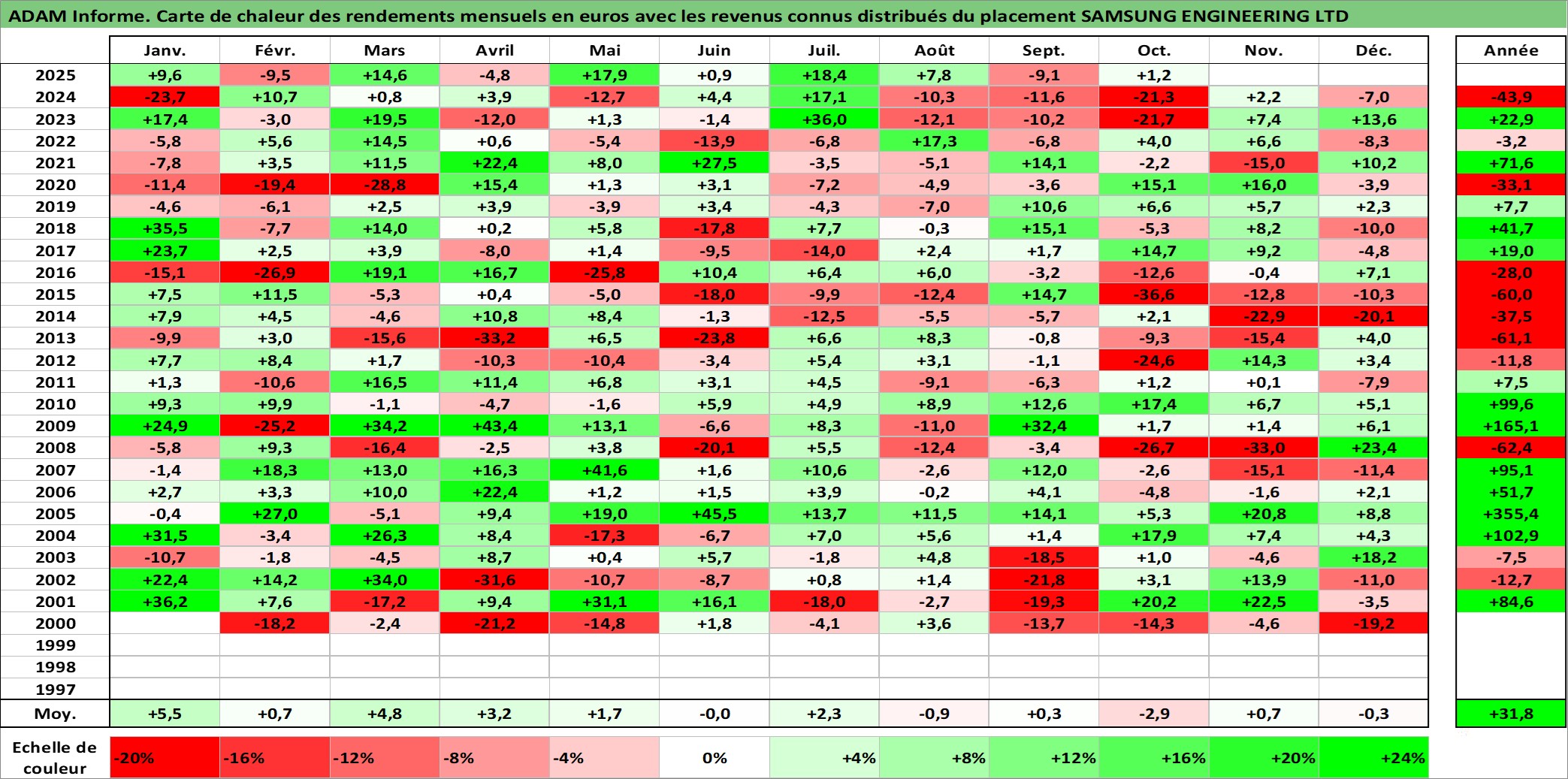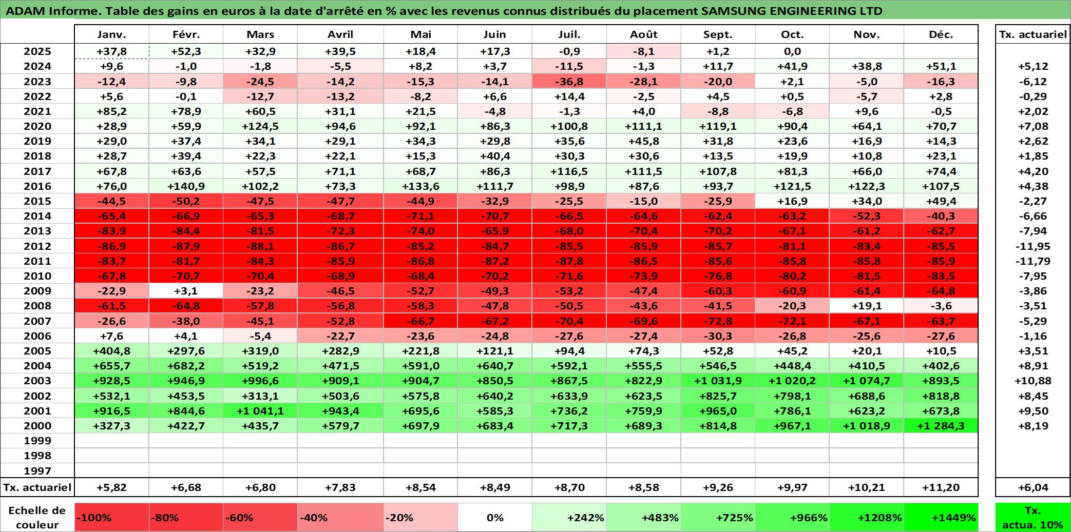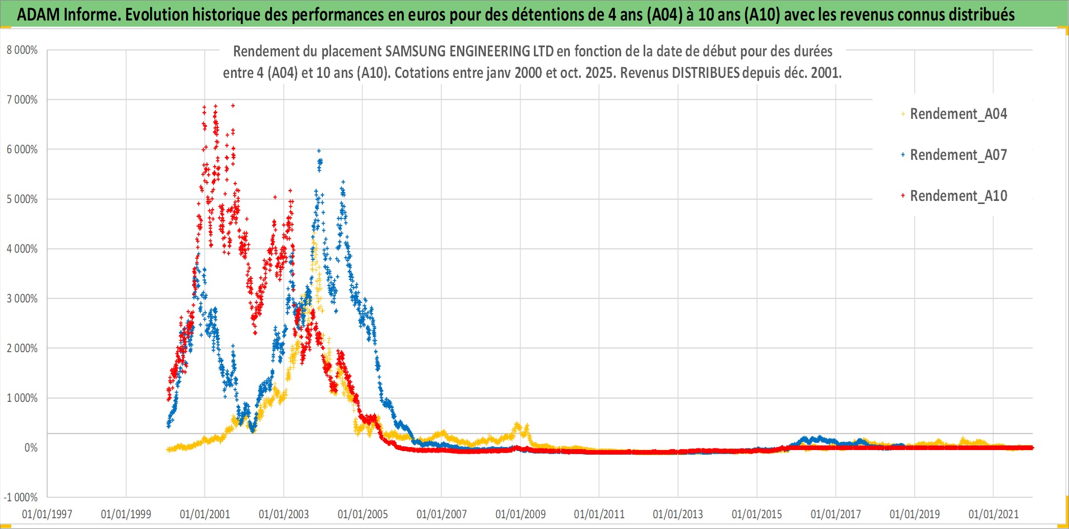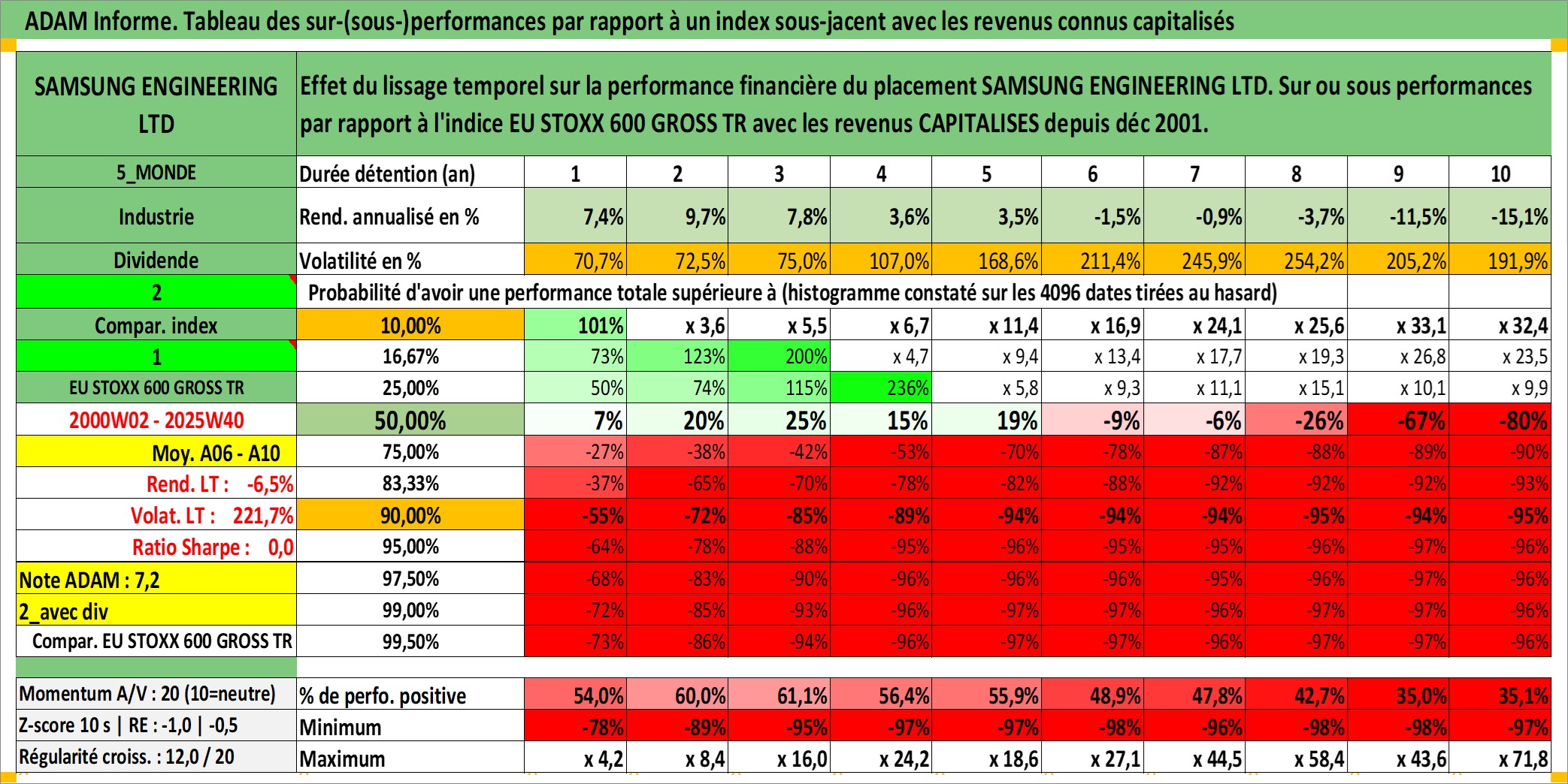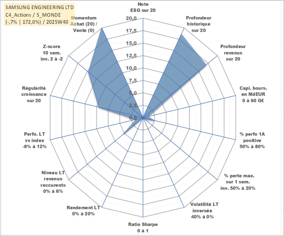 Site dédié aux investisseursPage dédiée sur site financeAnalyse des valorisations hebdomadaires de l'action SAMSUNG ENGINEERING LTD. Cet actif est cote en KRW. Les valorisations sont en contrevaleur EURO et couvrent les semaines 2000W02 a 2025W40. Les revenus de cet actif financier sont pris en compte depuis la semaine 2001W52. La note ESG de cet actif n'est pas connue.