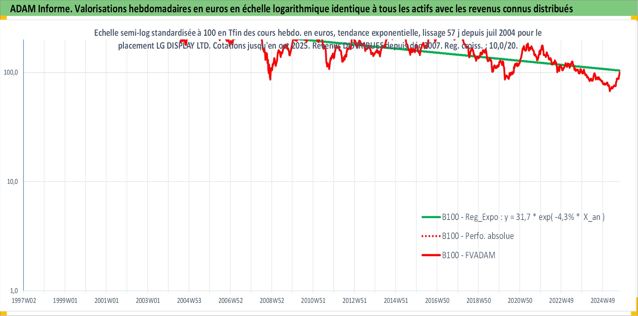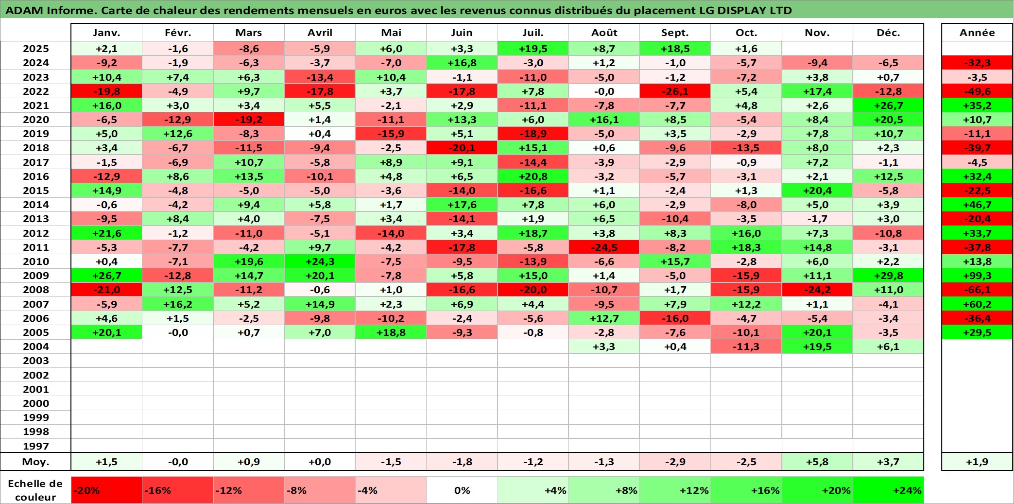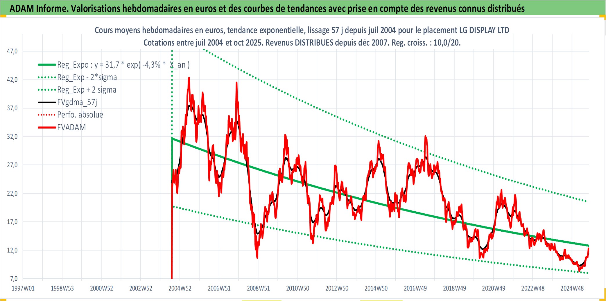 Site dédié aux investisseursPage dédiée sur site financeAnalyse des valorisations hebdomadaires de l'action LG DISPLAY LTD. Cet actif est cote en KRW. Les valorisations sont en contrevaleur EURO et couvrent les semaines 2004W31 a 2025W40. Les revenus de cet actif financier sont pris en compte depuis la semaine 2007W52. La note globale ESG de cet actif est estimee a 11.0 (apres rebasage entre 0 et 20).