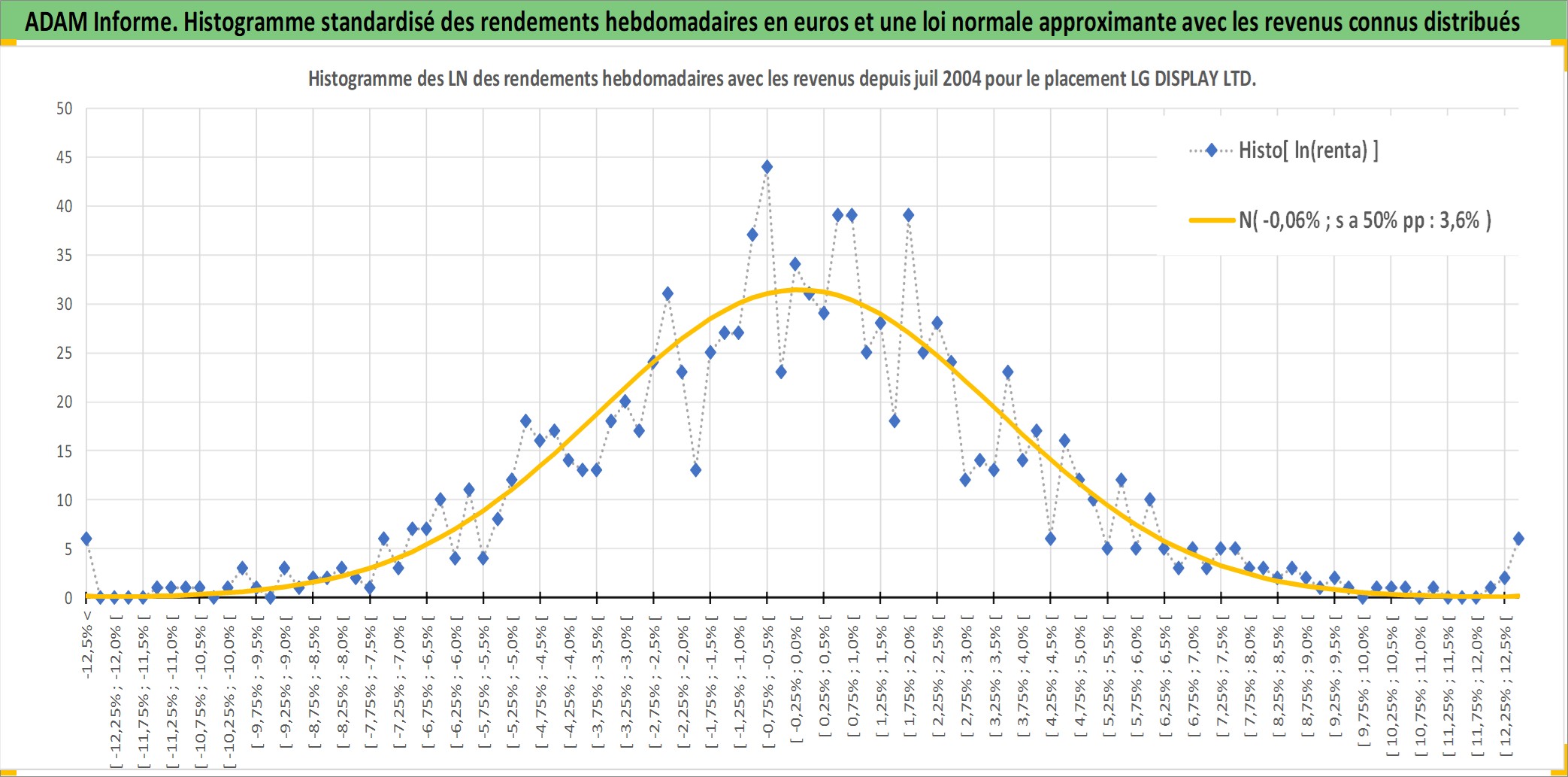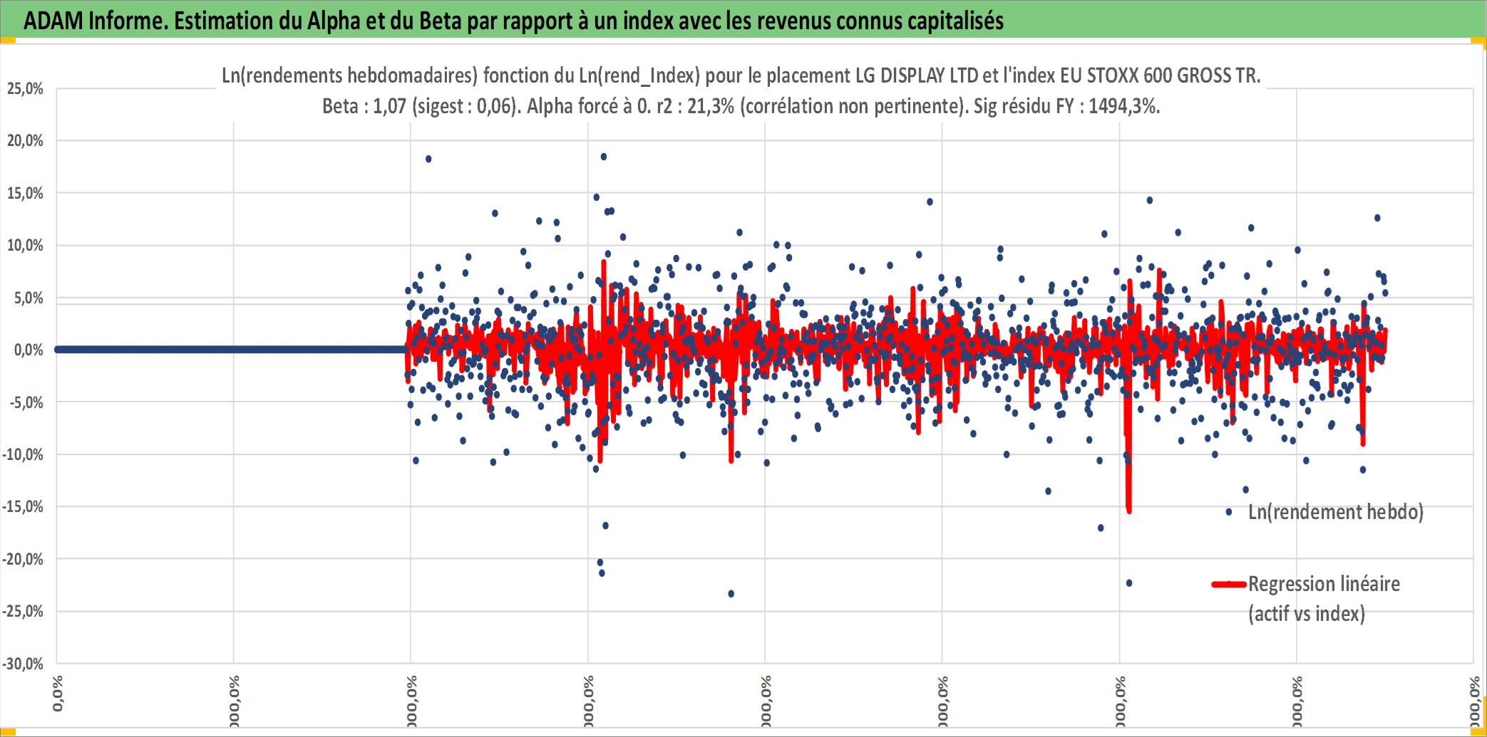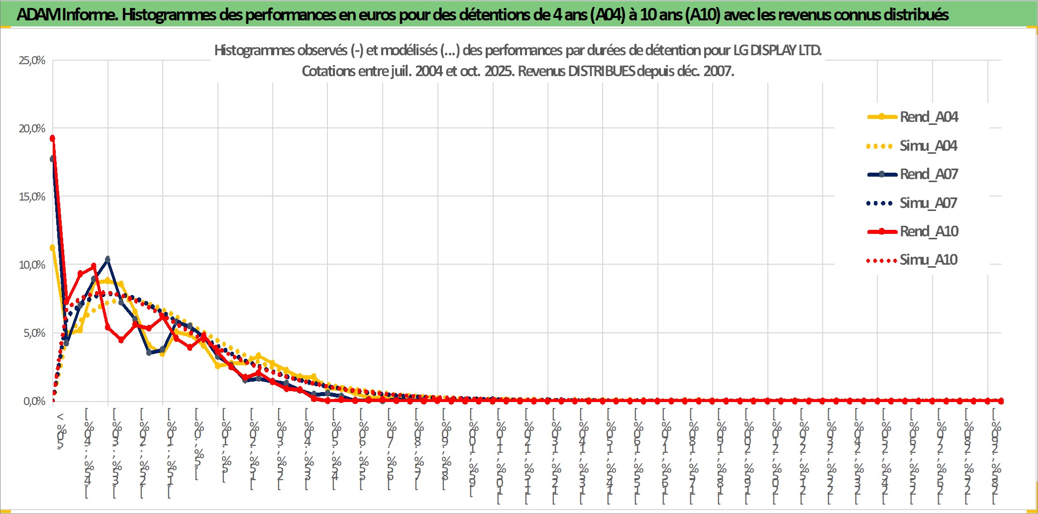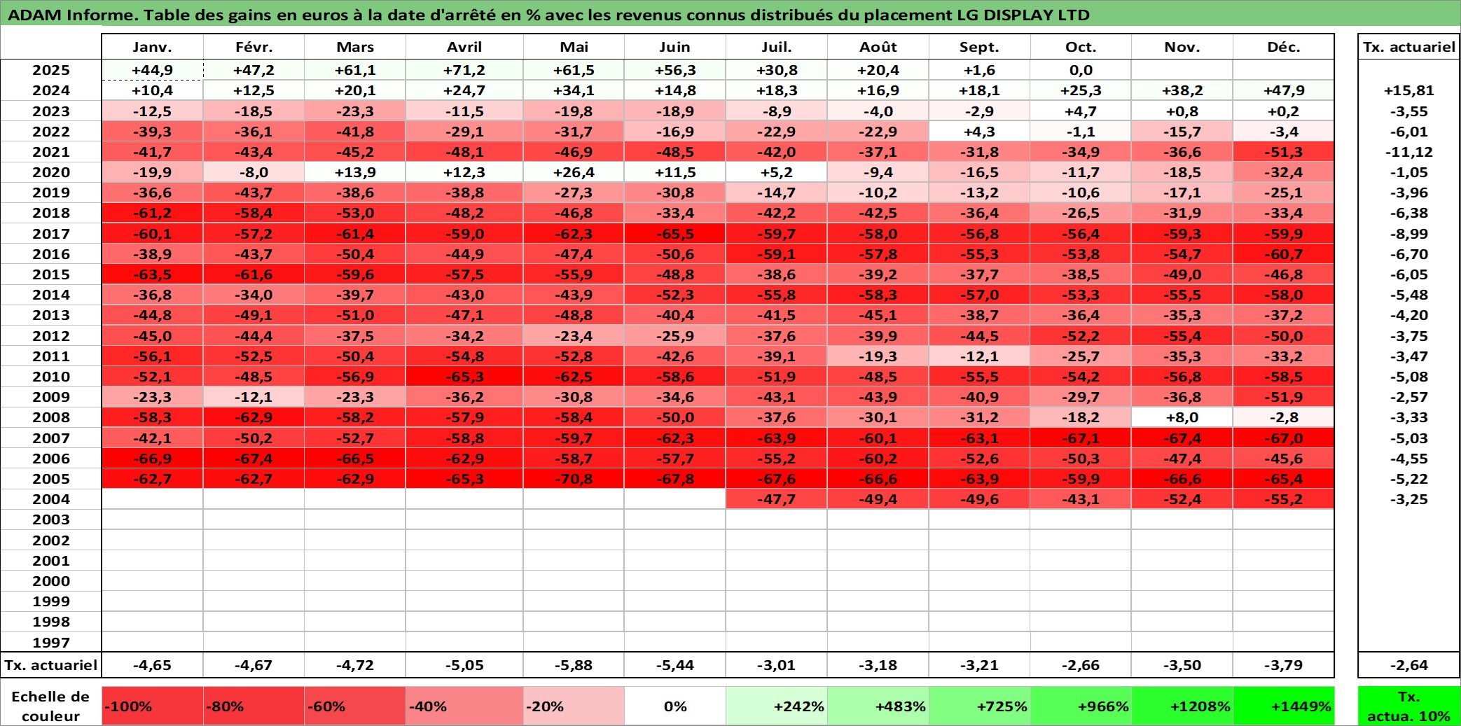 Site dédié aux investisseursPage dédiée sur site financeAnalyse des valorisations hebdomadaires de l'action LG DISPLAY LTD. Cet actif est cote en KRW. Les valorisations sont en contrevaleur EURO et couvrent les semaines 2004W31 a 2025W40. Les revenus de cet actif financier sont pris en compte depuis la semaine 2007W52. La note globale ESG de cet actif est estimee a 11.0 (apres rebasage entre 0 et 20).