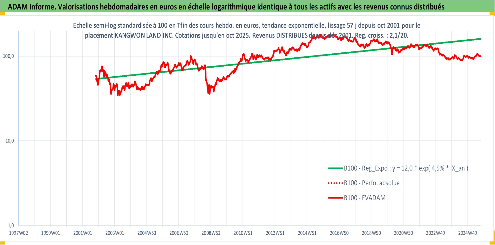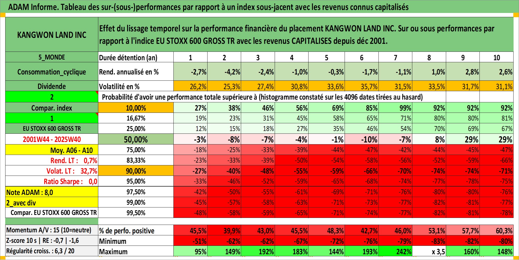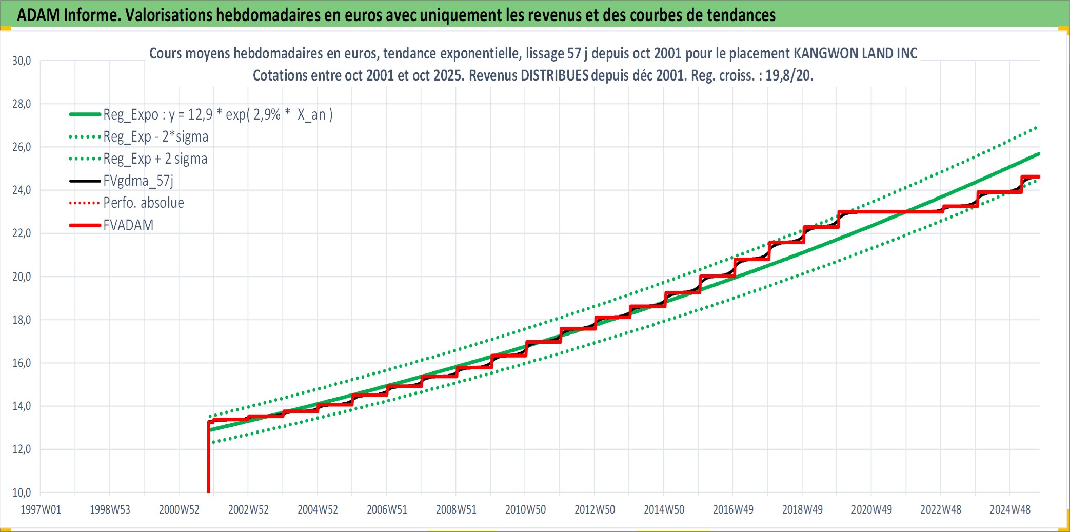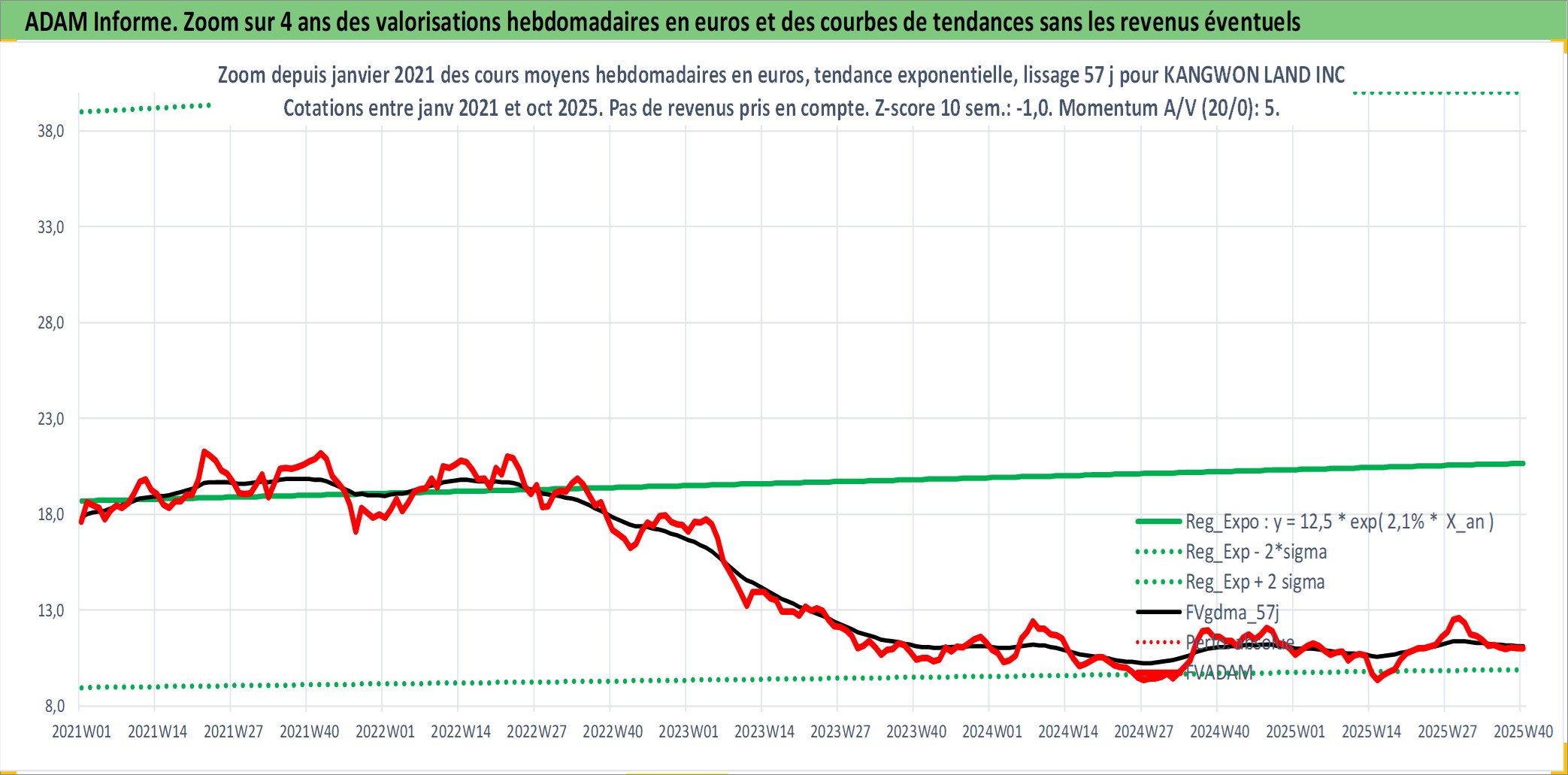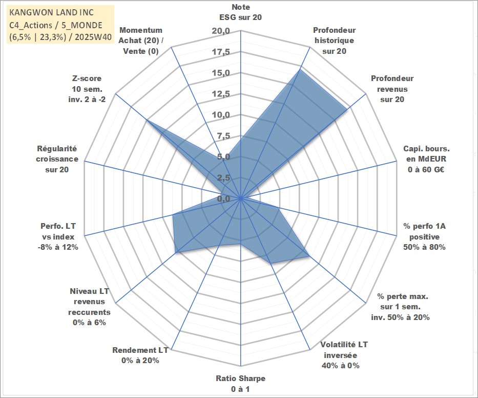 Site dédié aux investisseursPage dédiée sur site financeAnalyse des valorisations hebdomadaires de l'action KANGWON LAND INC. Cet actif est cote en KRW. Les valorisations sont en contrevaleur EURO et couvrent les semaines 2001W44 a 2025W40. Les revenus de cet actif financier sont pris en compte depuis la semaine 2001W52. La note globale ESG de cet actif est estimee a 7.0 (apres rebasage entre 0 et 20).
