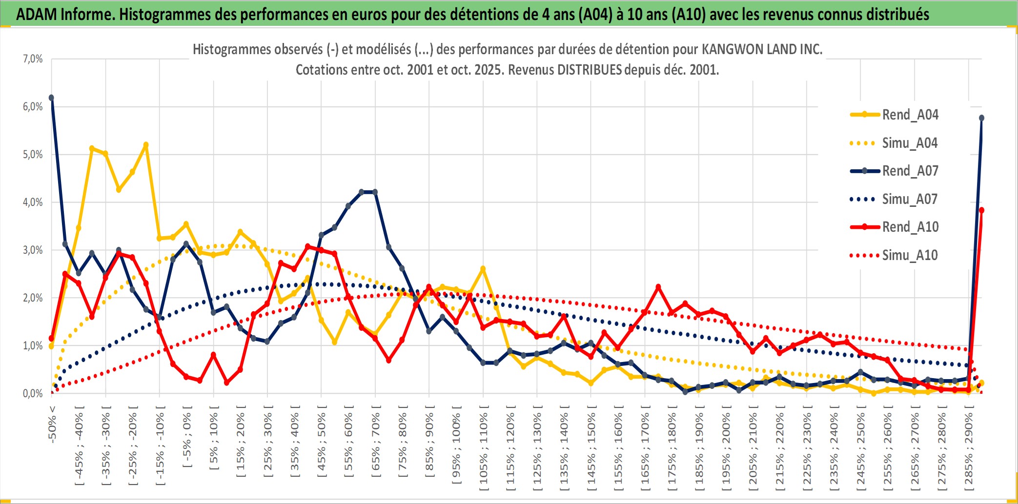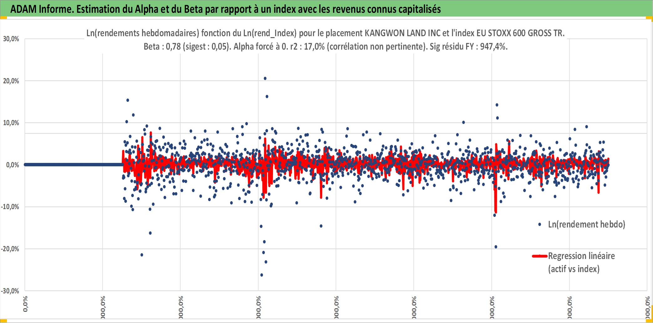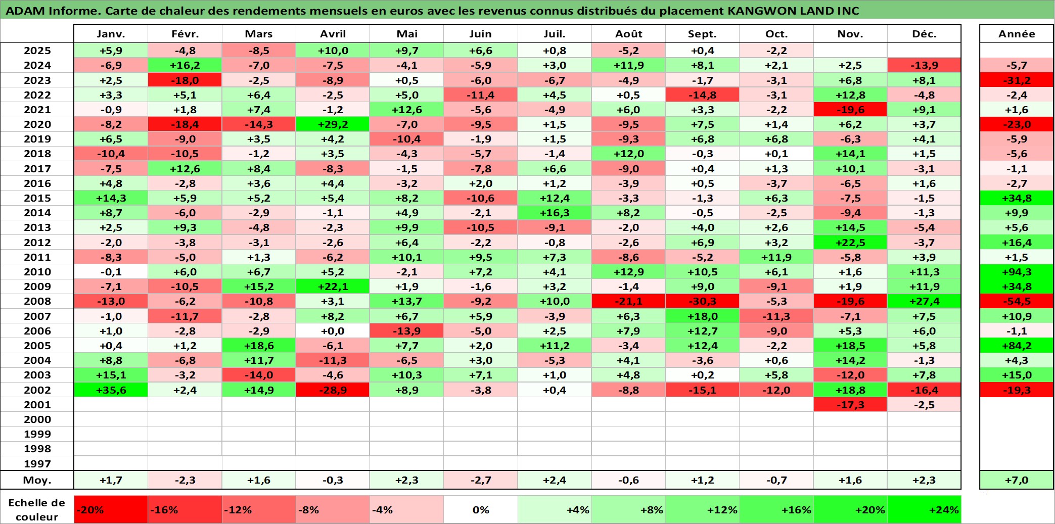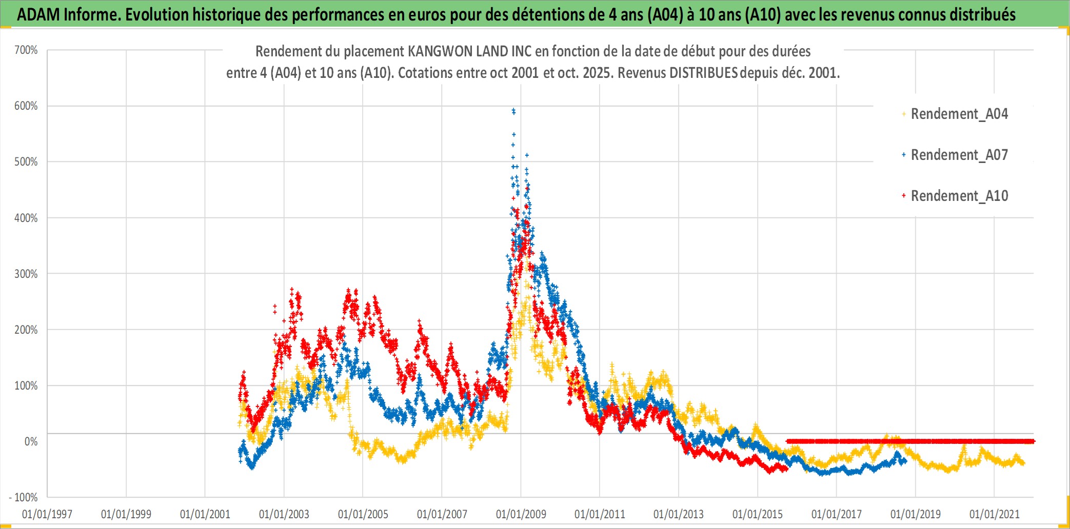 Site dédié aux investisseursPage dédiée sur site financeAnalyse des valorisations hebdomadaires de l'action KANGWON LAND INC. Cet actif est cote en KRW. Les valorisations sont en contrevaleur EURO et couvrent les semaines 2001W44 a 2025W40. Les revenus de cet actif financier sont pris en compte depuis la semaine 2001W52. La note globale ESG de cet actif est estimee a 7.0 (apres rebasage entre 0 et 20).