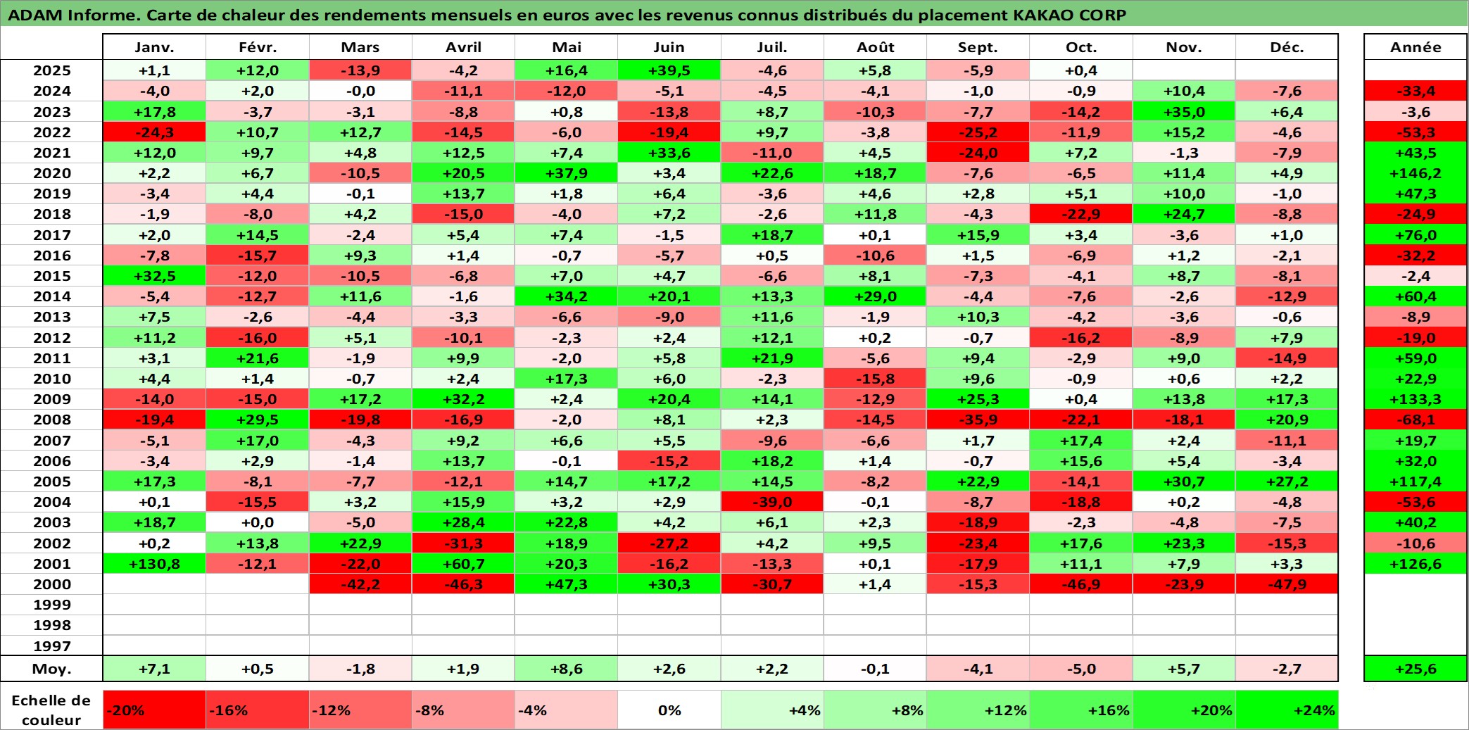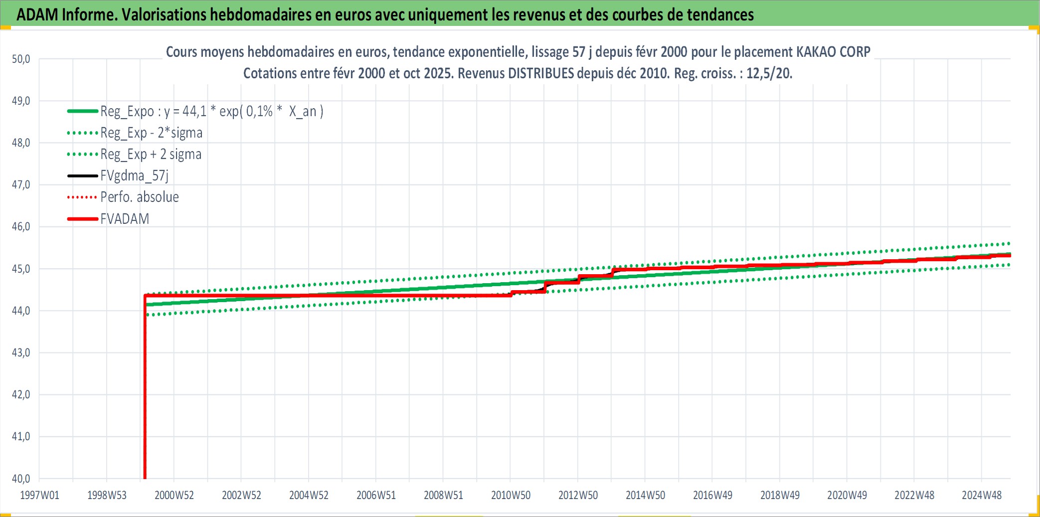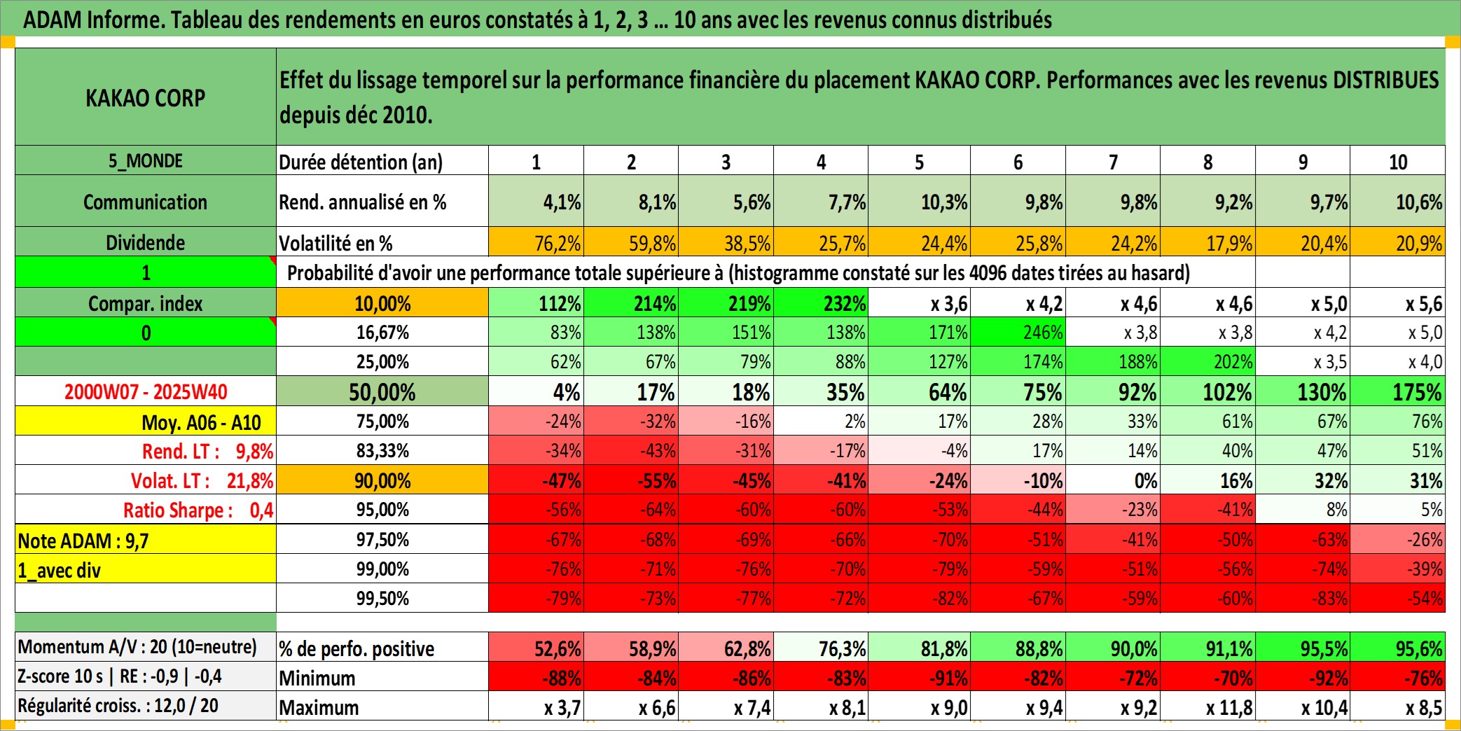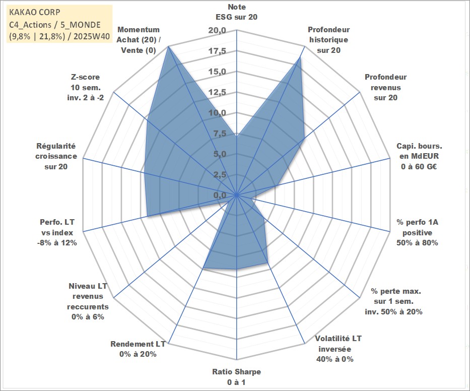 Site dédié aux investisseursPage dédiée sur site financeAnalyse des valorisations hebdomadaires de l'action KAKAO CORP. Cet actif est cote en KRW. Les valorisations sont en contrevaleur EURO et couvrent les semaines 2000W07 a 2025W40. Les revenus de cet actif financier sont pris en compte depuis la semaine 2010W52. La note globale ESG de cet actif est estimee a 7.0 (apres rebasage entre 0 et 20).